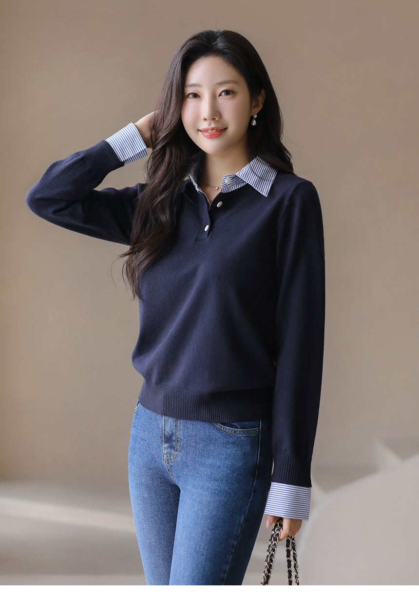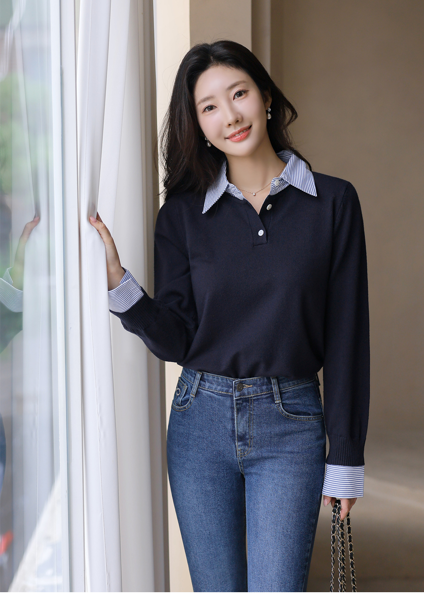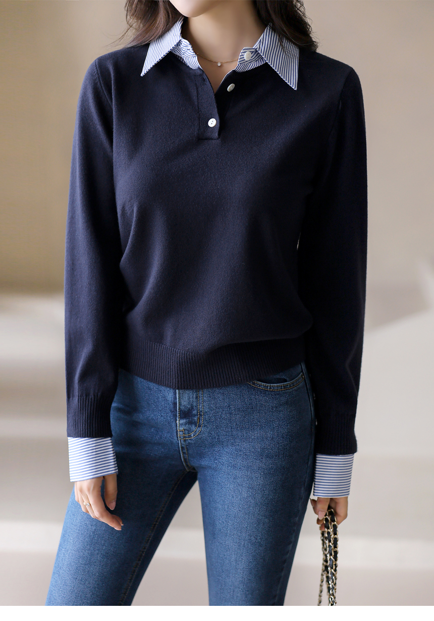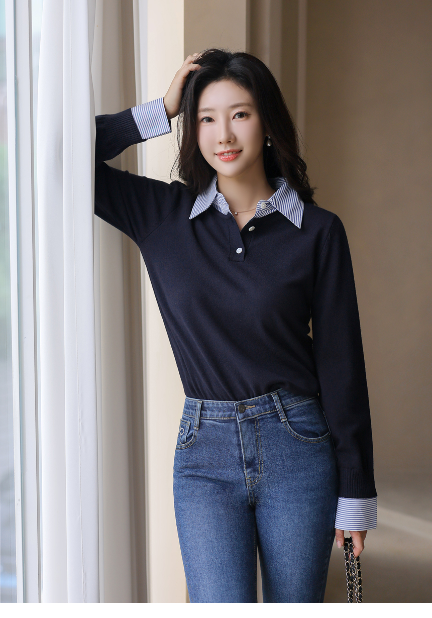 [Chic knit with striped shirt collar and cuffs, offering a layered look. Soft stretch fabric ensures comfort and everyday elegance.]