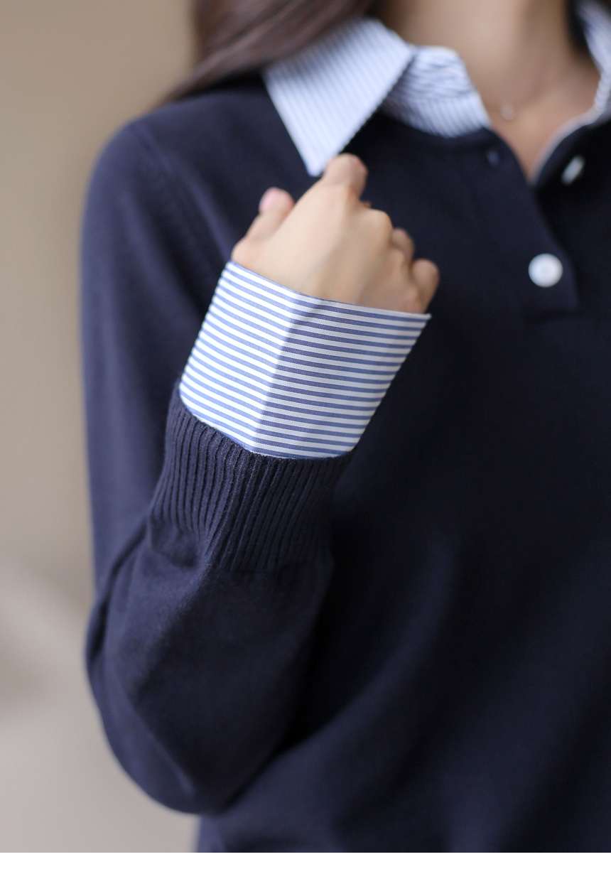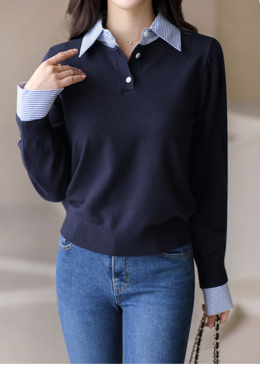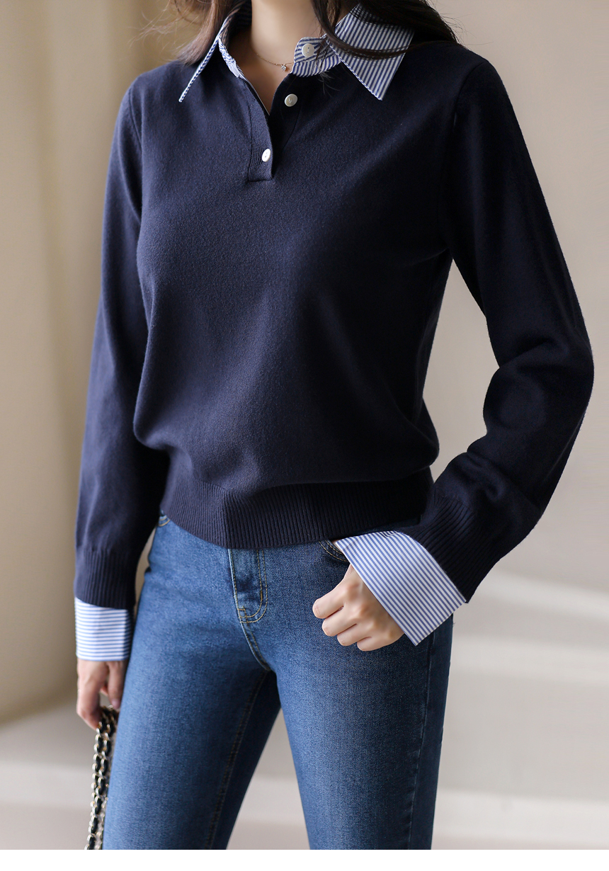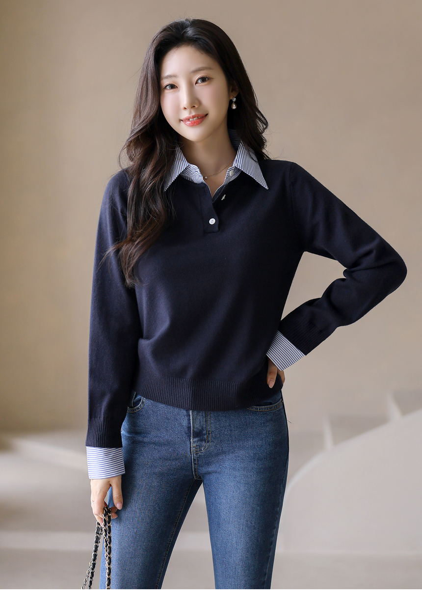 [Chic knit with striped shirt collar and cuffs, offering a layered look. Soft stretch fabric ensures comfort and everyday elegance.]