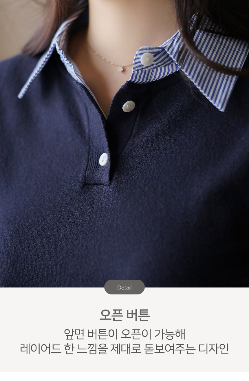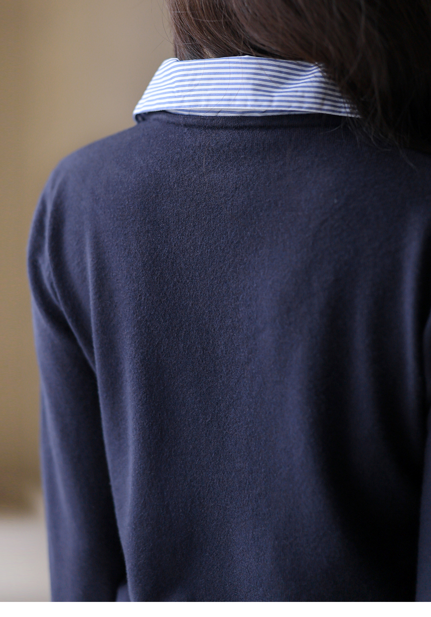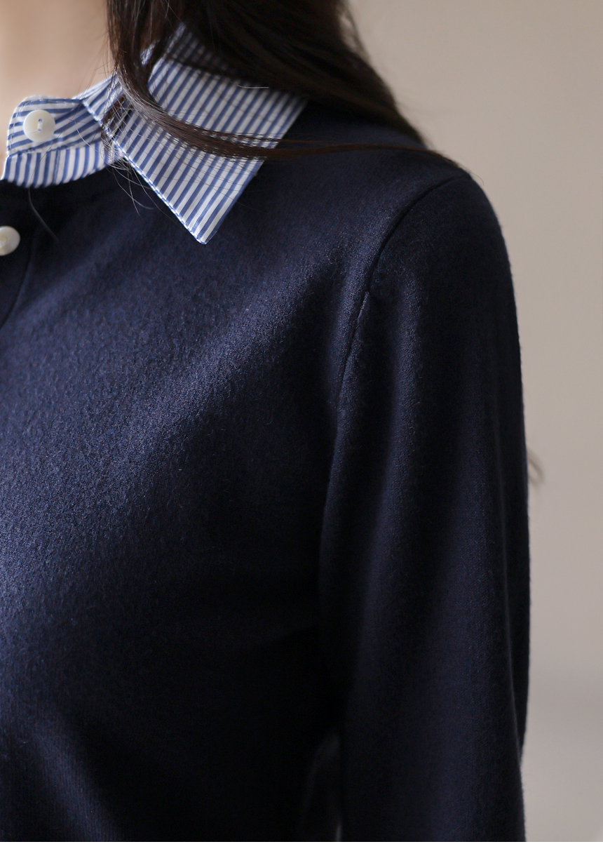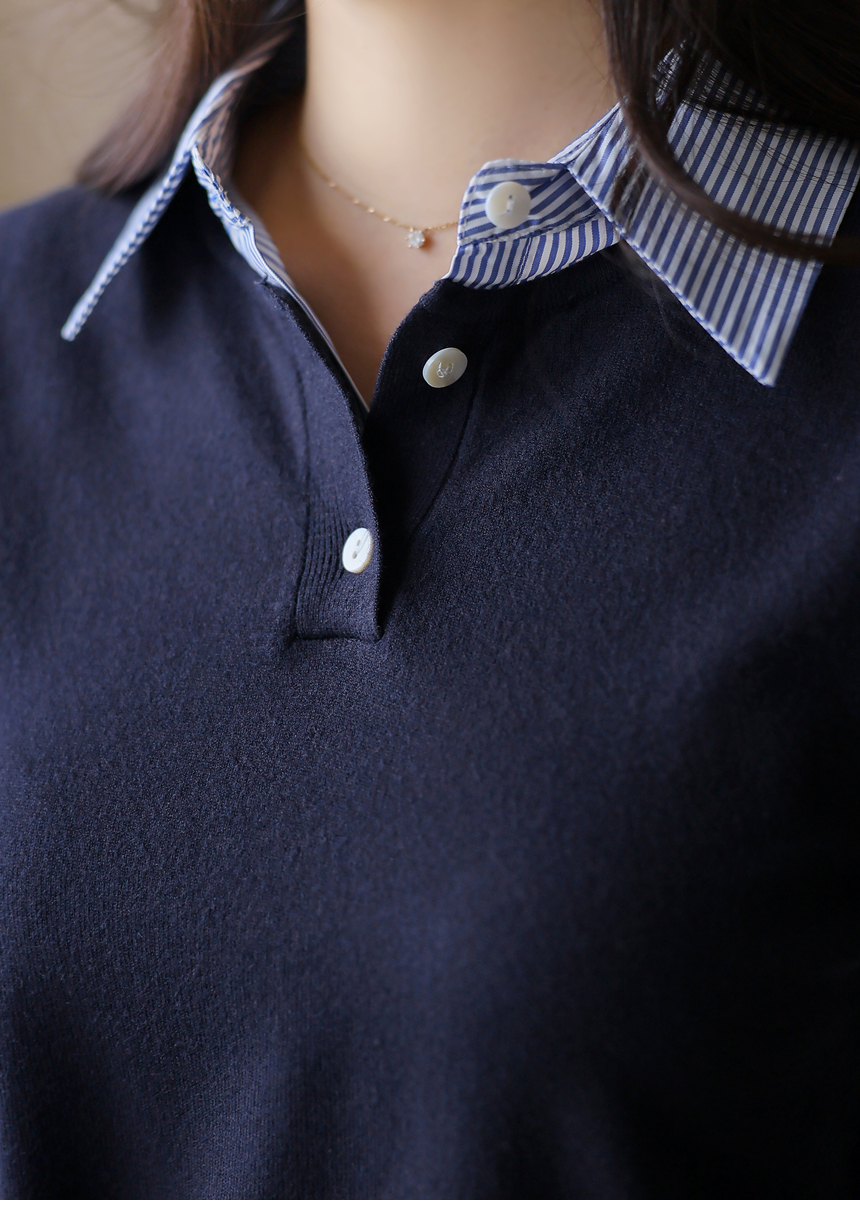 [Chic knit with striped shirt collar and cuffs, offering a layered look. Soft stretch fabric ensures comfort and everyday elegance.]