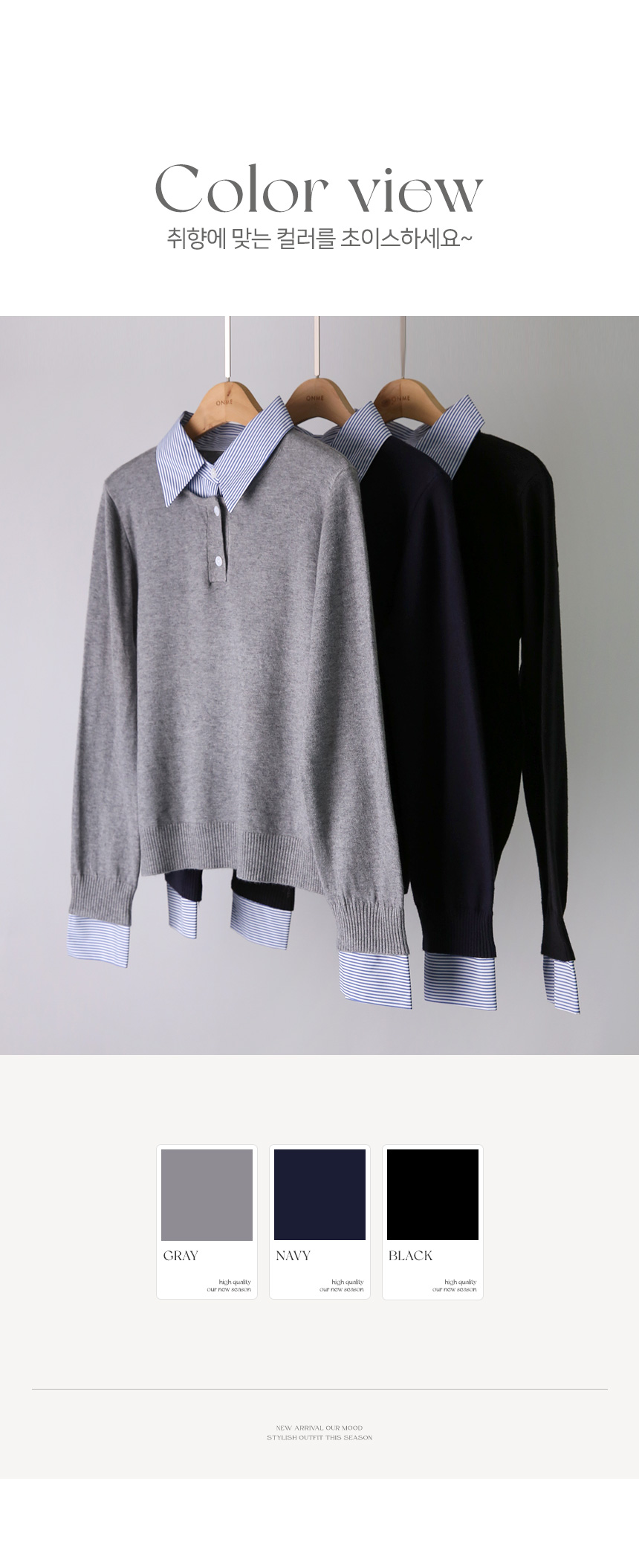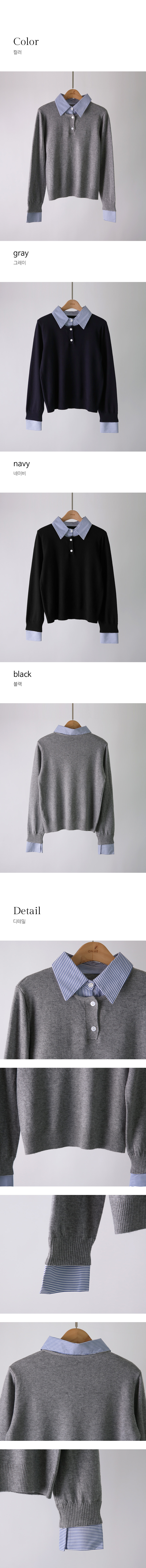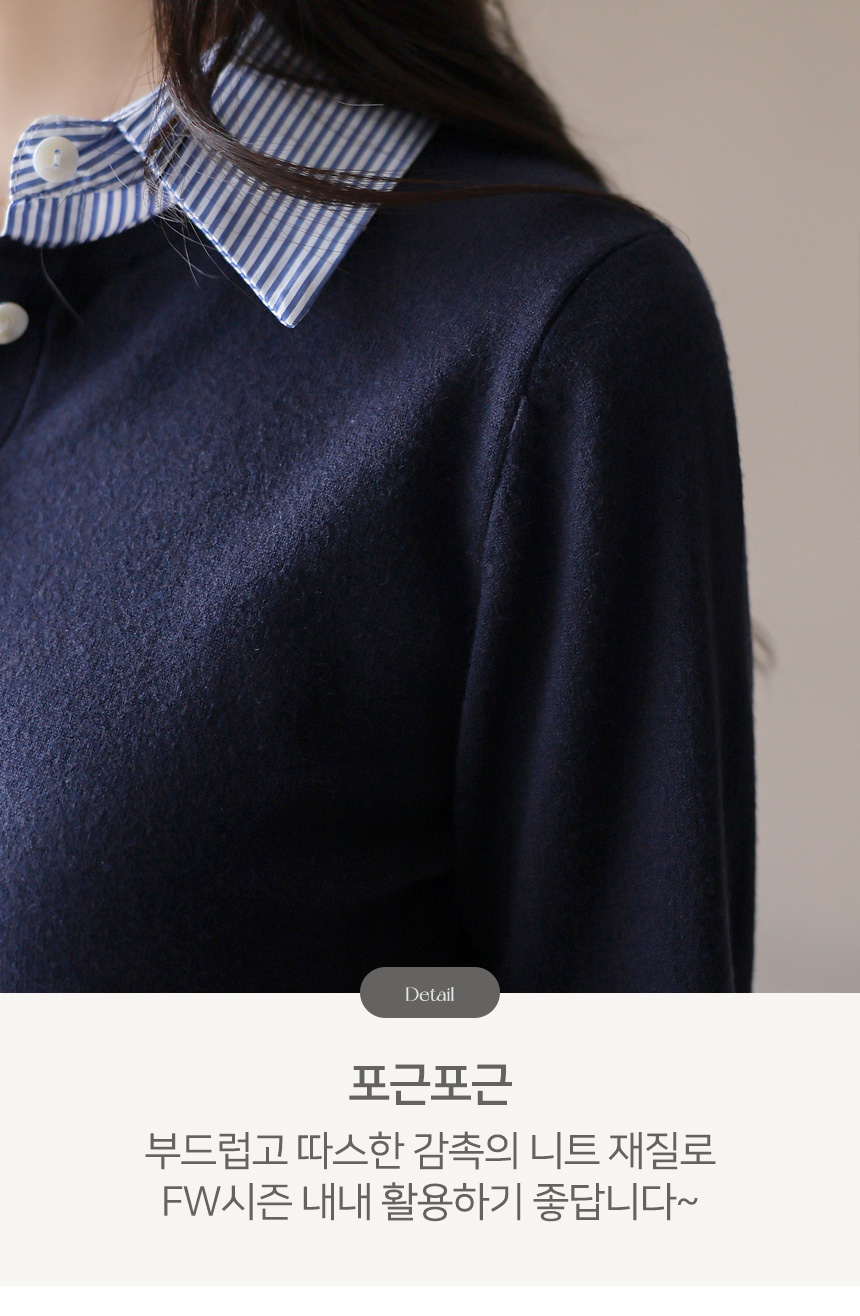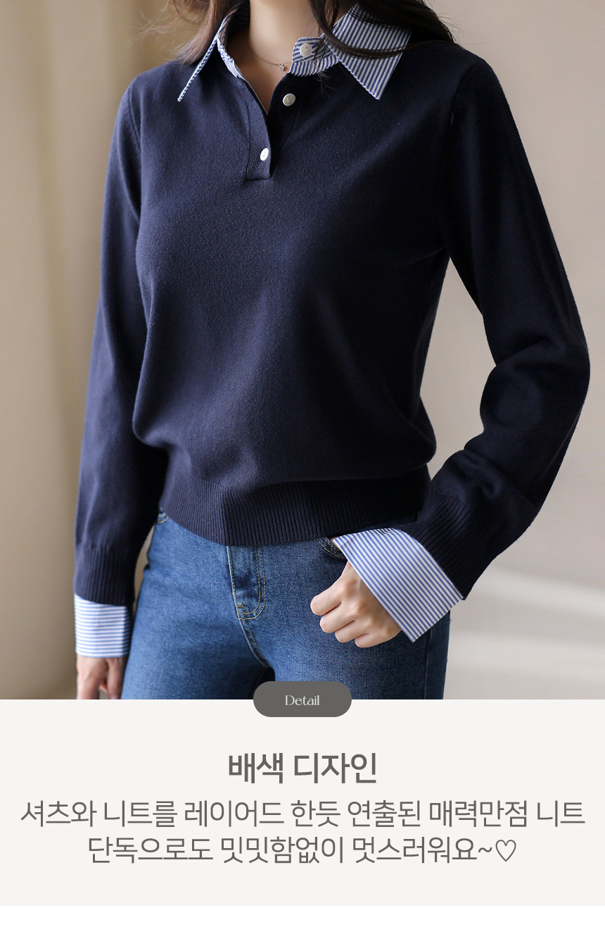 카라와 소맷단에 셔츠 배색을 더해 레이어드한 듯 스타일리시한 느낌을 주는 니트에요 :)
