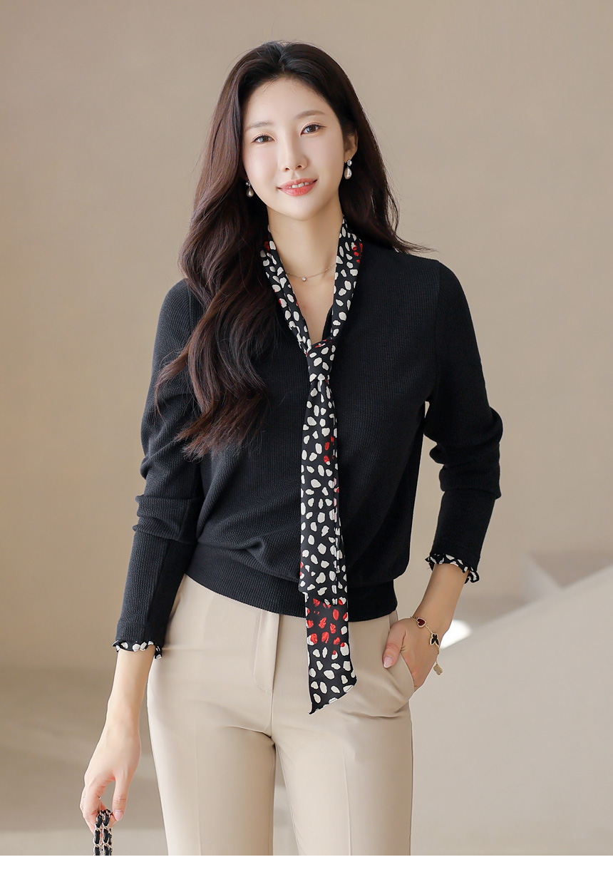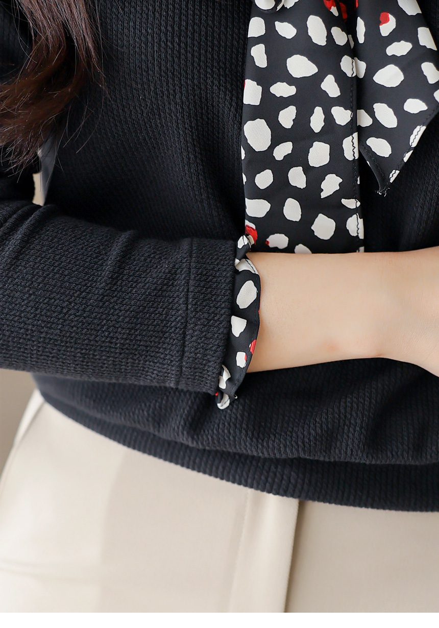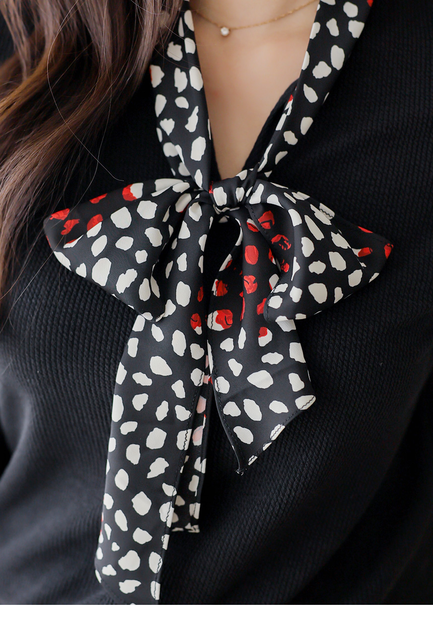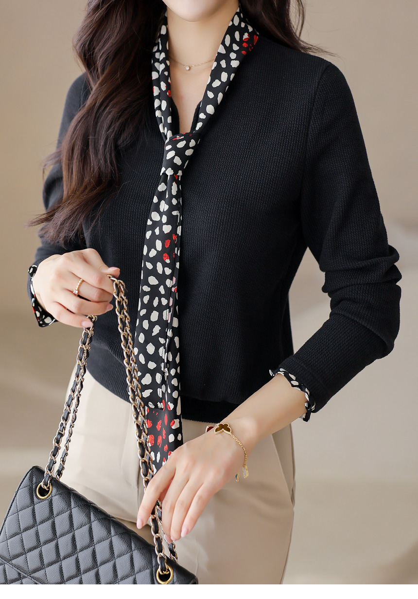 [Chic black rib tee with contrast polka dot scarf detail, blending casual comfort with polished elegance for daily to semi-formal looks.]