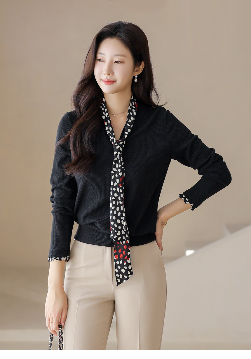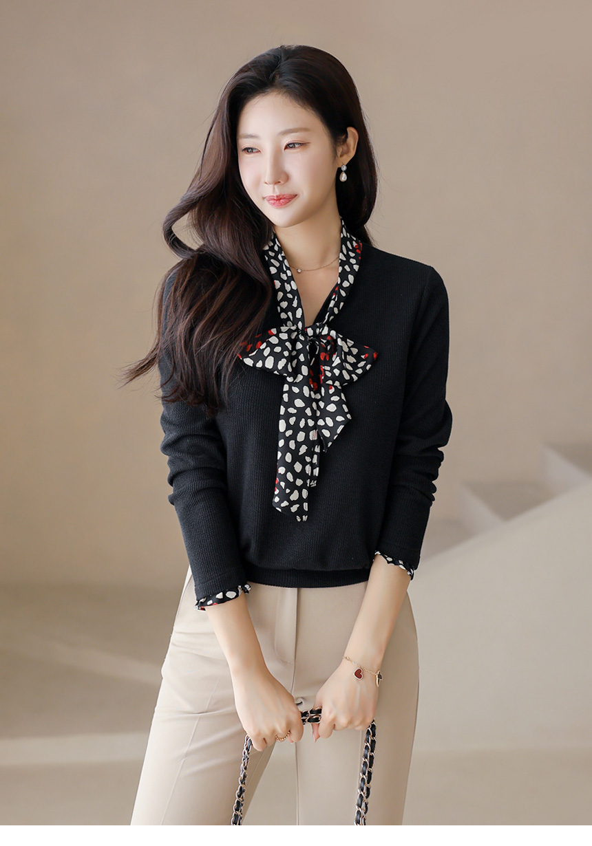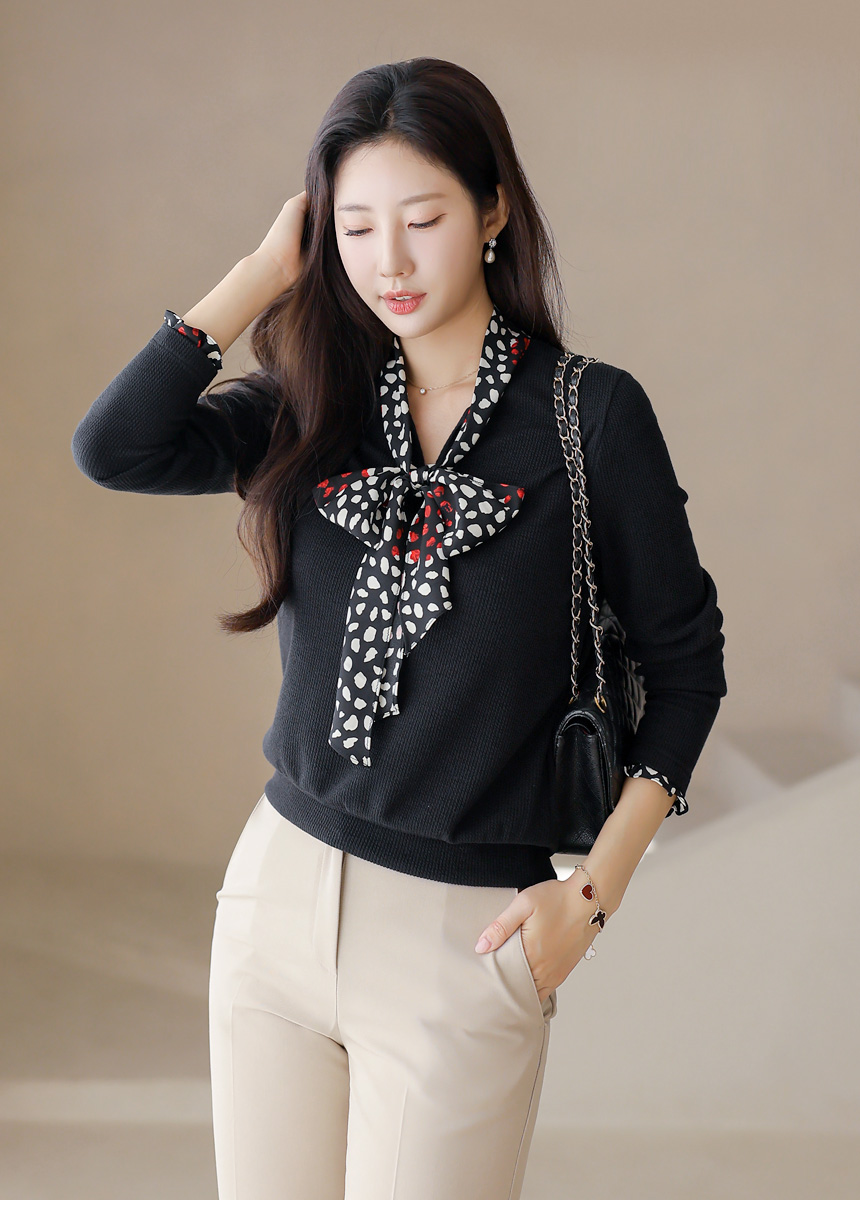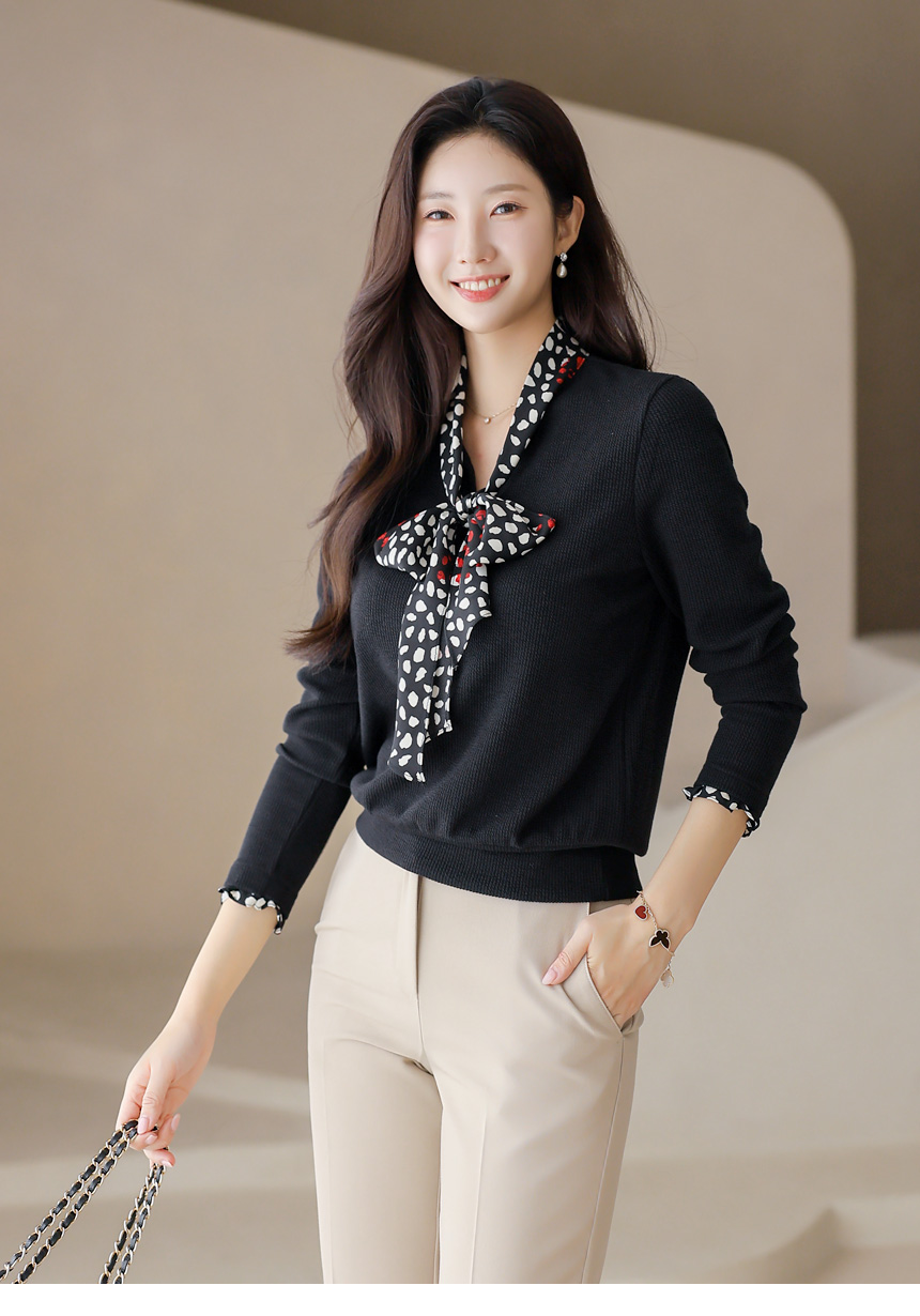 [Chic black rib tee with contrast polka dot scarf detail, blending casual comfort with polished elegance for daily to semi-formal looks.]