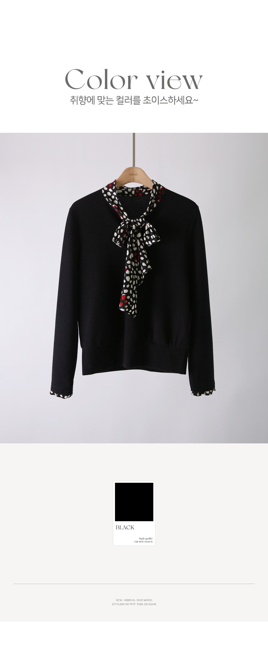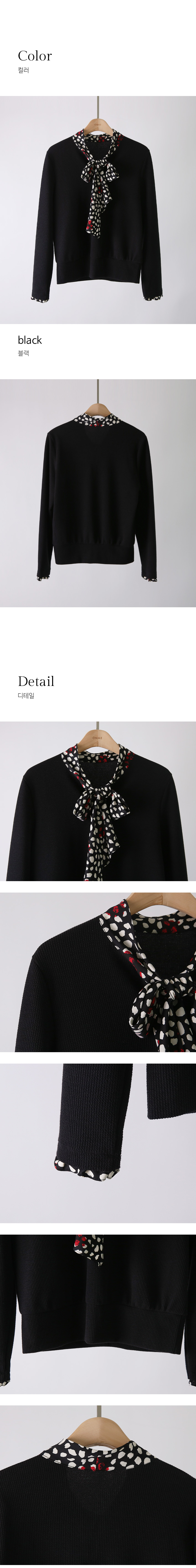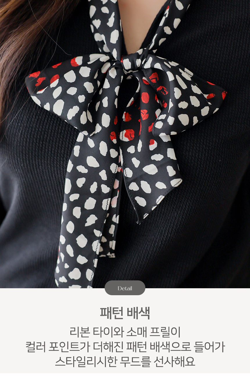 컬러 포인트가 더해진 도트 패턴의 리본넥 배색으로