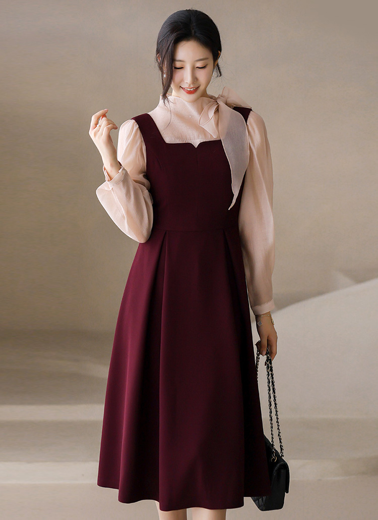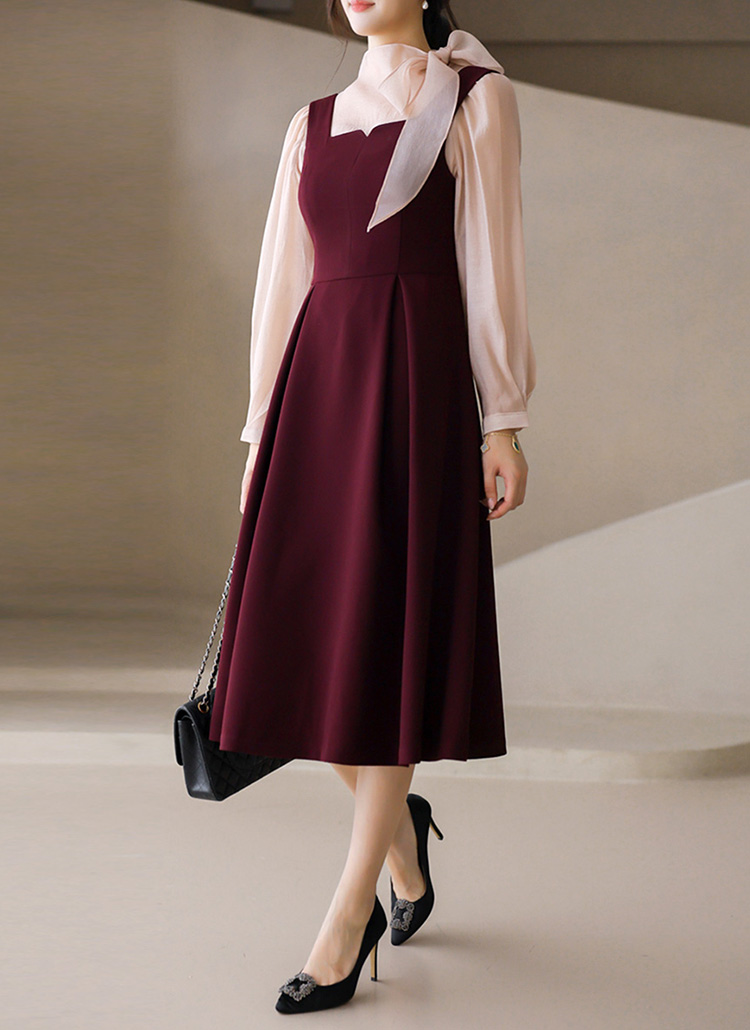 [Long A-line flare dress with delicate heart neck and pleated detail, ideal for layering with blouses or tops for chic day-to-evening looks.]