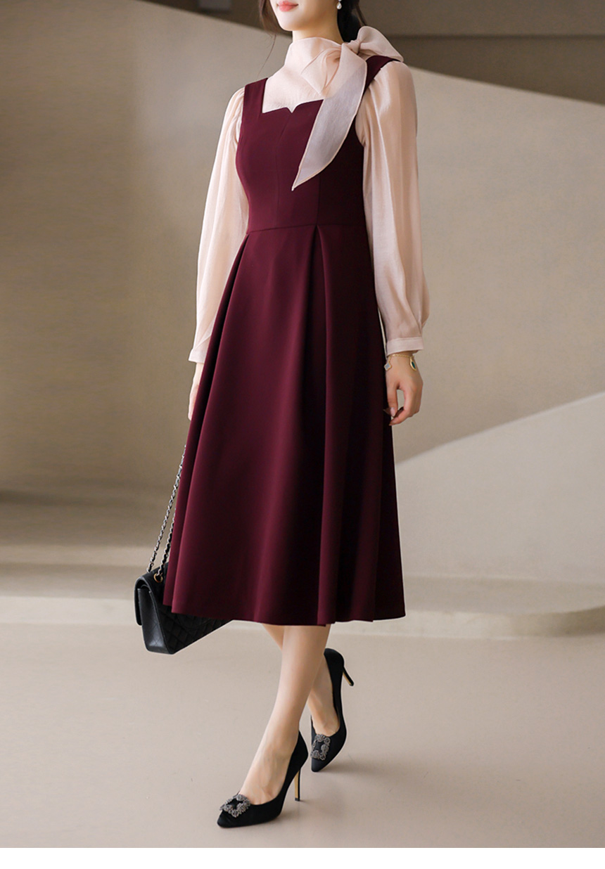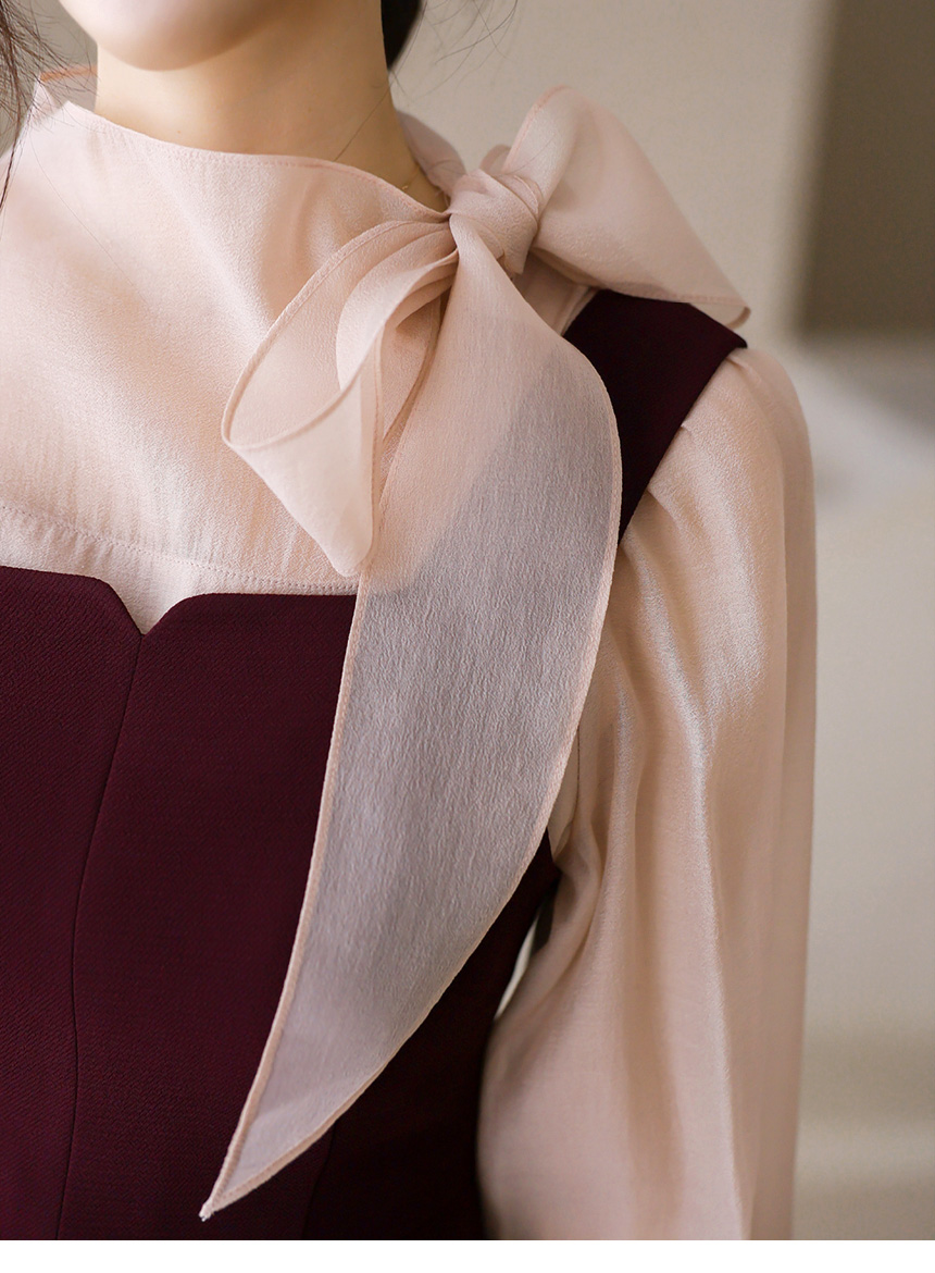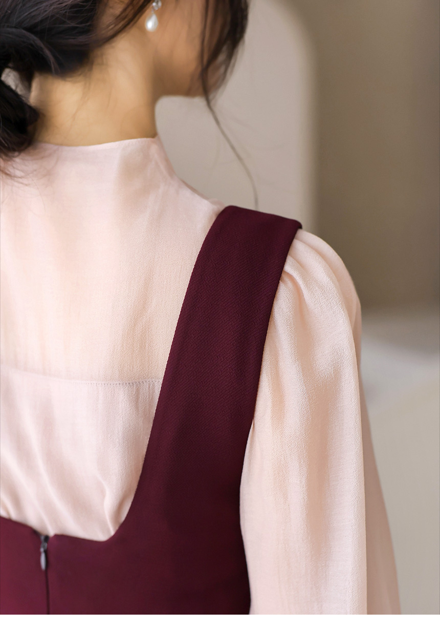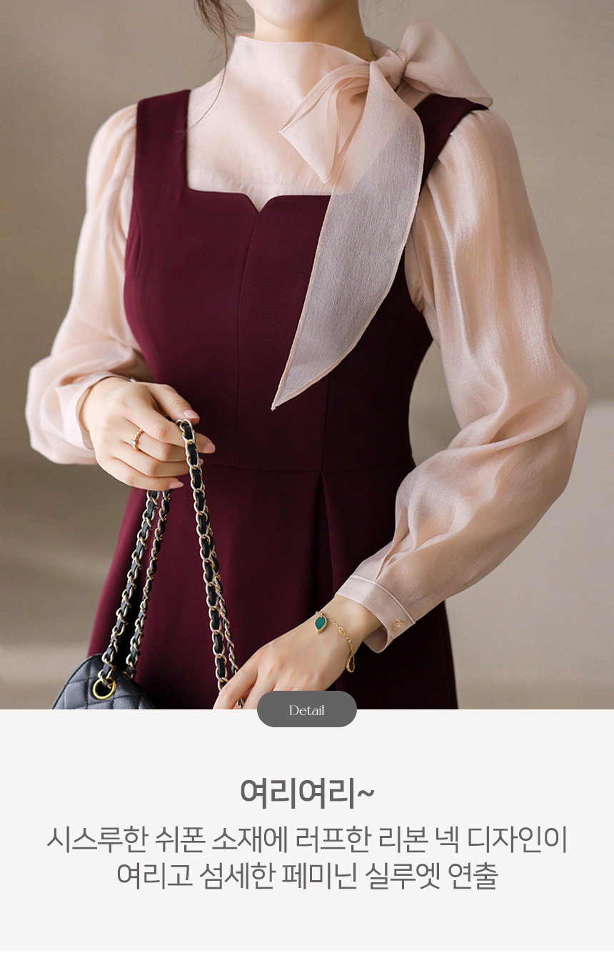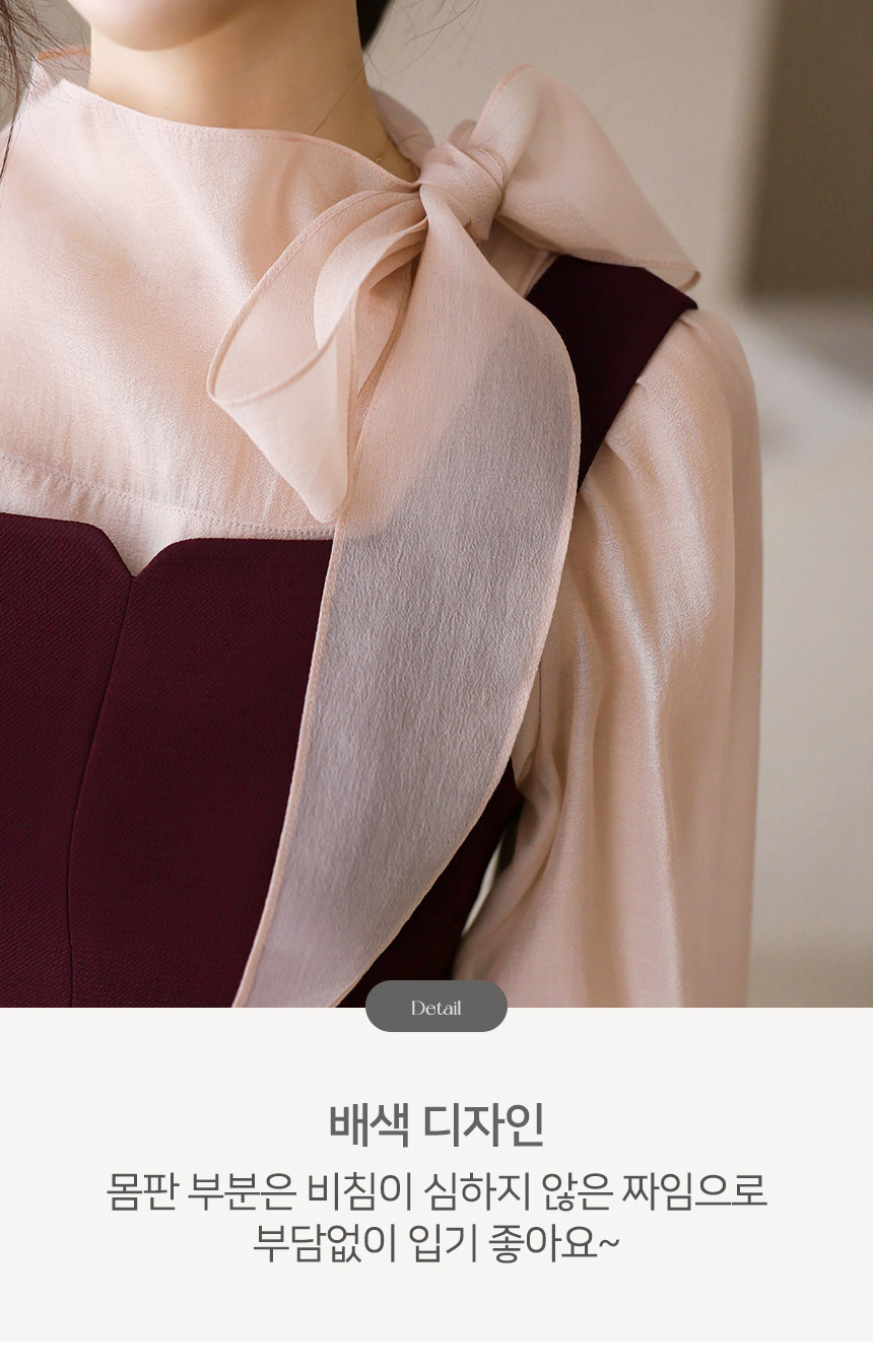 살짝 올라오는 반하이넥에 리본넥 디자인으로
