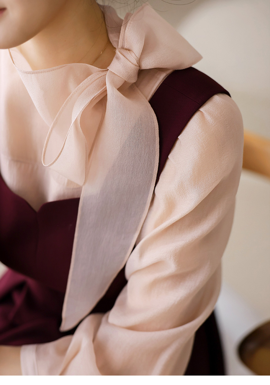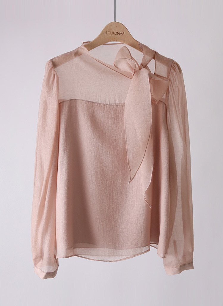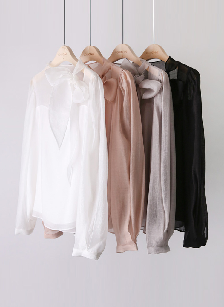 [Delicate Tencel chiffon blouse with a refined ribbon neck and sheer sleeves, offering graceful volume and feminine charm.]