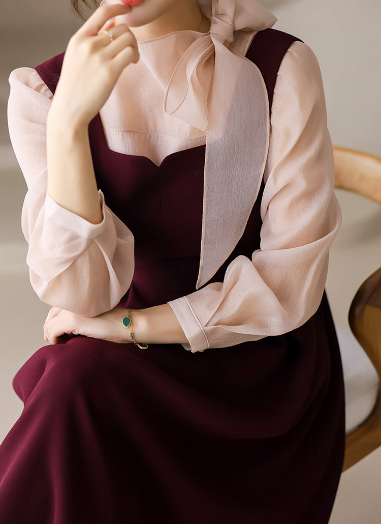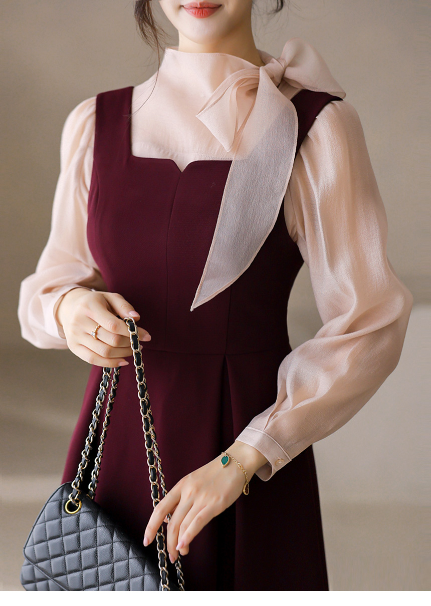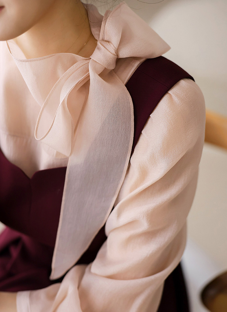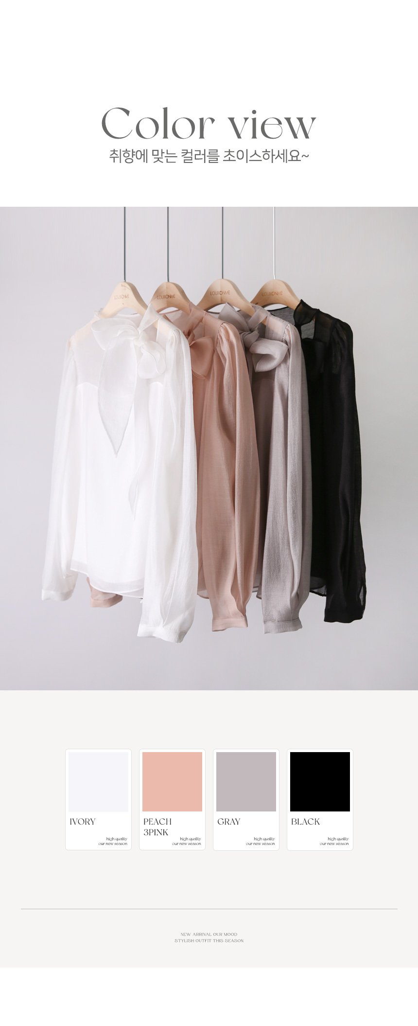 [Delicate Tencel chiffon blouse with a refined ribbon neck and sheer sleeves, offering graceful volume and feminine charm.]