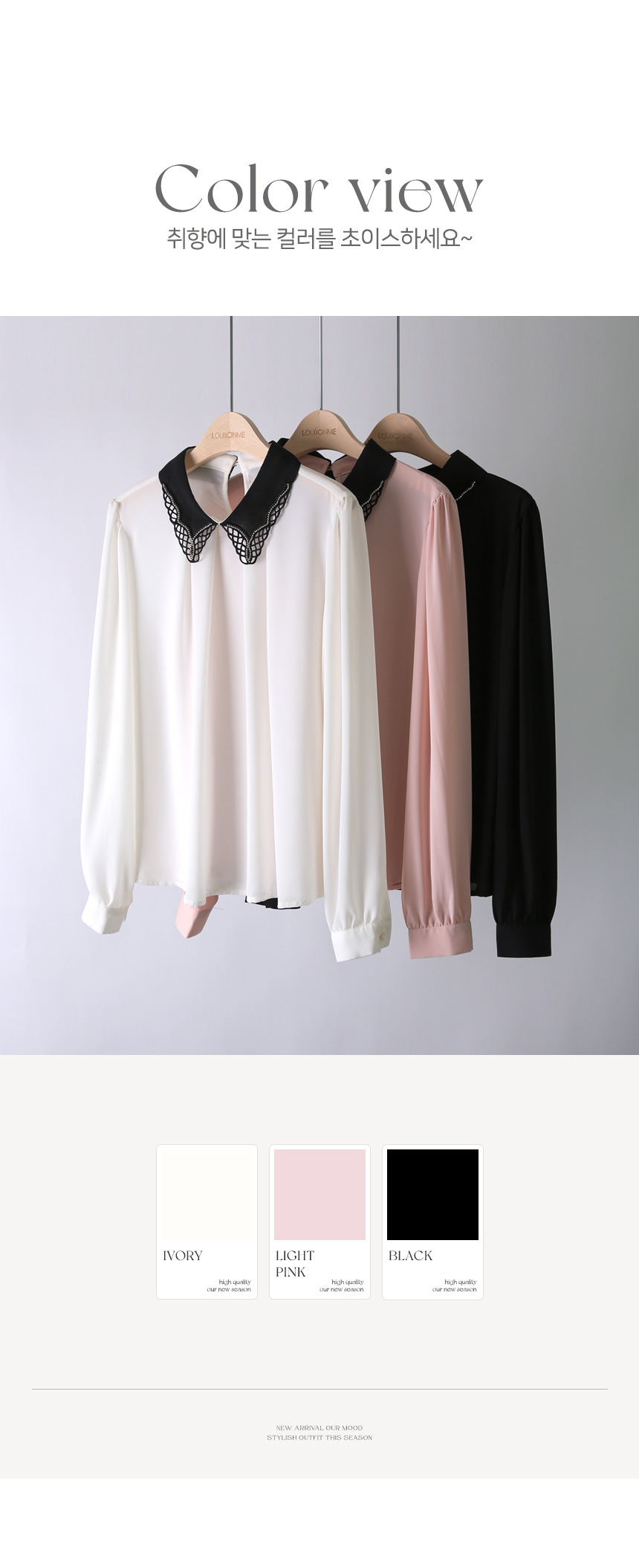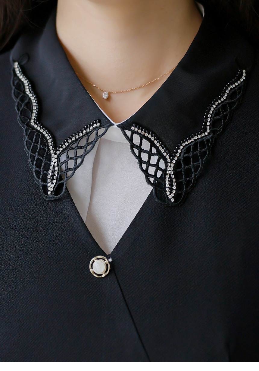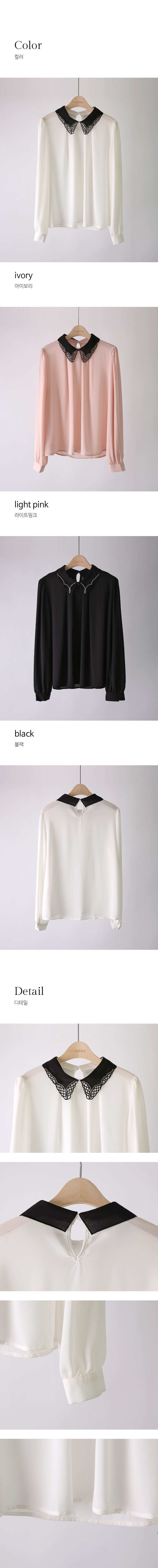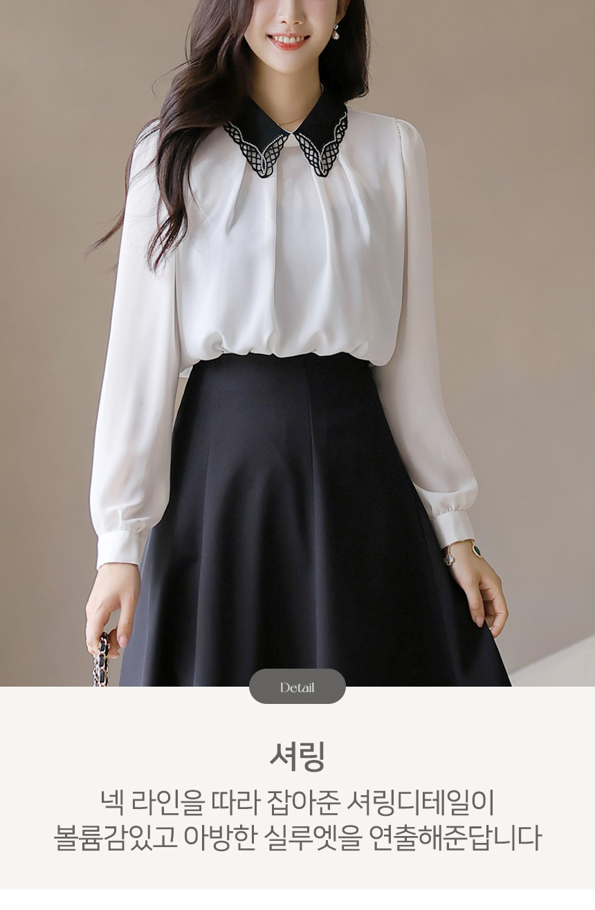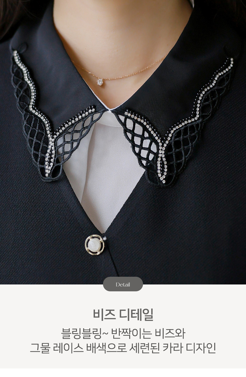 큐빅과 레이스 디테일이 더해진 카라로 멋스럽게 룩을 완성하는