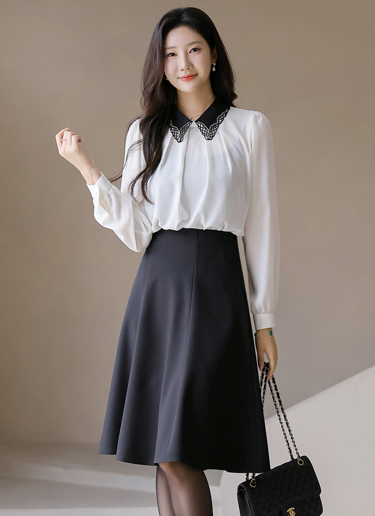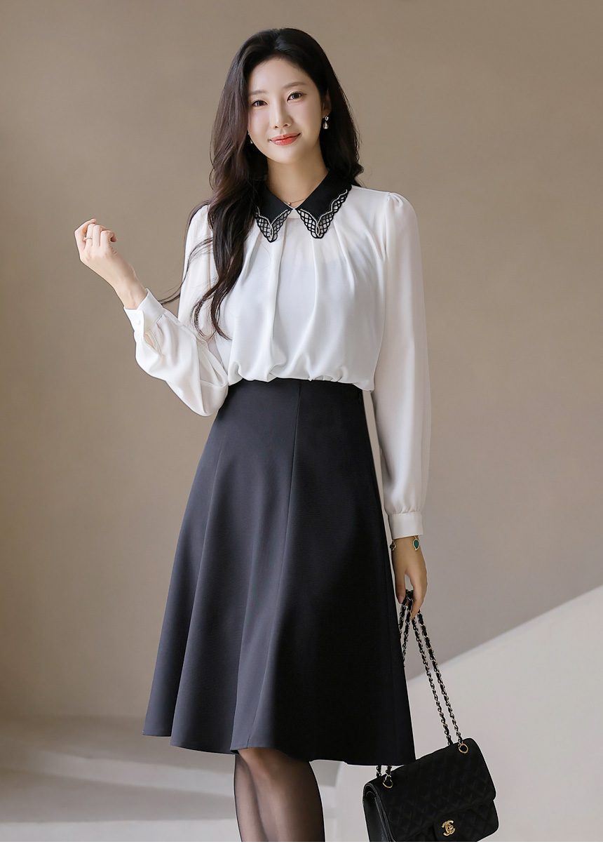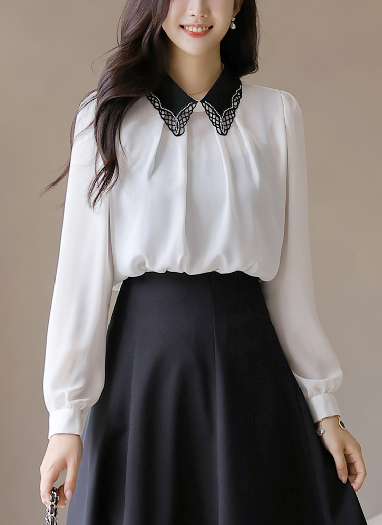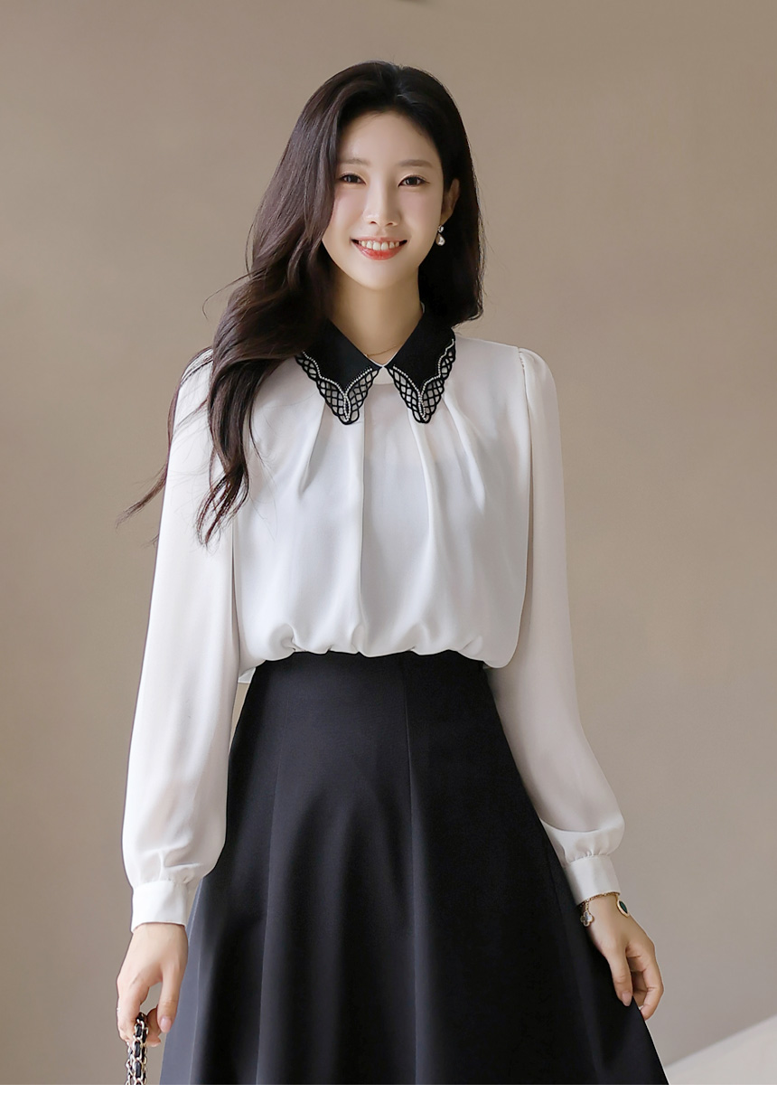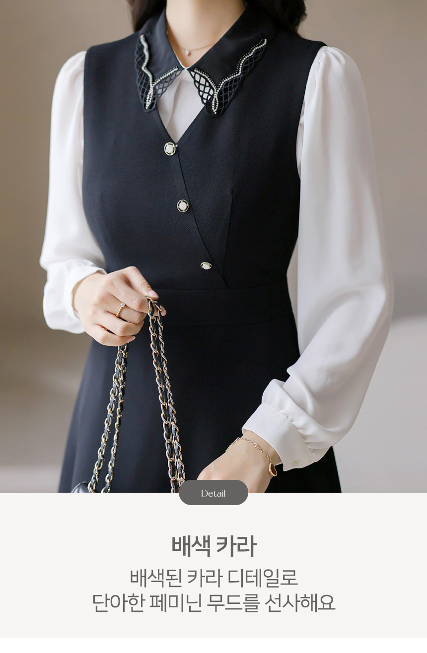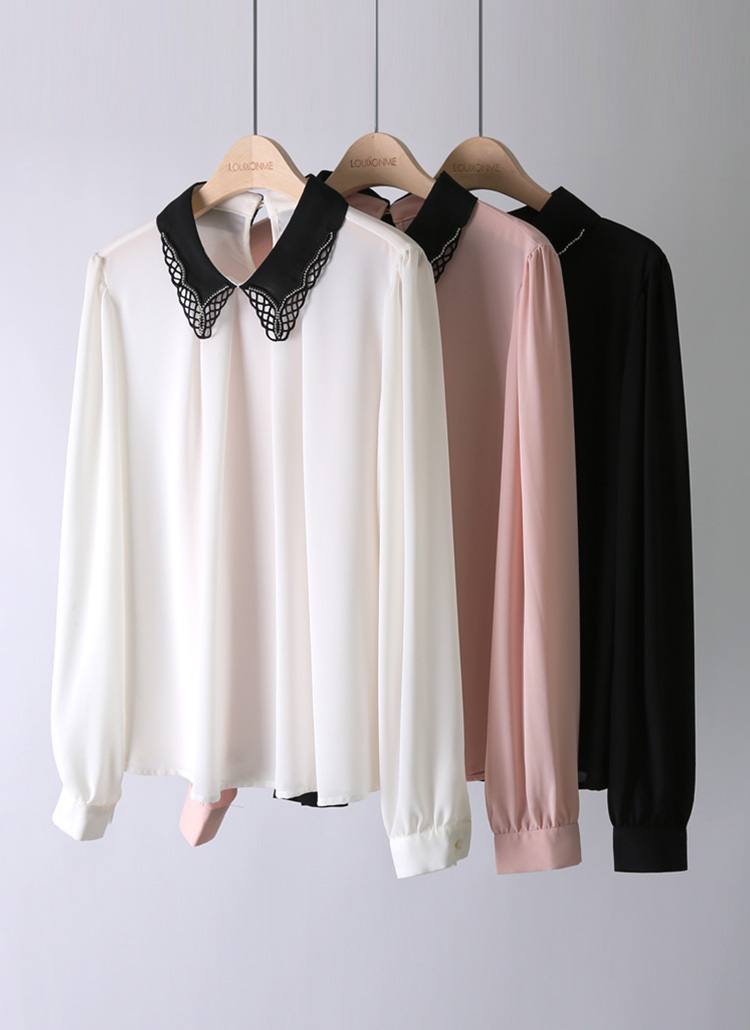 큐빅과 레이스 디테일이 더해진 카라로 멋스럽게 룩을 완성하는