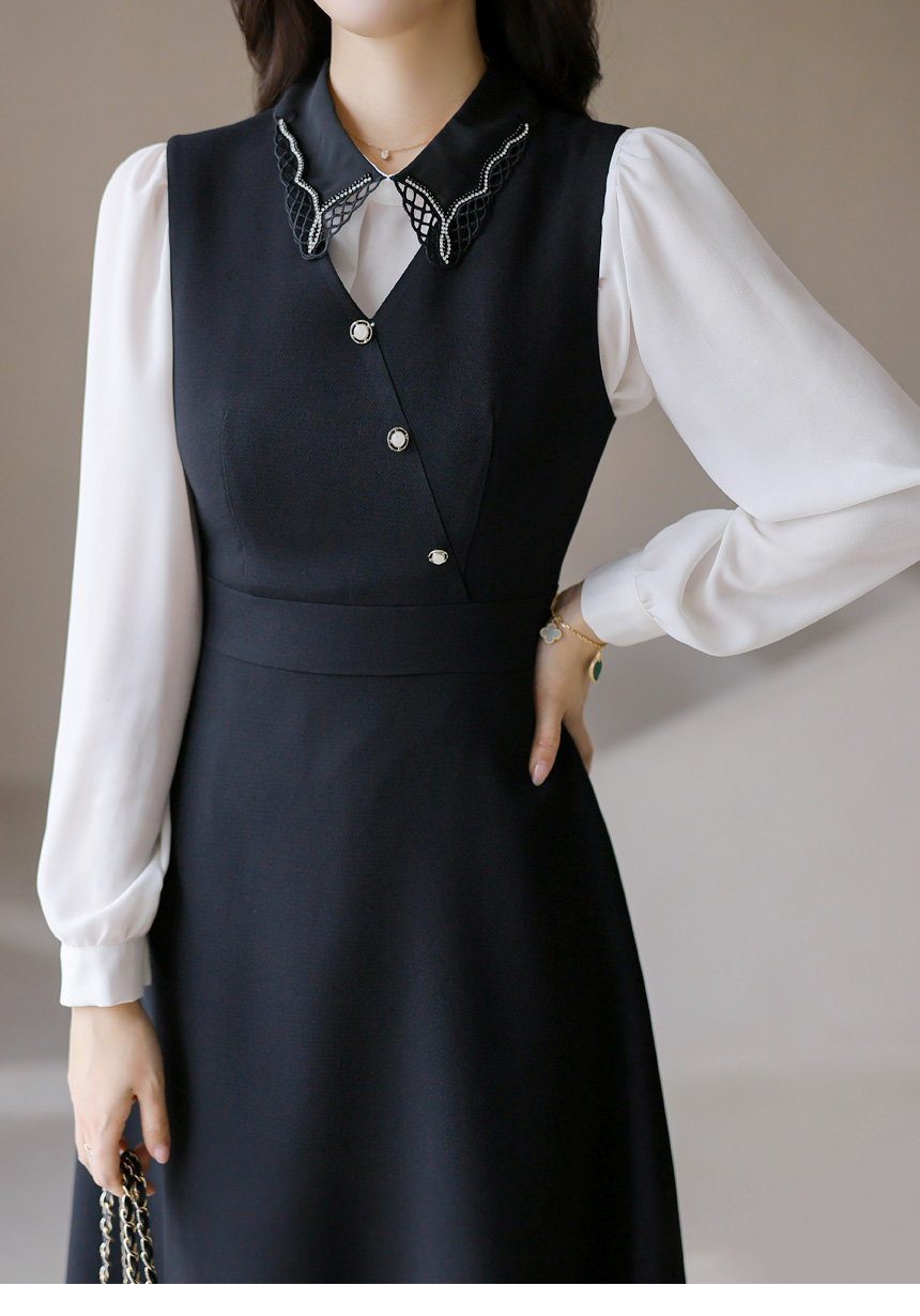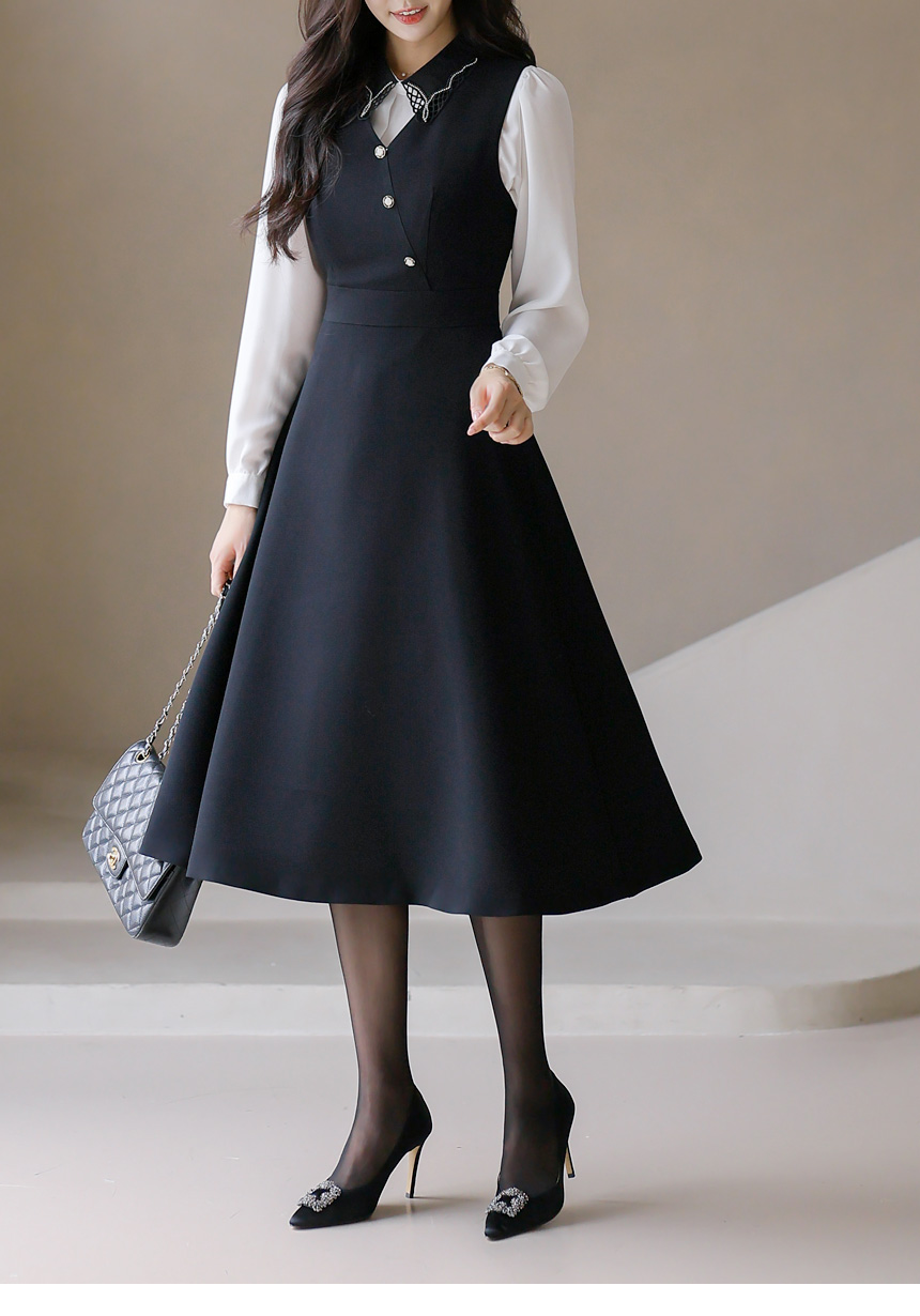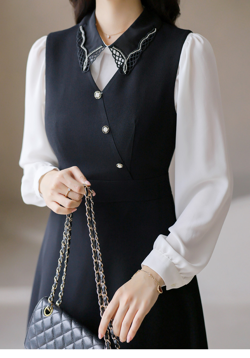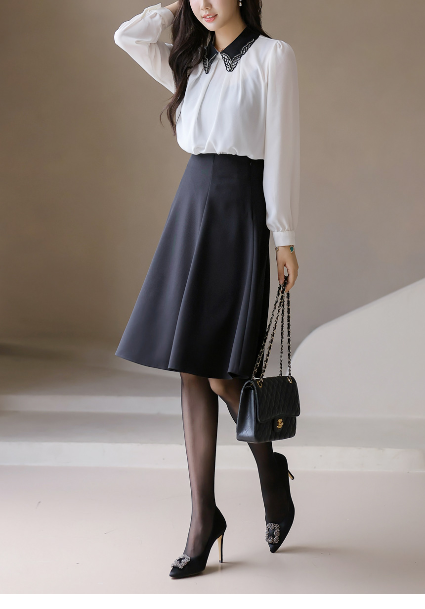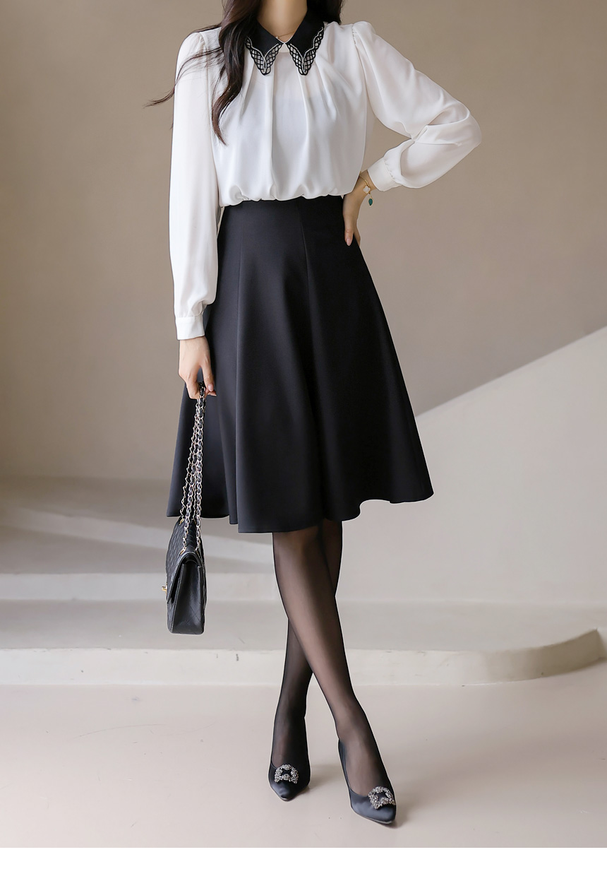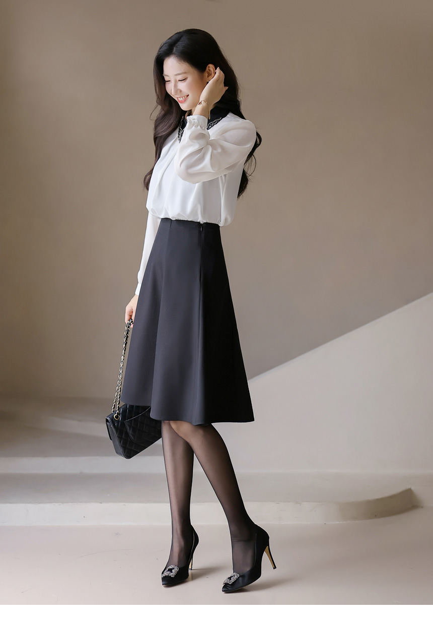 큐빅과 레이스 디테일이 더해진 카라로 멋스럽게 룩을 완성하는