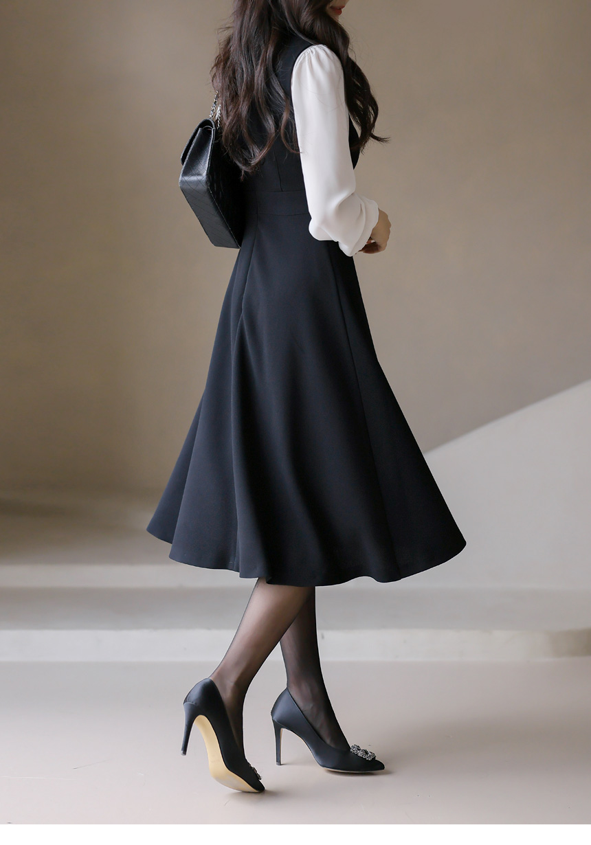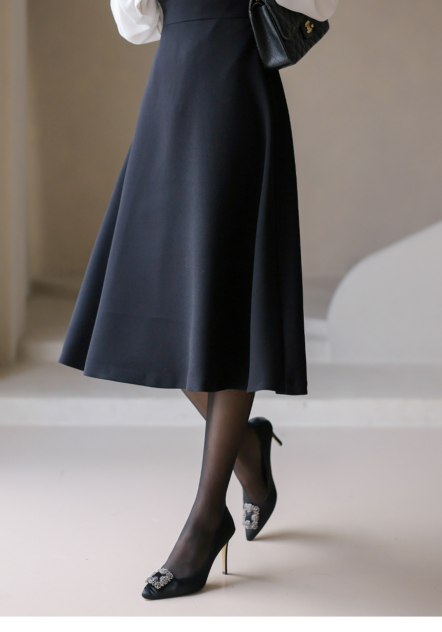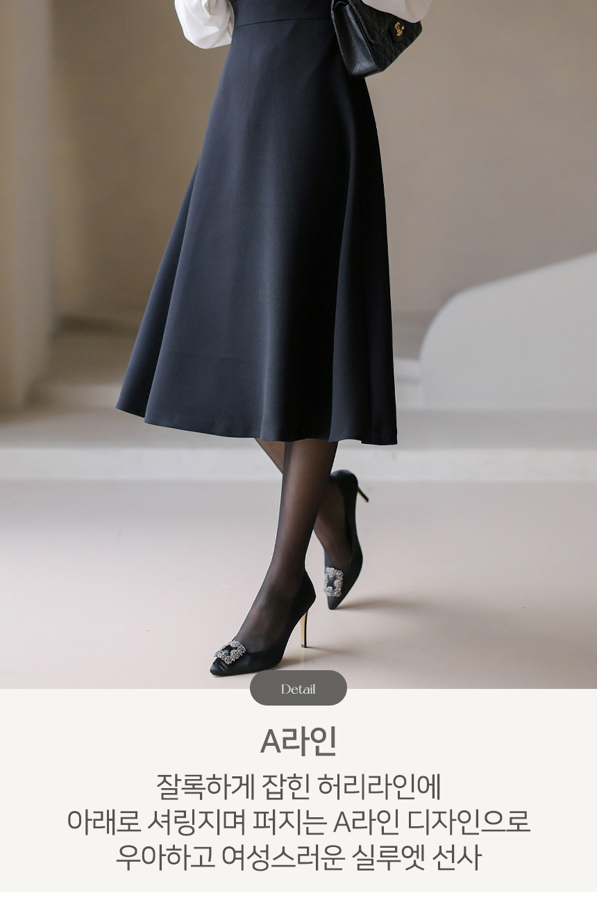 은은하게 셔링지며 퍼지는 A라인 실루엣에 무릎 아래로 오는 롱한 길이감으로