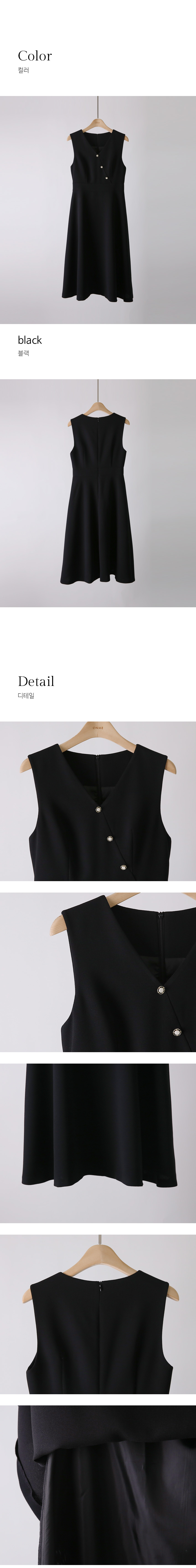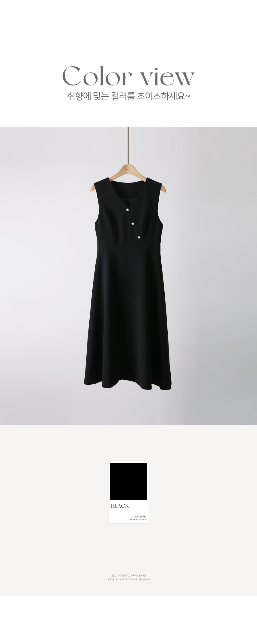 [Designed with a refined wrap bodice and pearl button accents, this versatile sleeveless midi dress pairs beautifully with blouses or knits.]