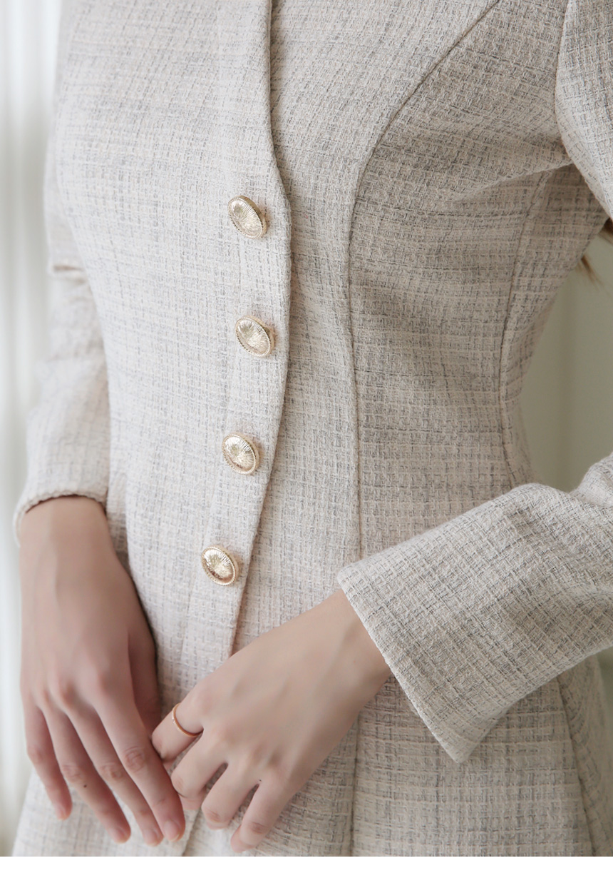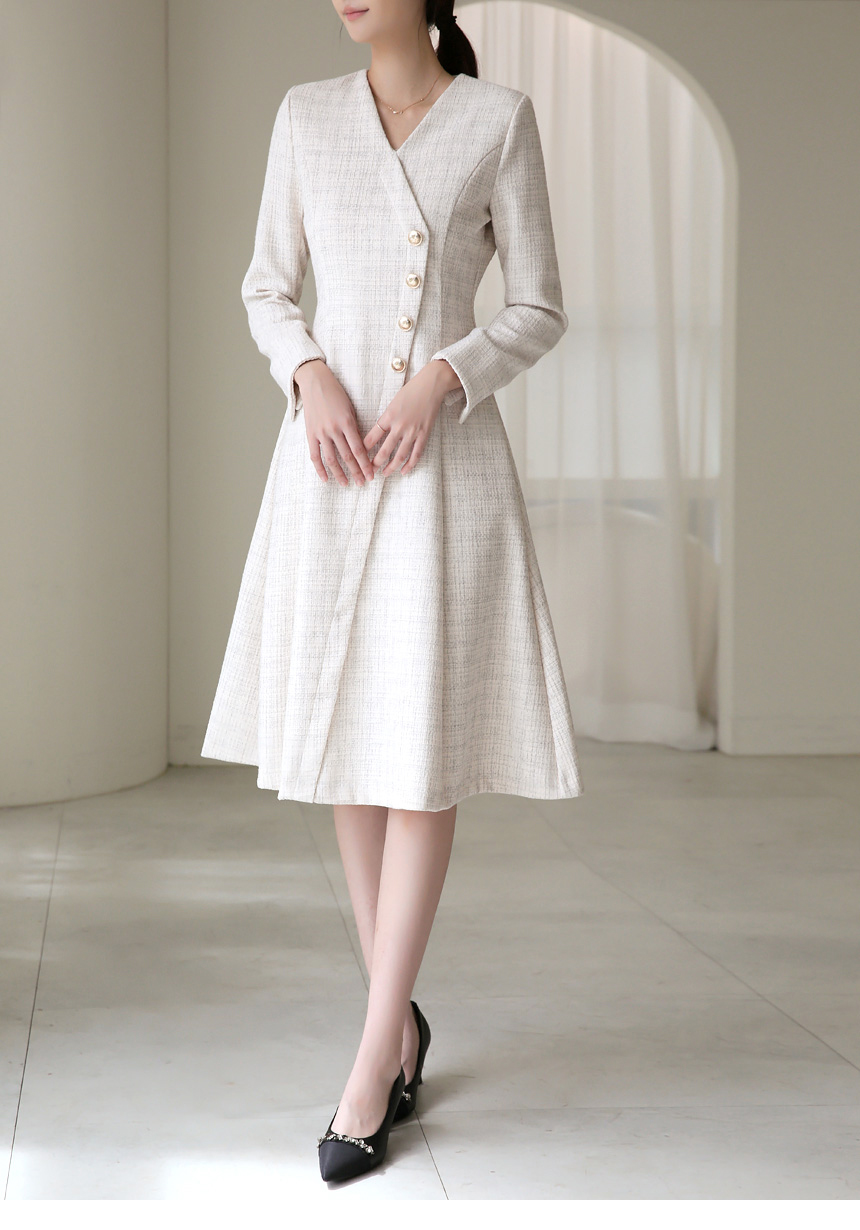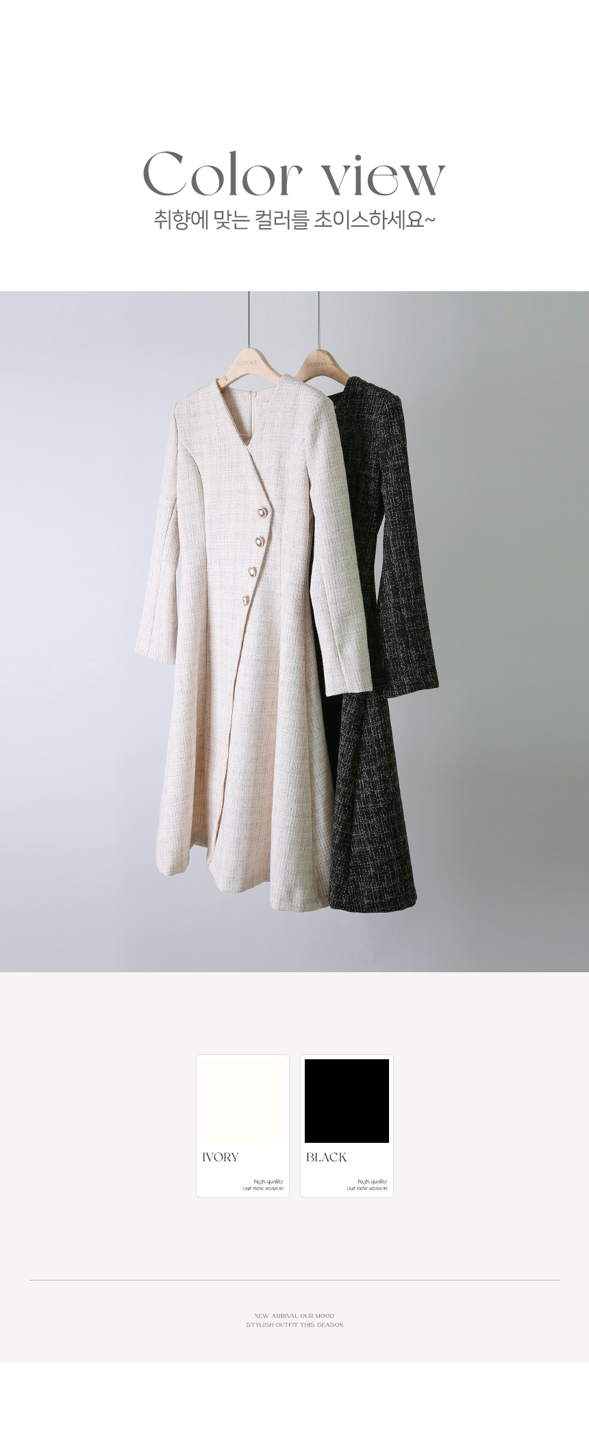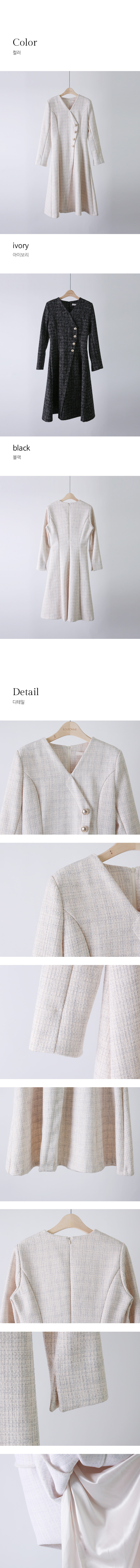 랩 디자인 골드 버튼 A라인 플레어 트위드 롱 원피스에요 :)