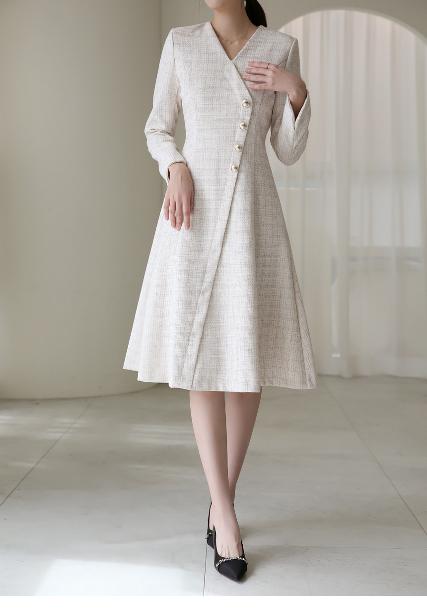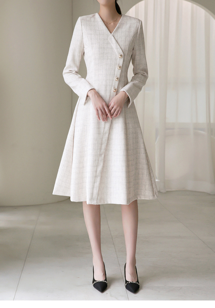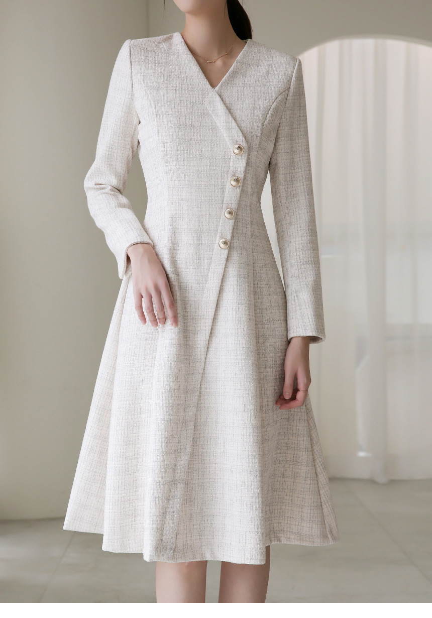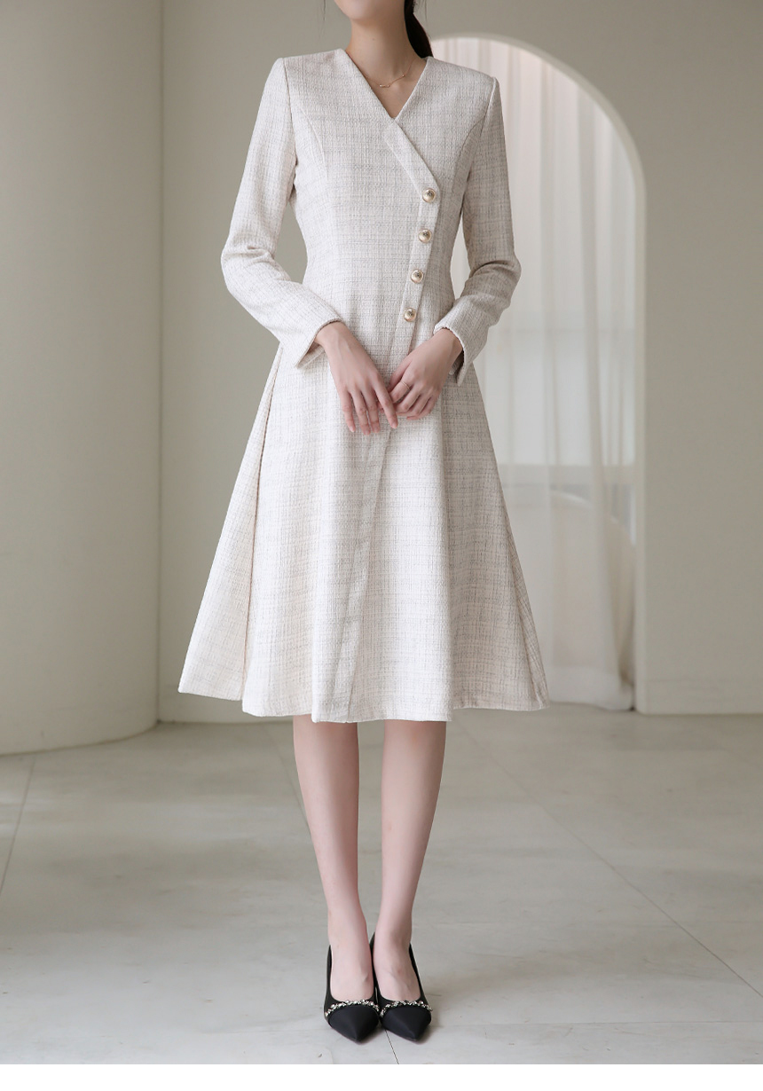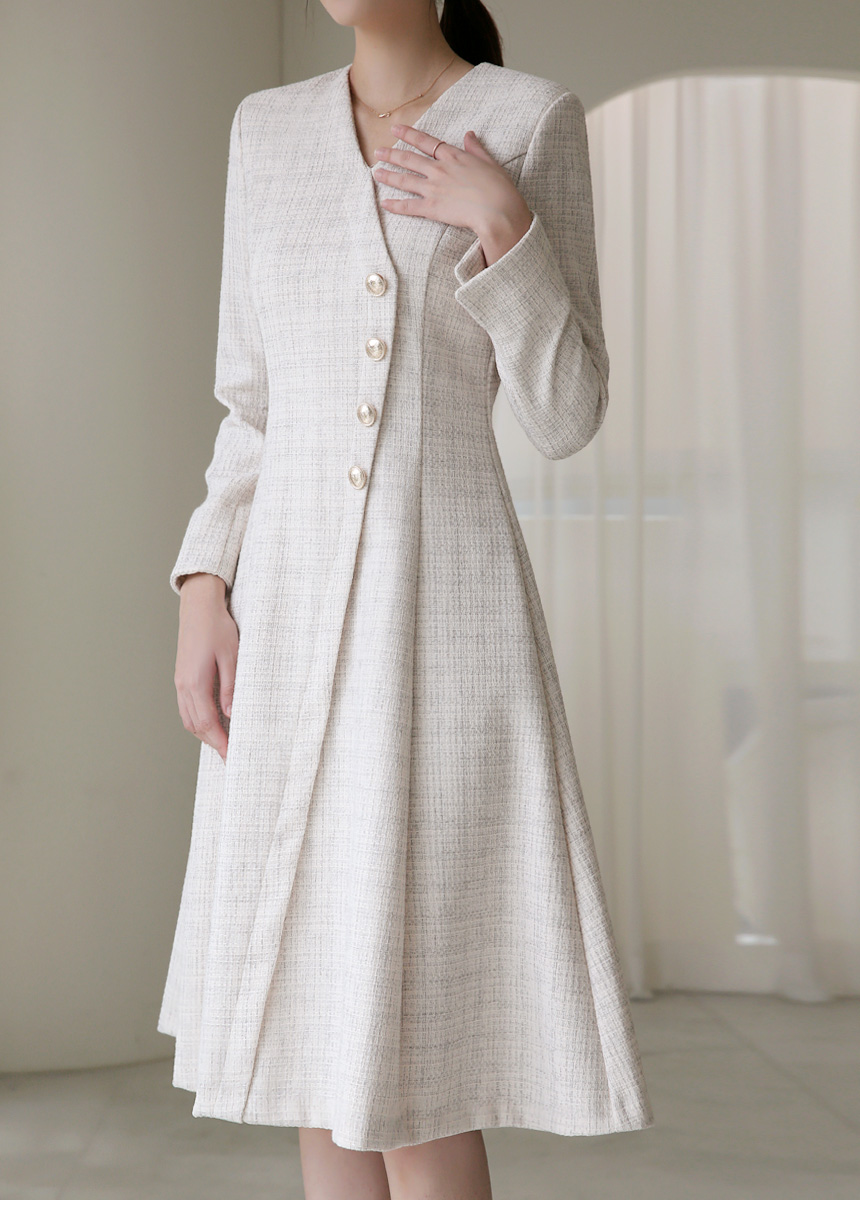 랩 디자인 골드 버튼 A라인 플레어 트위드 롱 원피스에요 :)