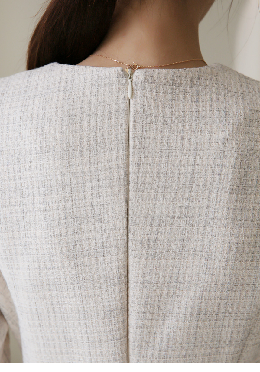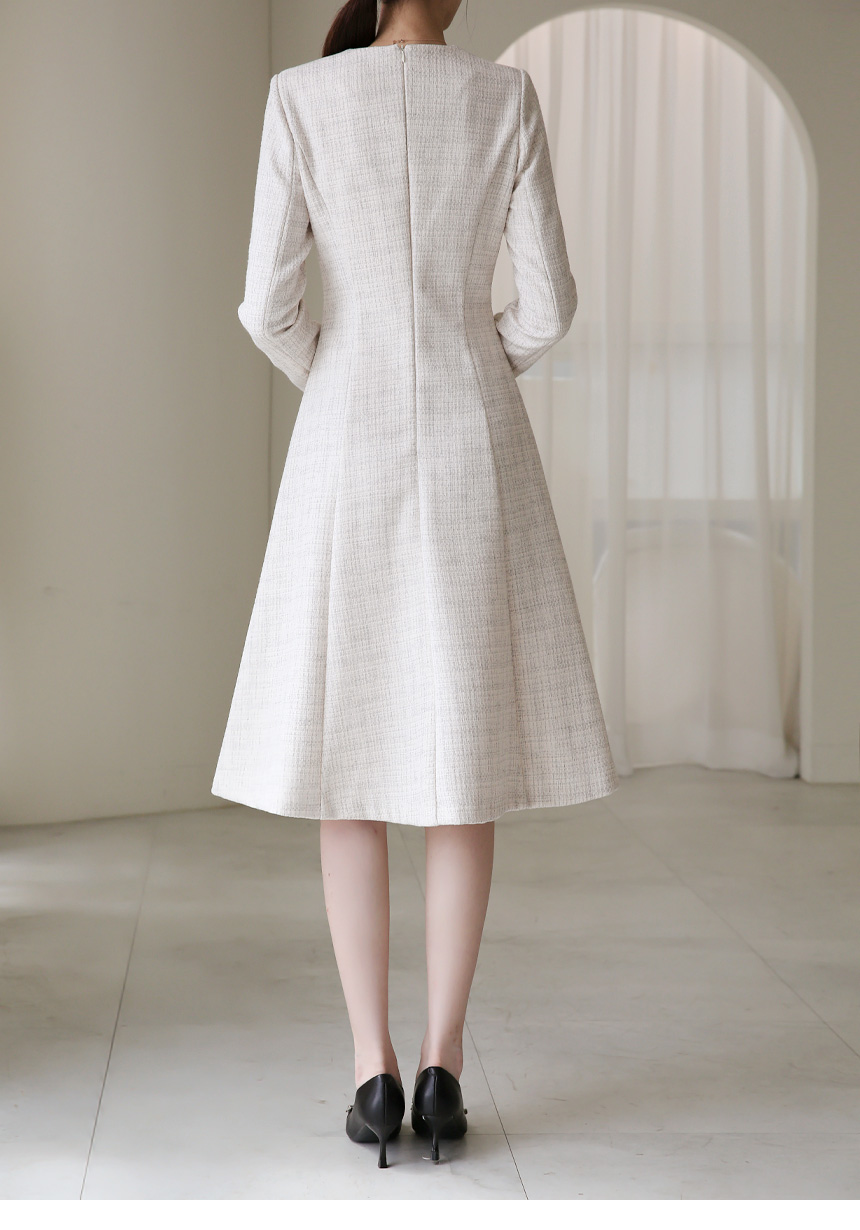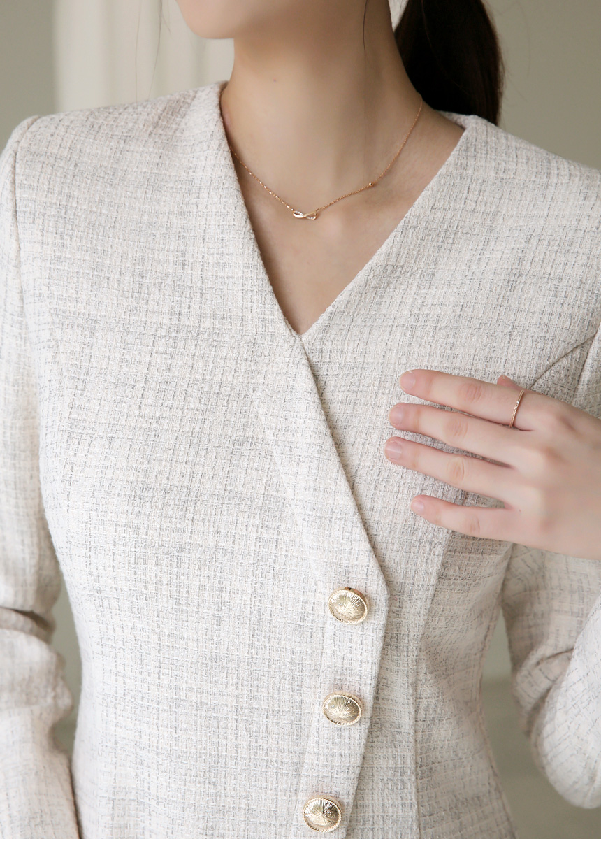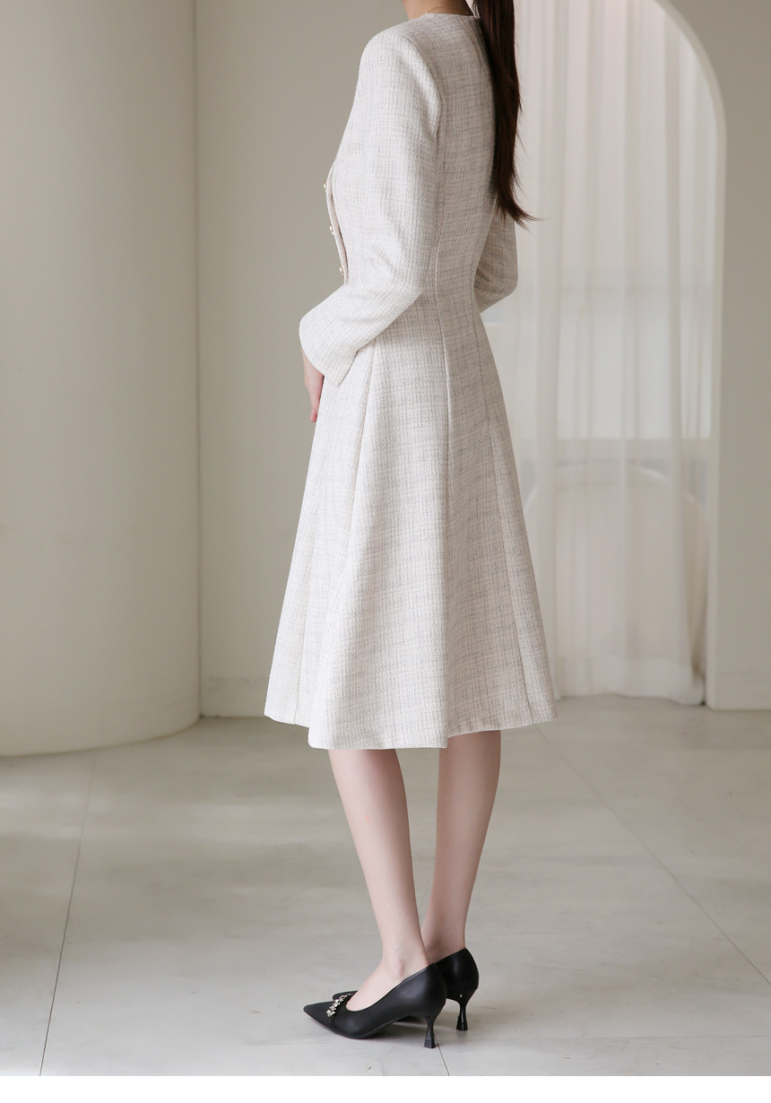 랩 디자인 골드 버튼 A라인 플레어 트위드 롱 원피스에요 :)