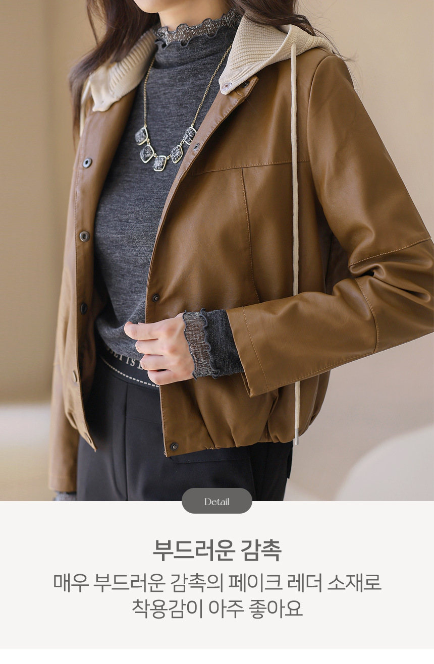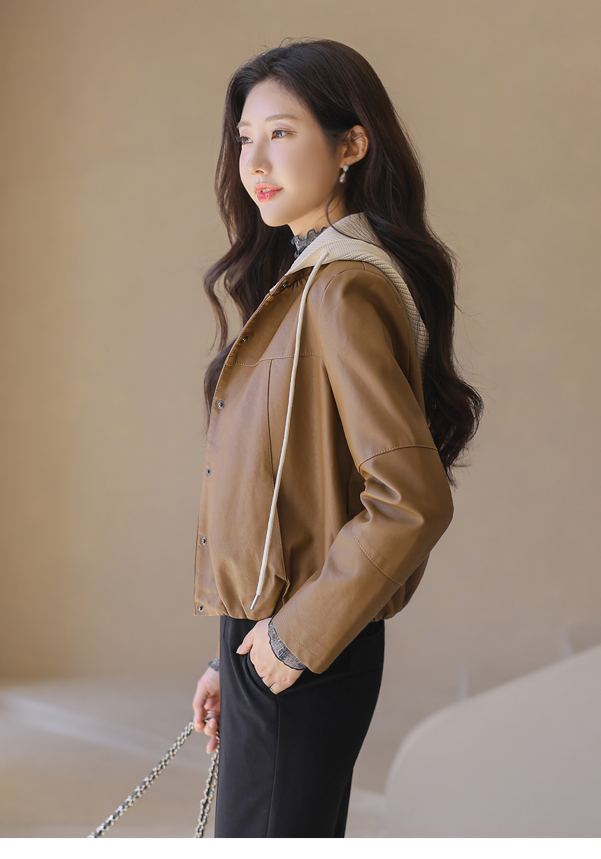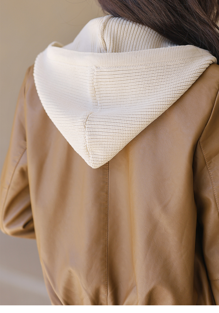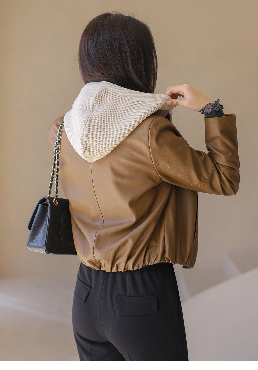 [A relaxed-fit faux leather jacket featuring detachable knit hood, banded hemline, and simple bomber silhouette for daily wear.]