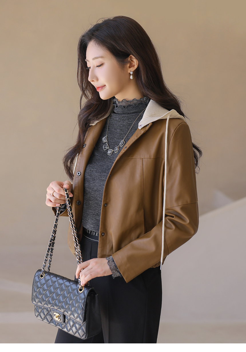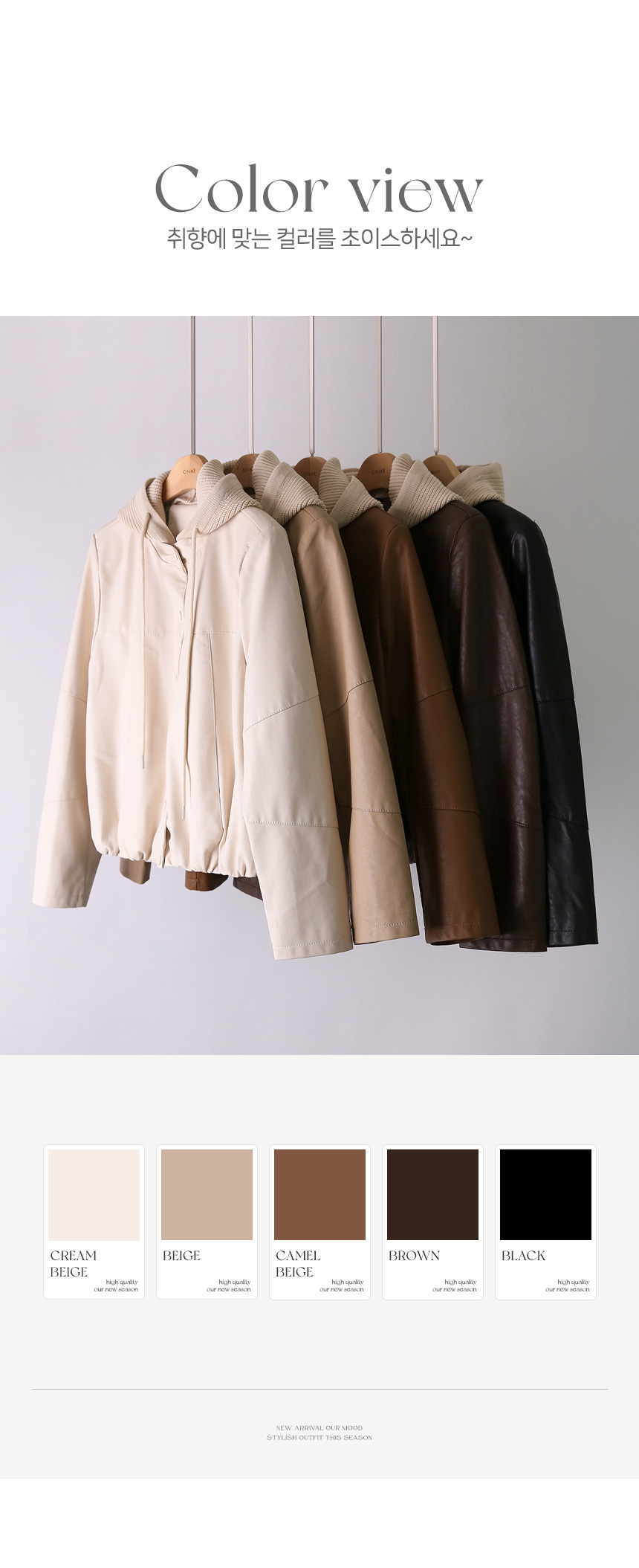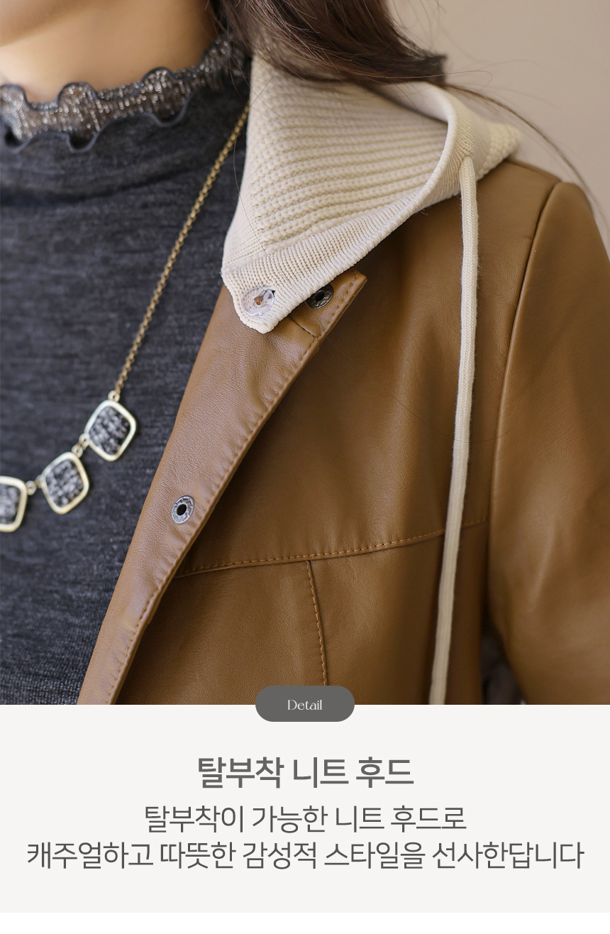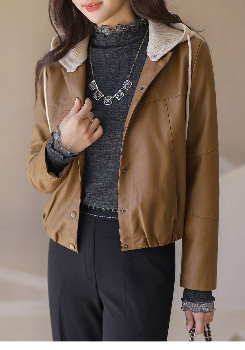 [A relaxed-fit faux leather jacket featuring detachable knit hood, banded hemline, and simple bomber silhouette for daily wear.]