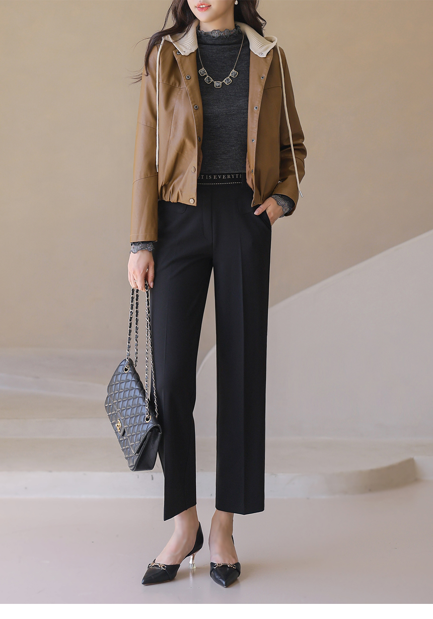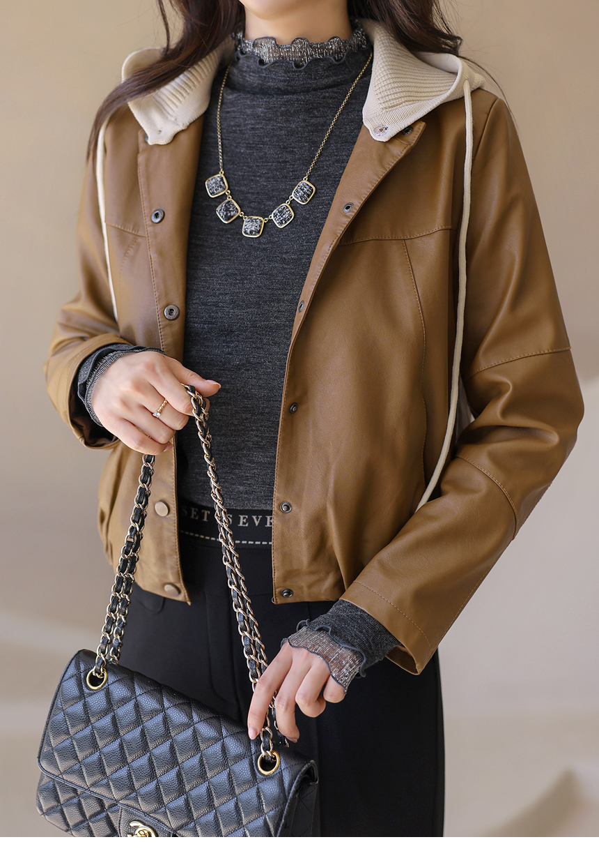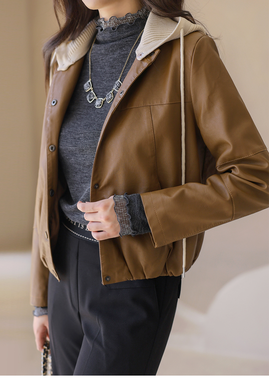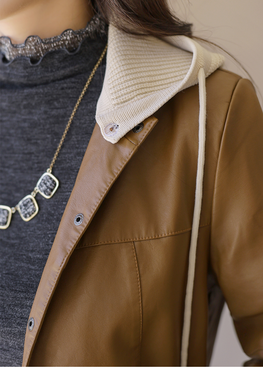 [A relaxed-fit faux leather jacket featuring detachable knit hood, banded hemline, and simple bomber silhouette for daily wear.]
