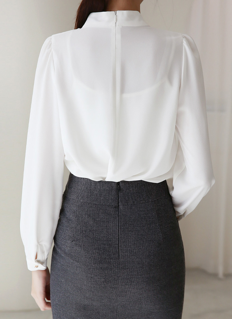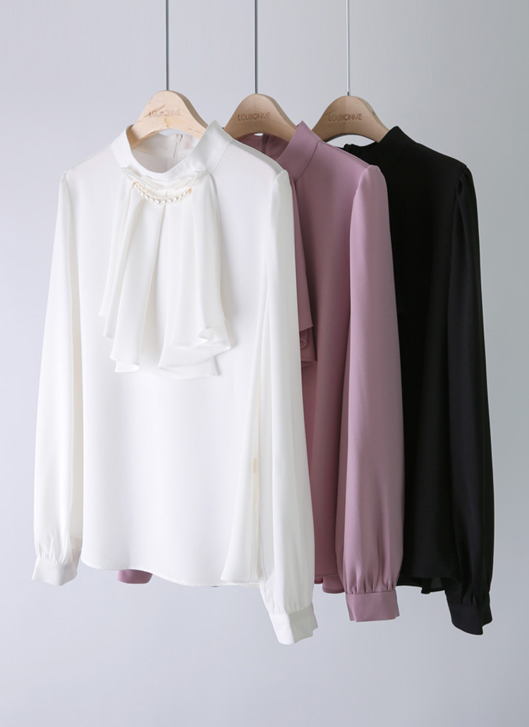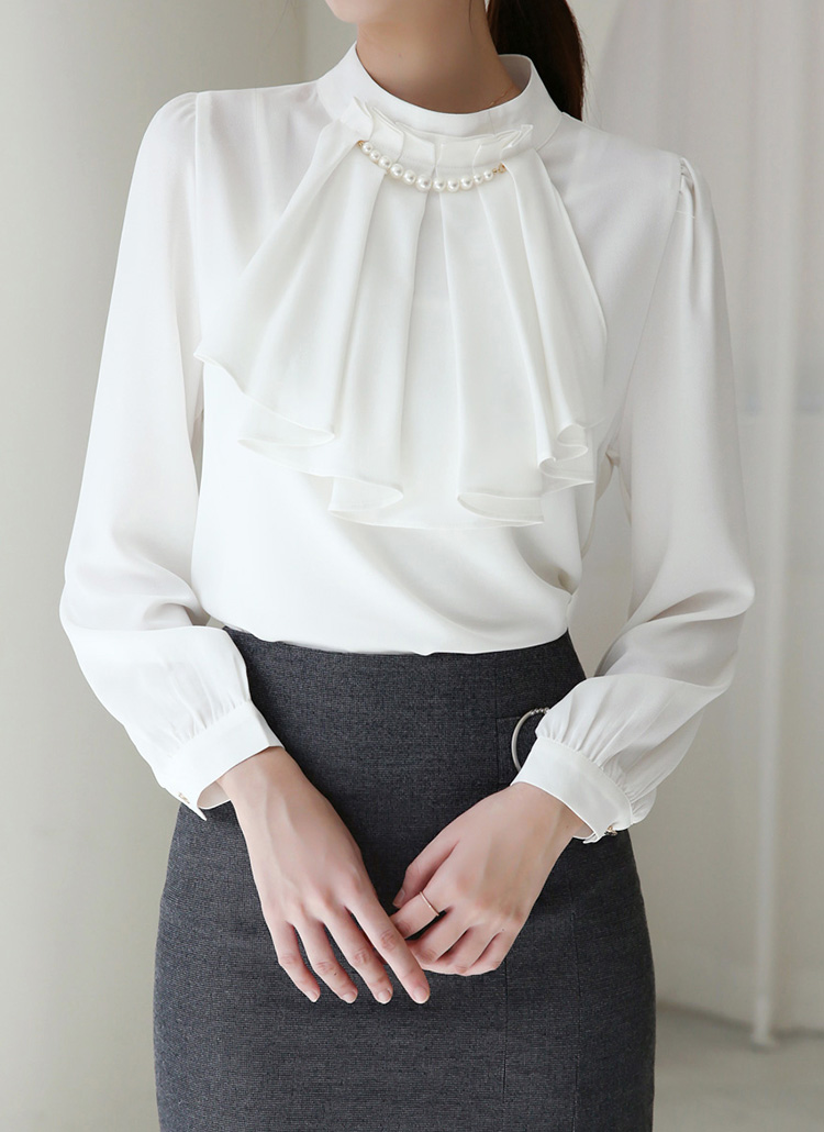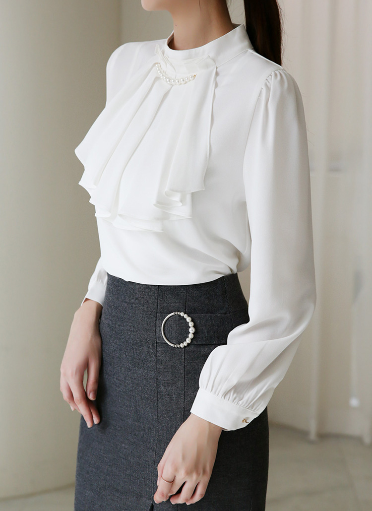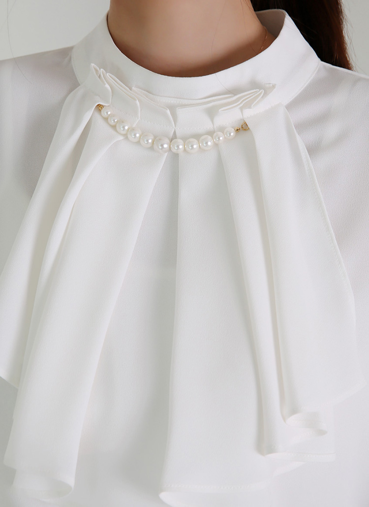 [Graceful blouse with layered pleated ruffles and detachable pearl trim, creating a feminine silhouette with refined elegance.]