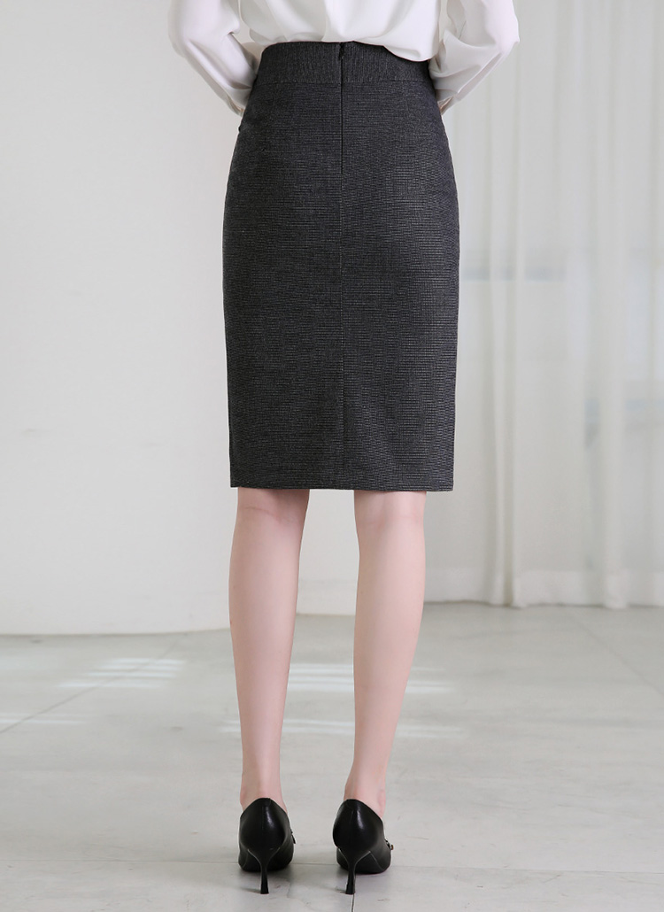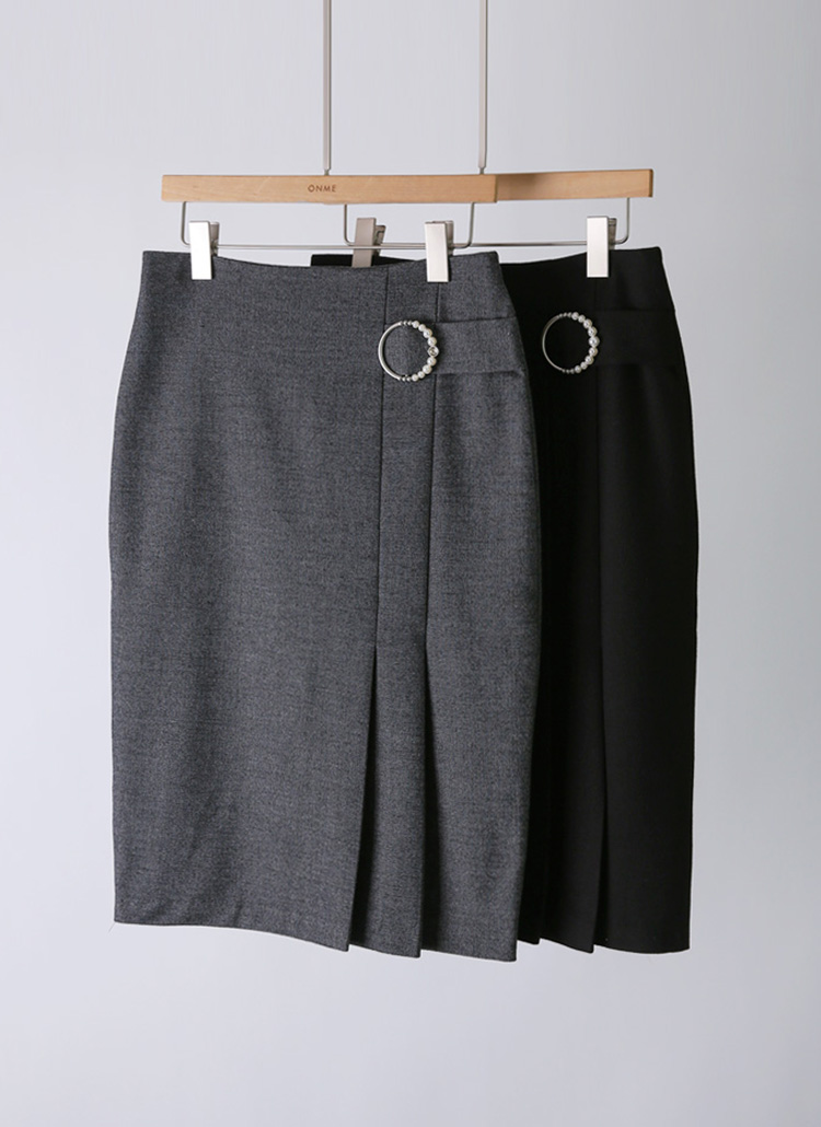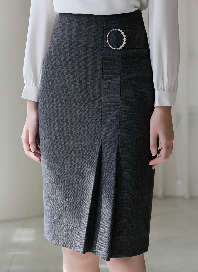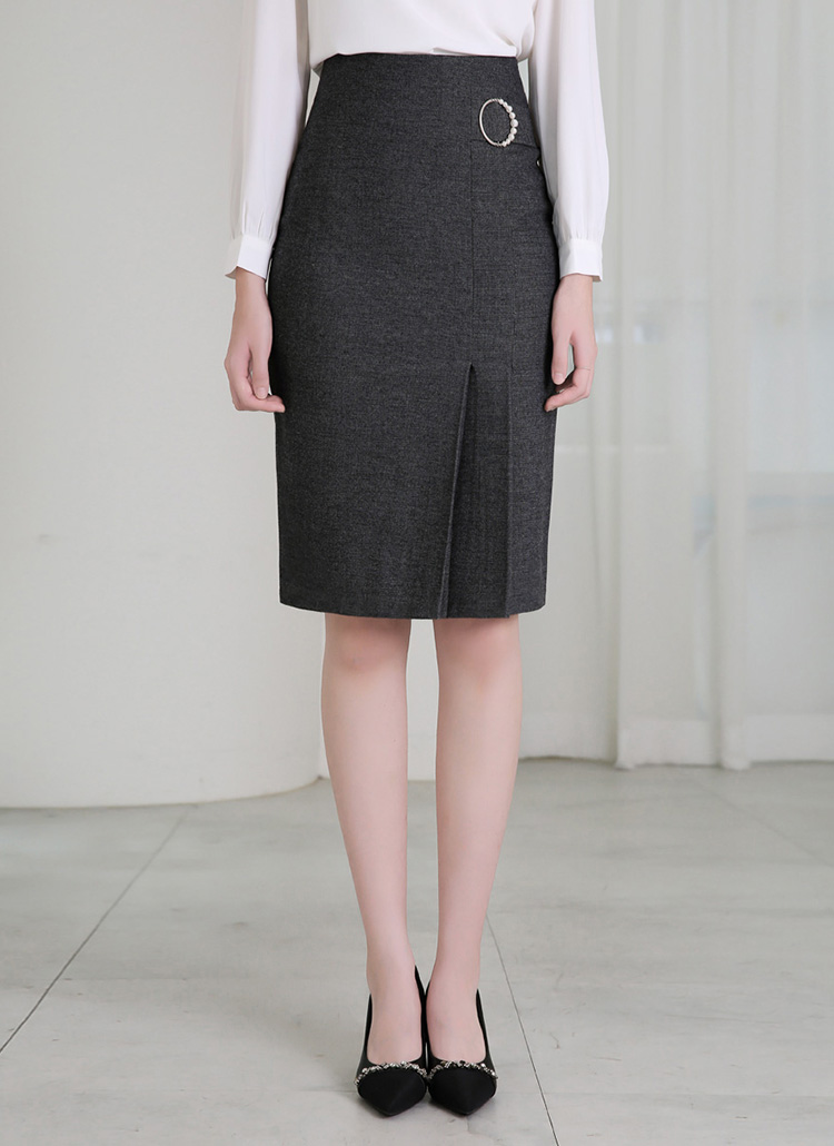 [A sleek H-line midi skirt with front side pleats and pearl buckle detail, creating a feminine yet modern office-to-dinner look.]