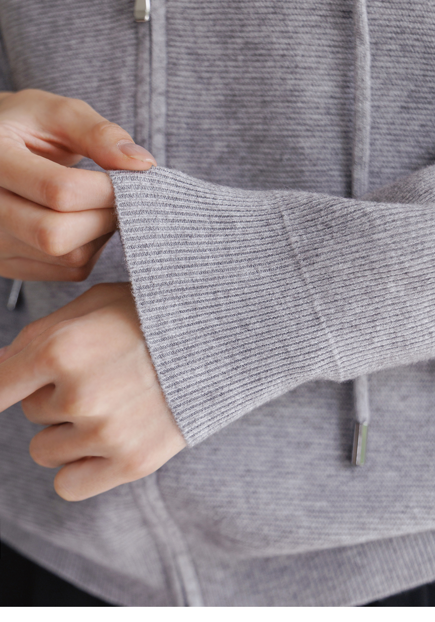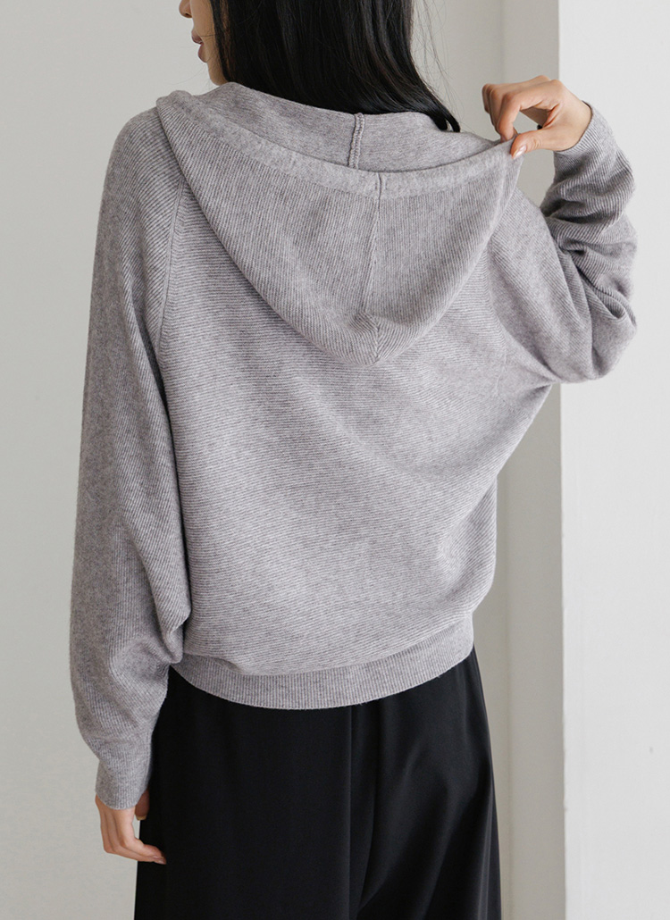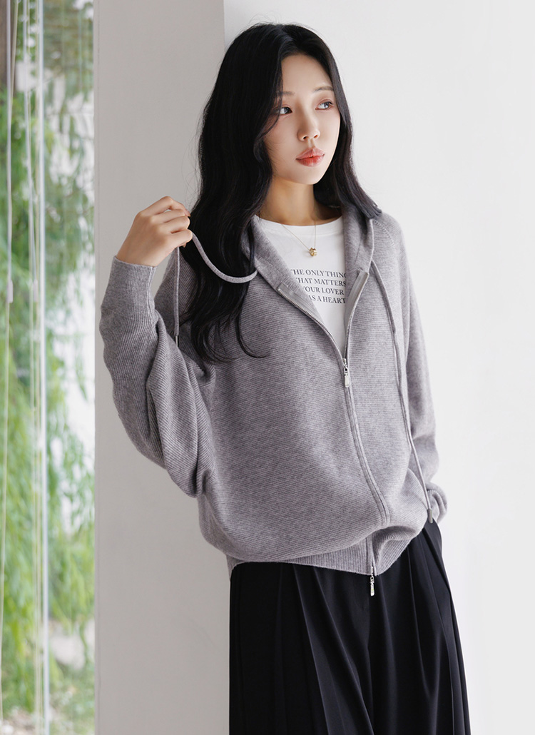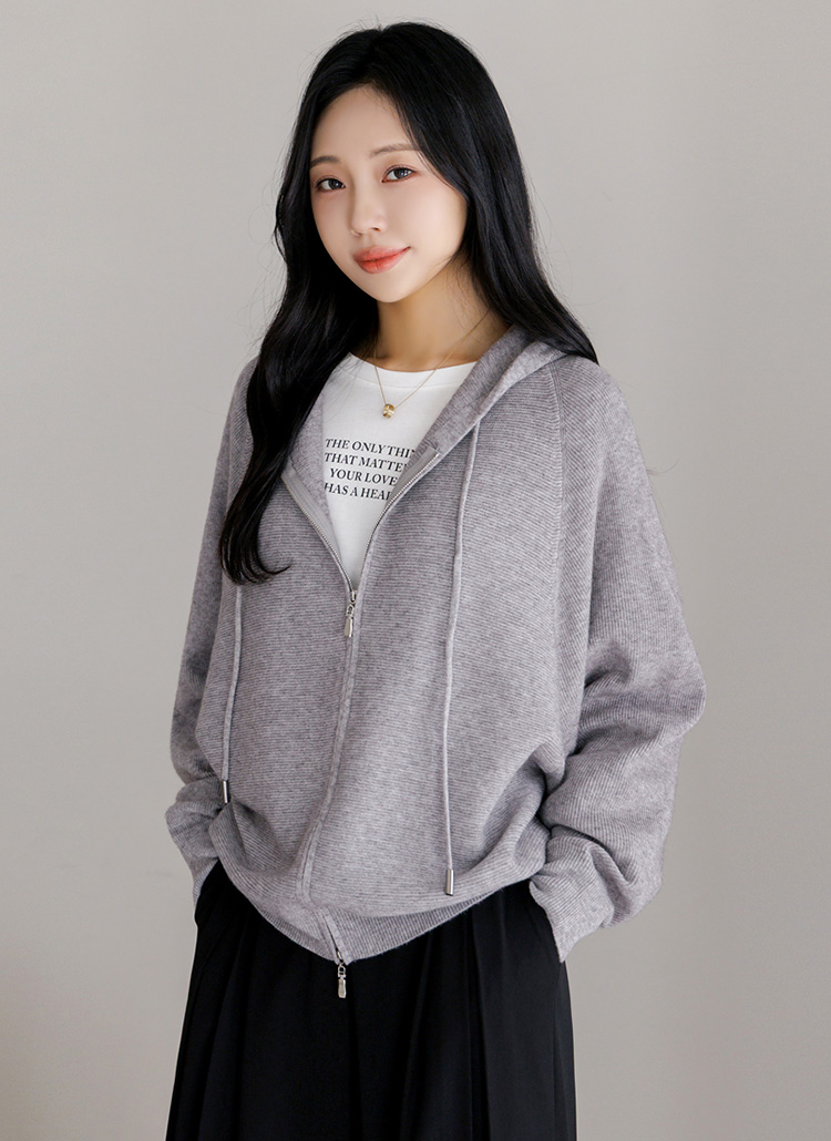 [The Onme] Ribbed Knit Hooded Zip-Up Cardigan