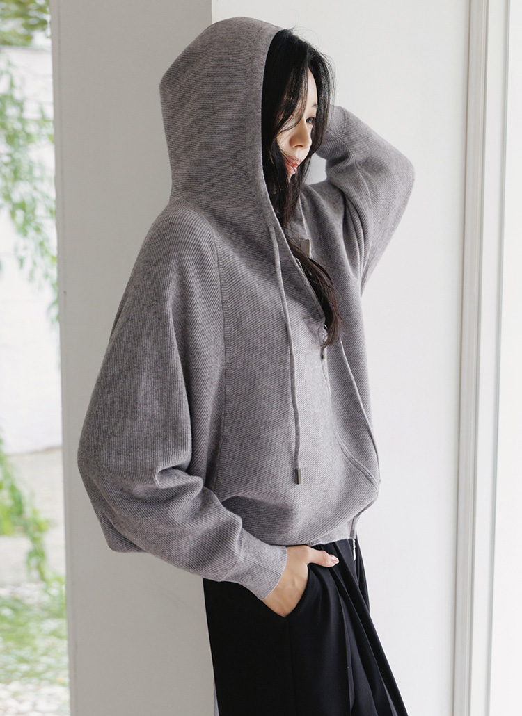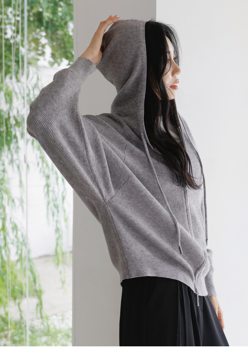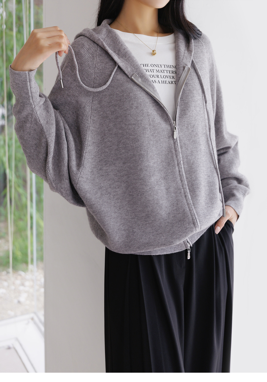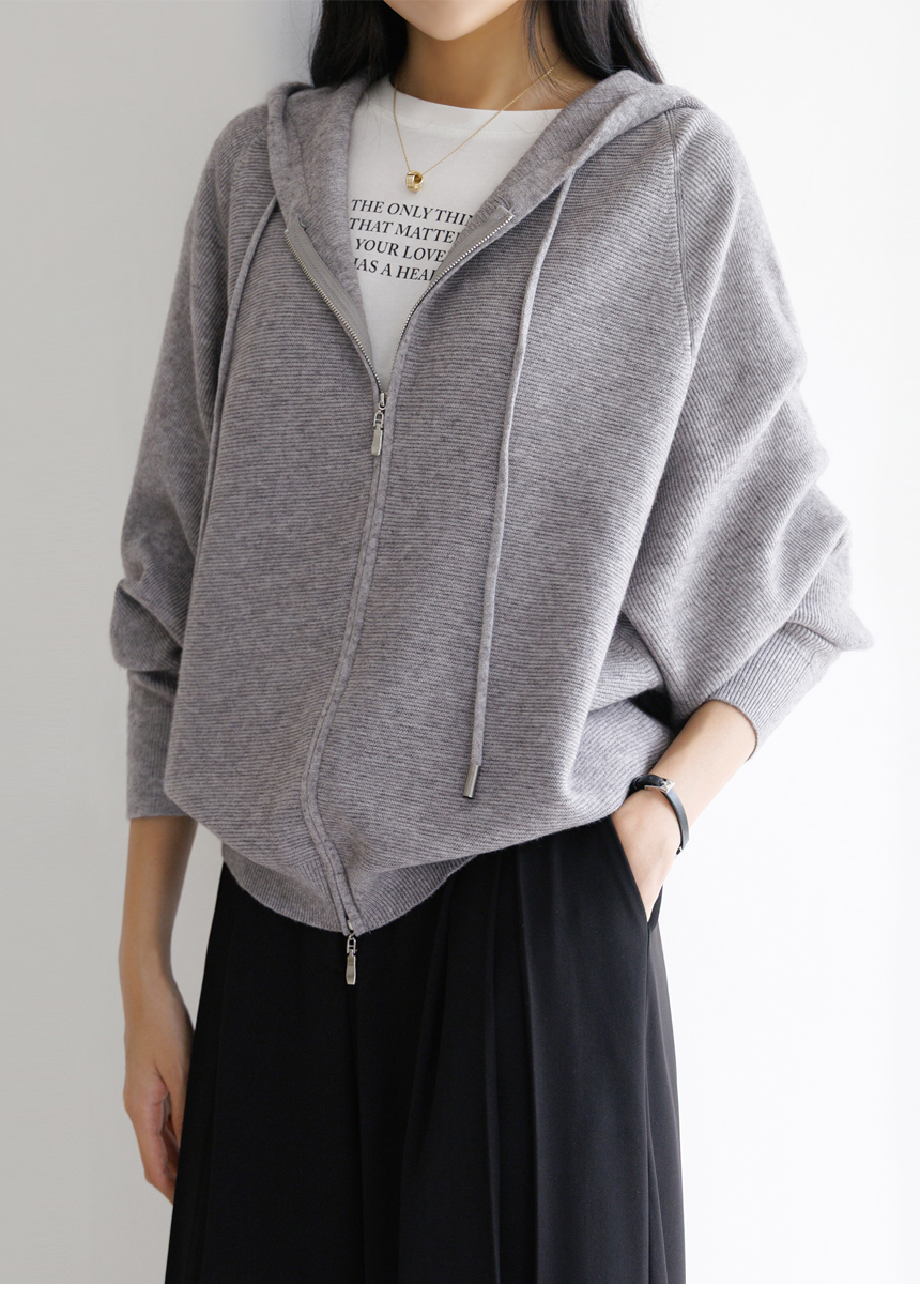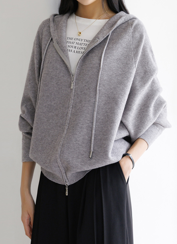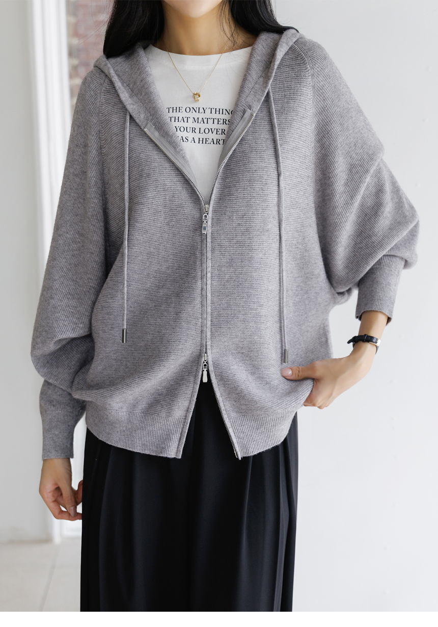 [Loose-fit ribbed cardigan with batwing sleeves and two-way zipper, offering casual comfort with a chic, modern silhouette.]