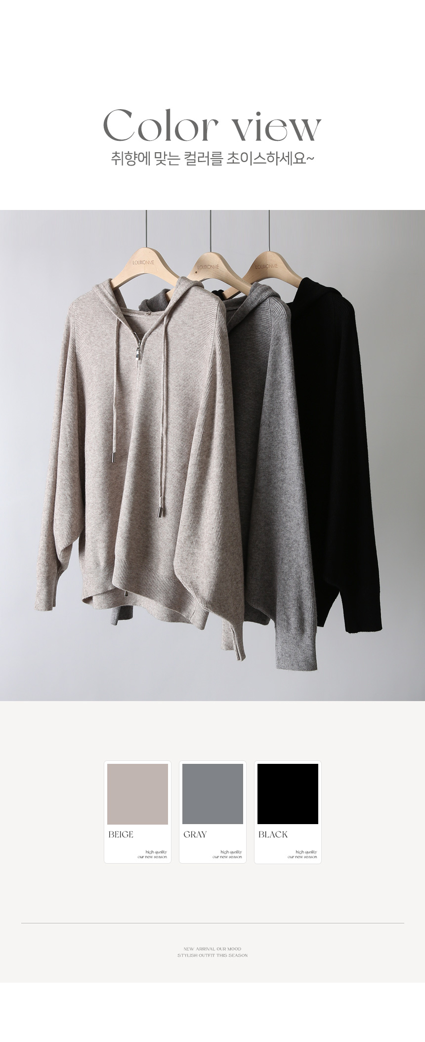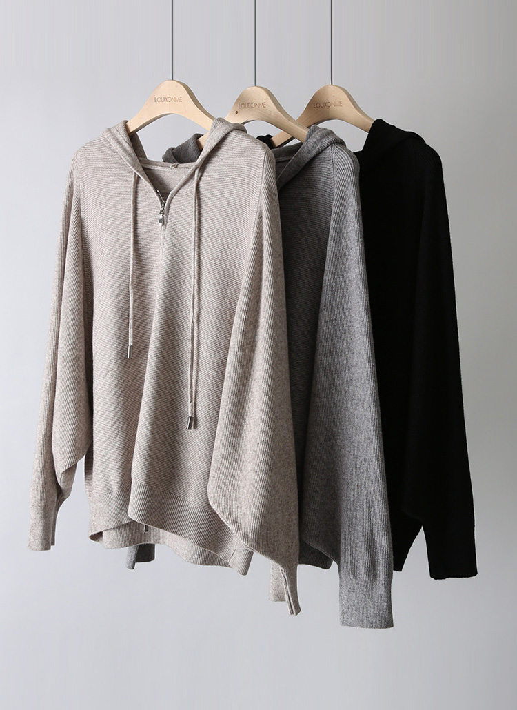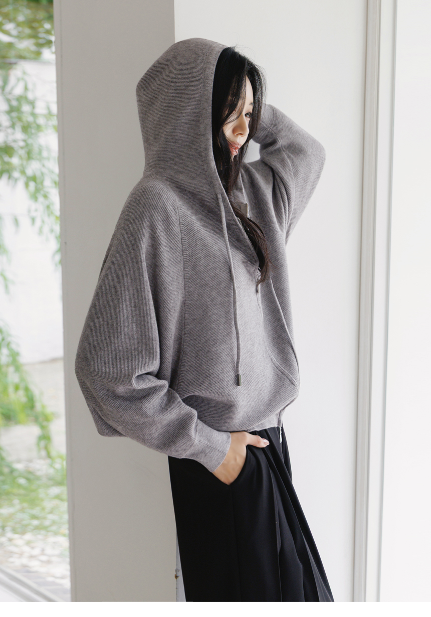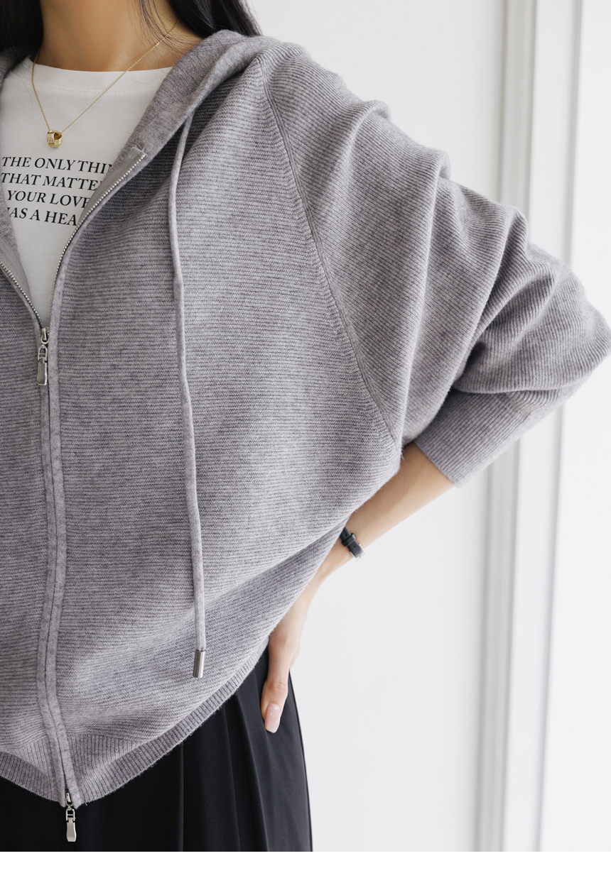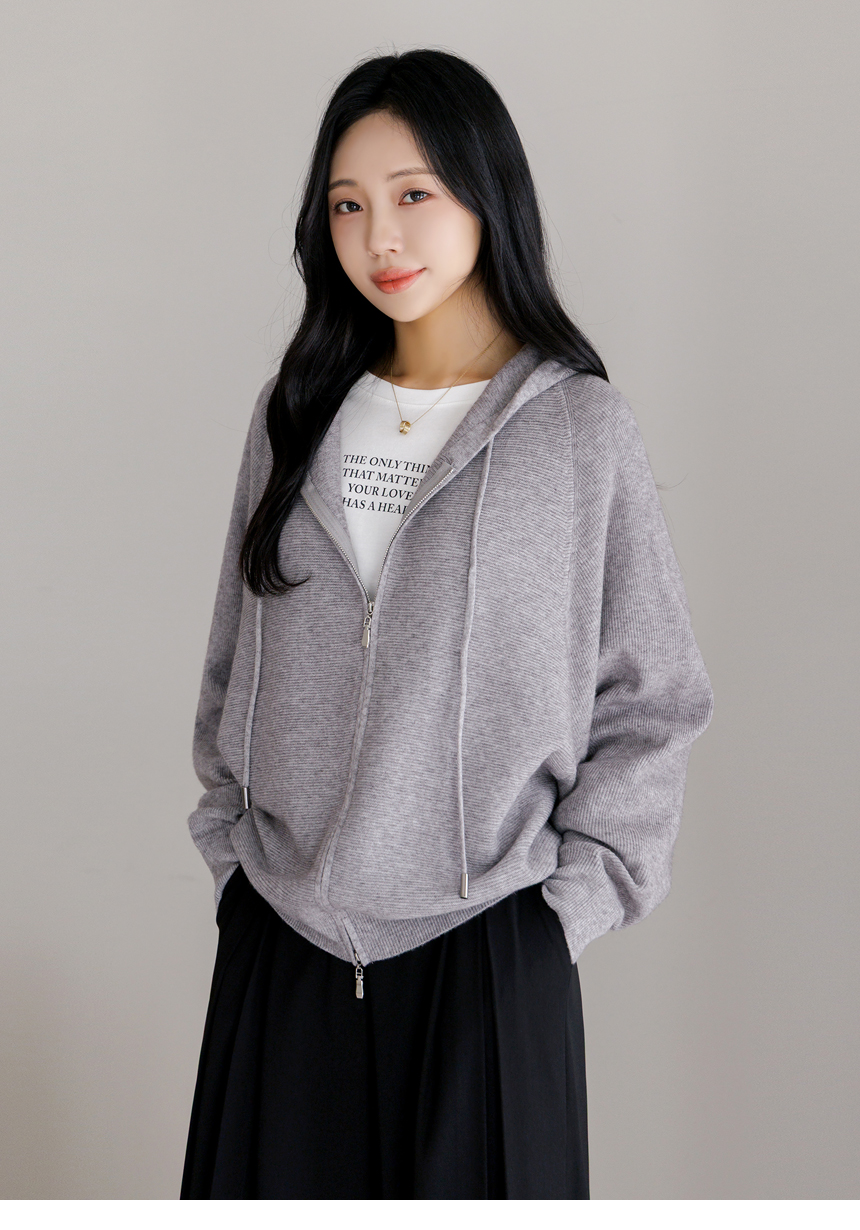 [Loose-fit ribbed cardigan with batwing sleeves and two-way zipper, offering casual comfort with a chic, modern silhouette.]