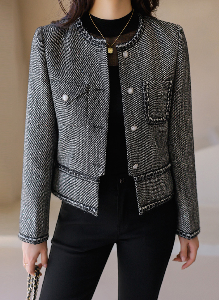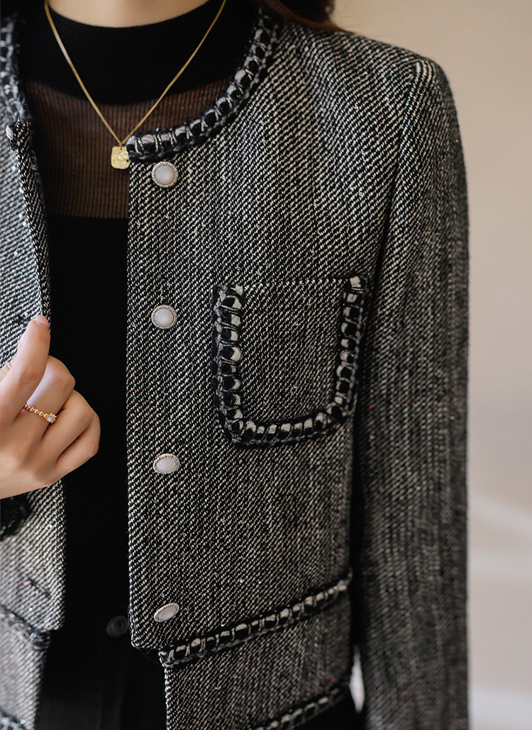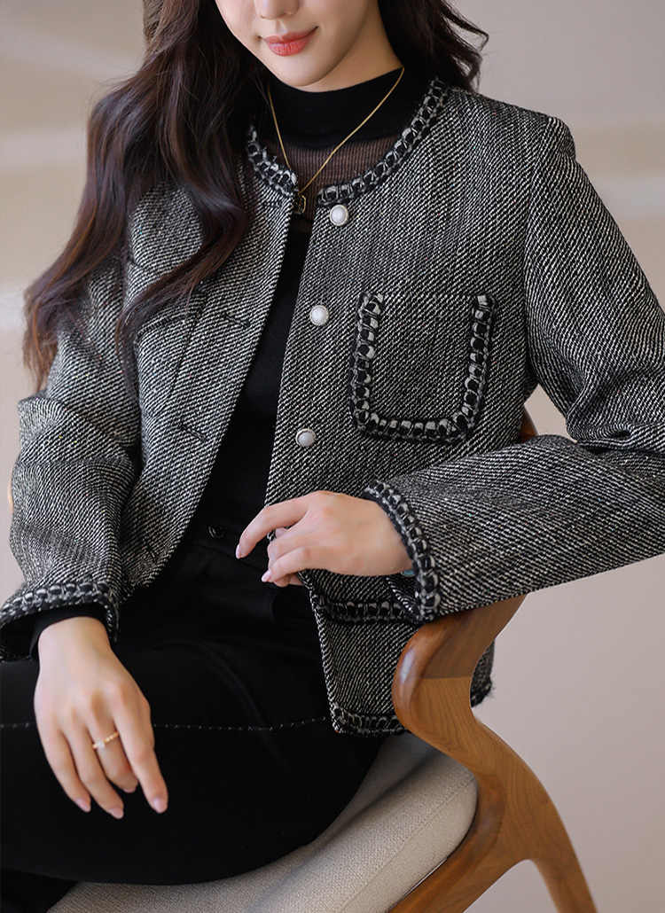 [Elegant tweed jacket in a wool blend with sequin shimmer and braided trim, offering warmth, lightness, and timeless sophistication.]