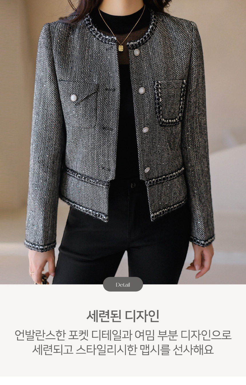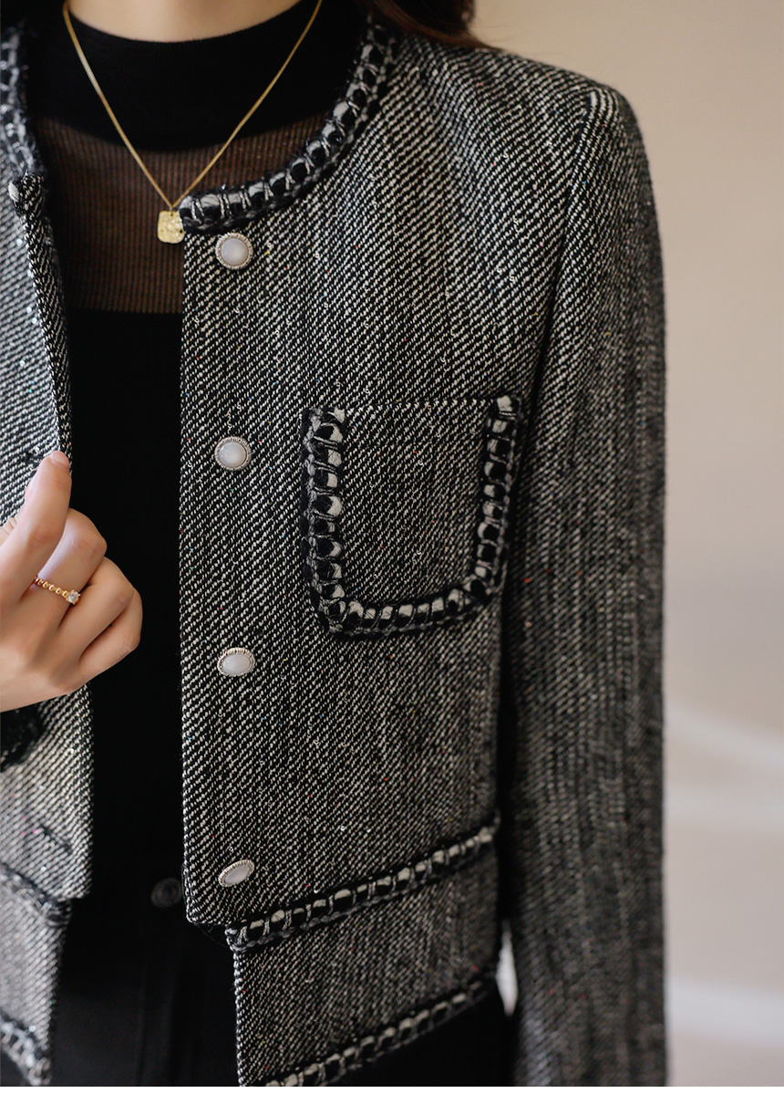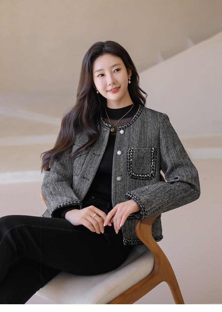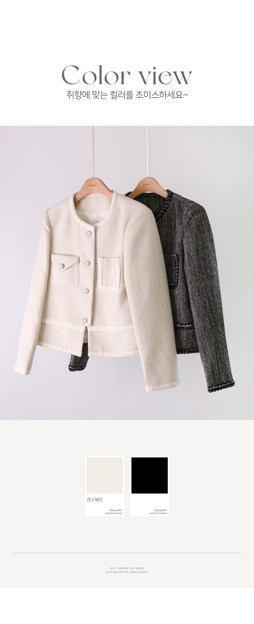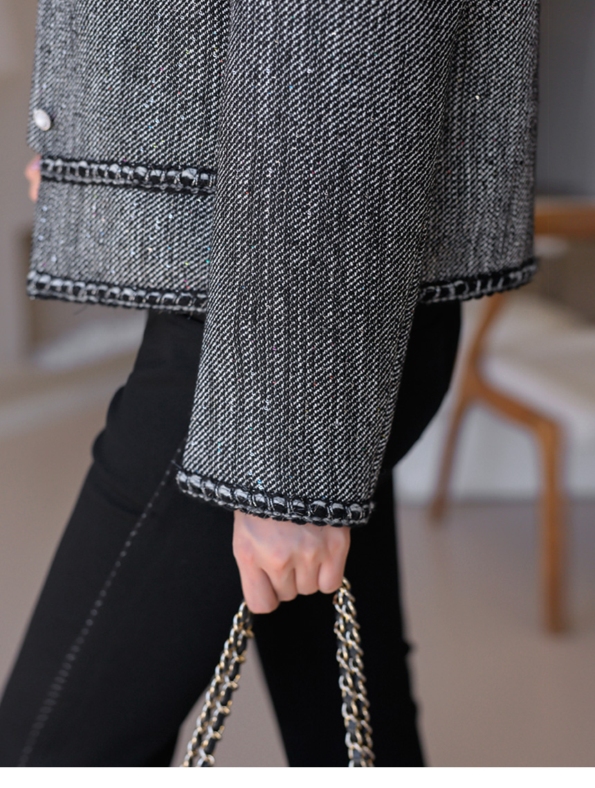 [Elegant tweed jacket in a wool blend with sequin shimmer and braided trim, offering warmth, lightness, and timeless sophistication.]