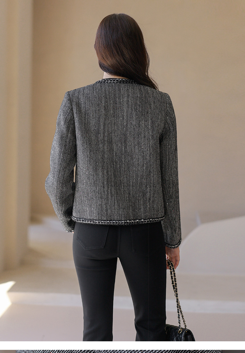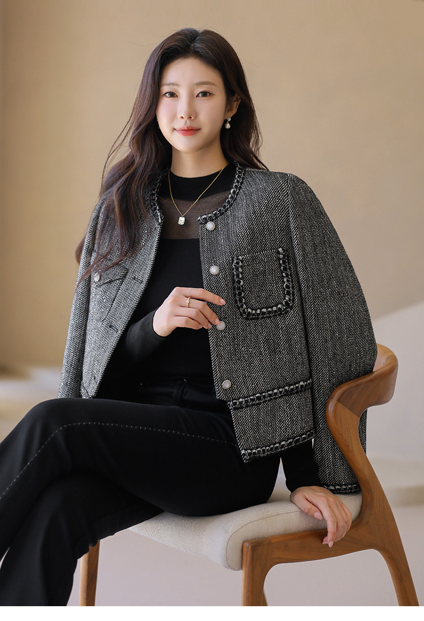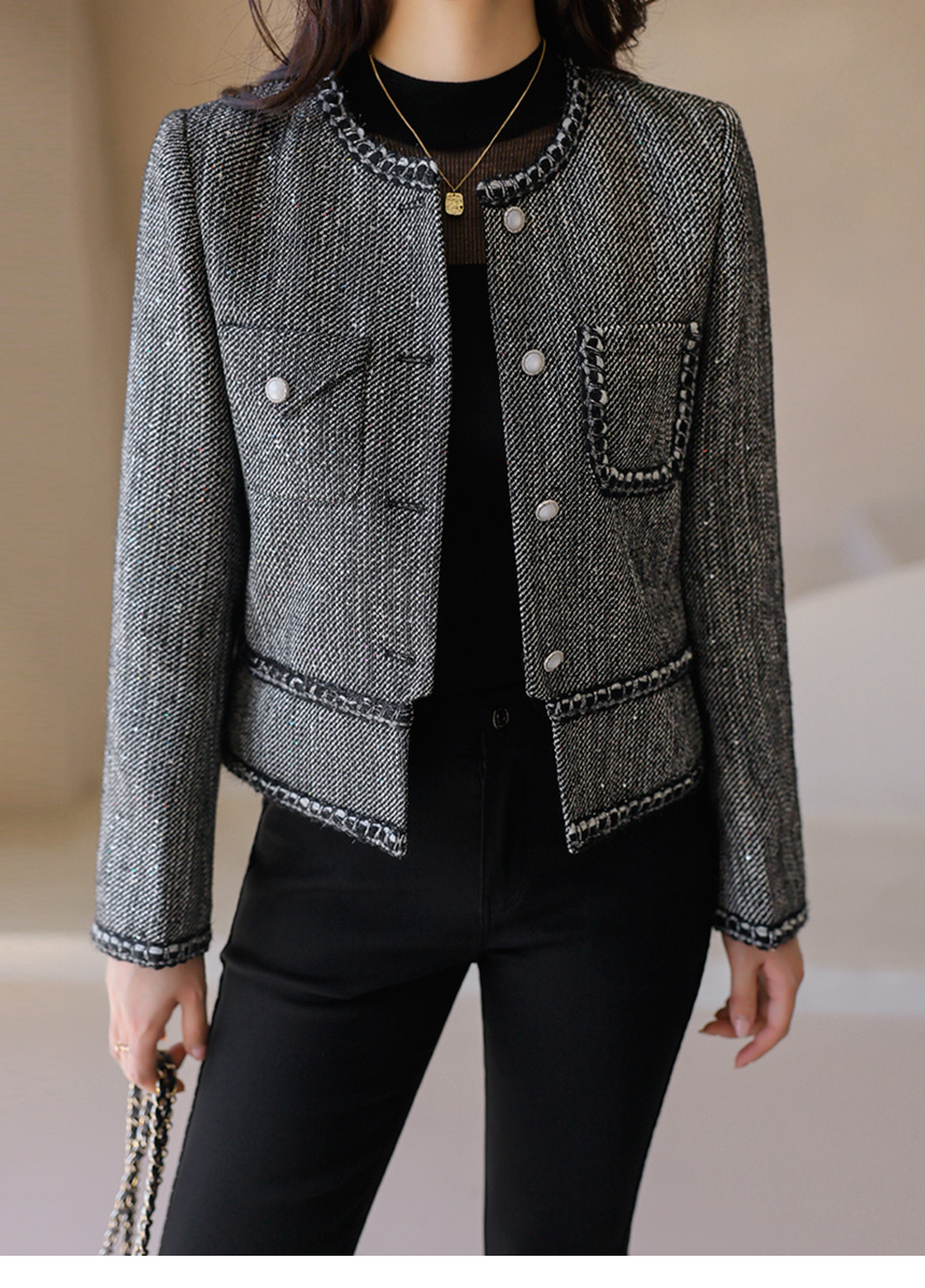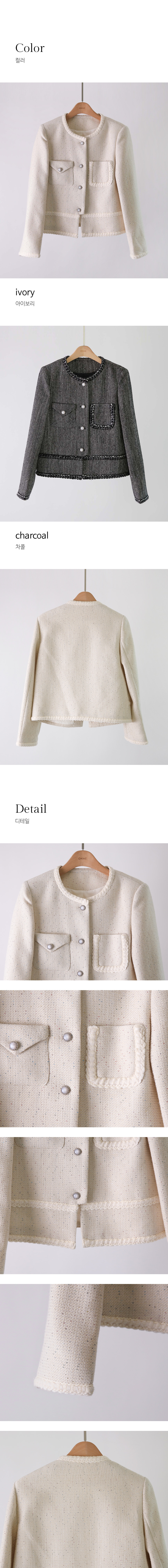 [Elegant tweed jacket in a wool blend with sequin shimmer and braided trim, offering warmth, lightness, and timeless sophistication.]