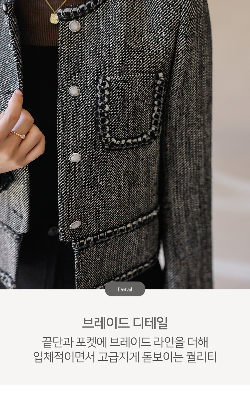 구조적인 브레이드 라인 디테일이 넥라인과 끝단을 장식하여