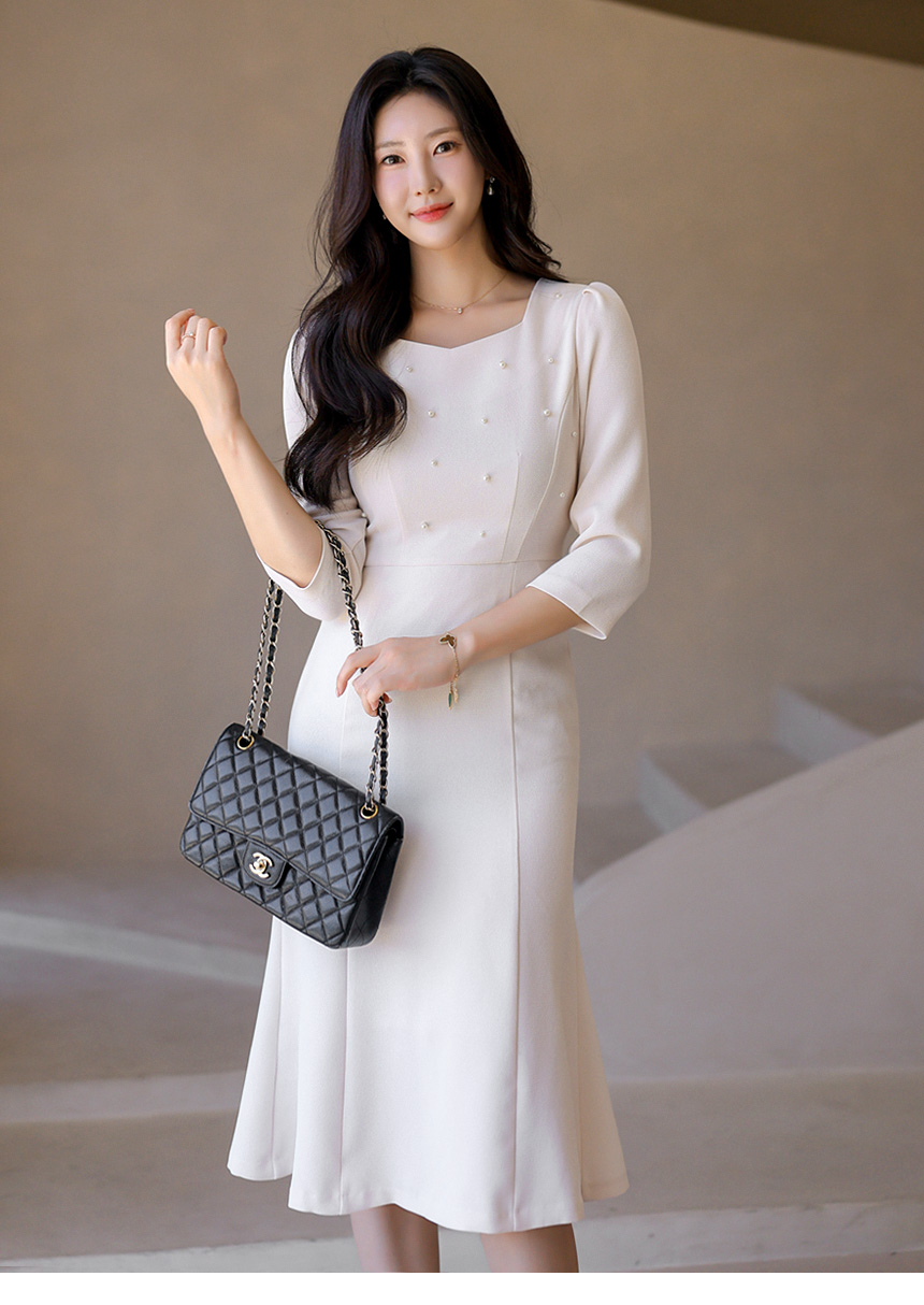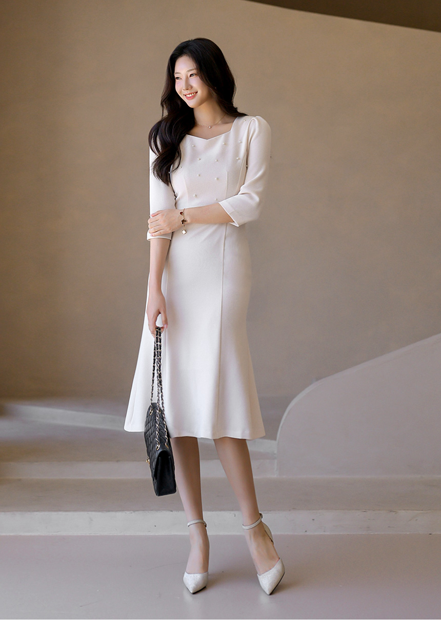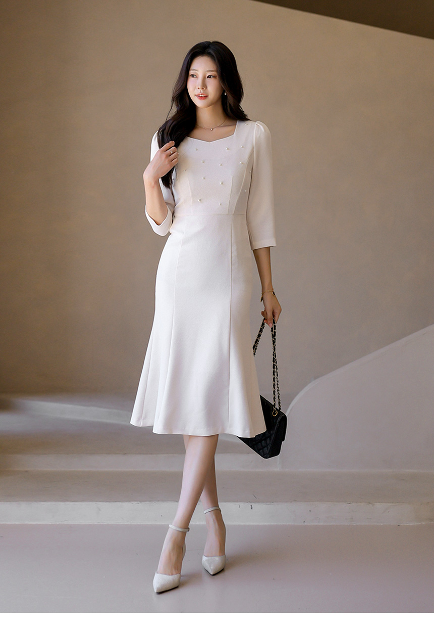 [Graceful midi dress with a heart neckline and pearl accents, tailored slim with a mermaid line for timeless elegance at formal events.]