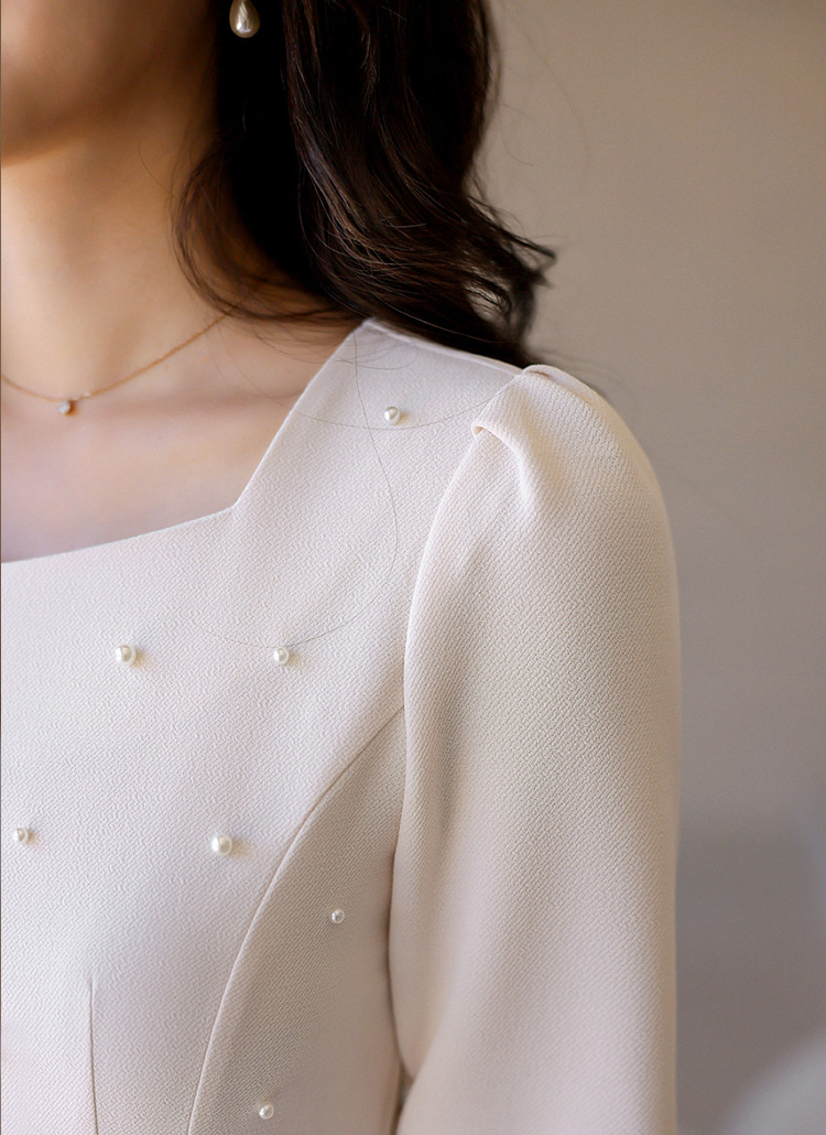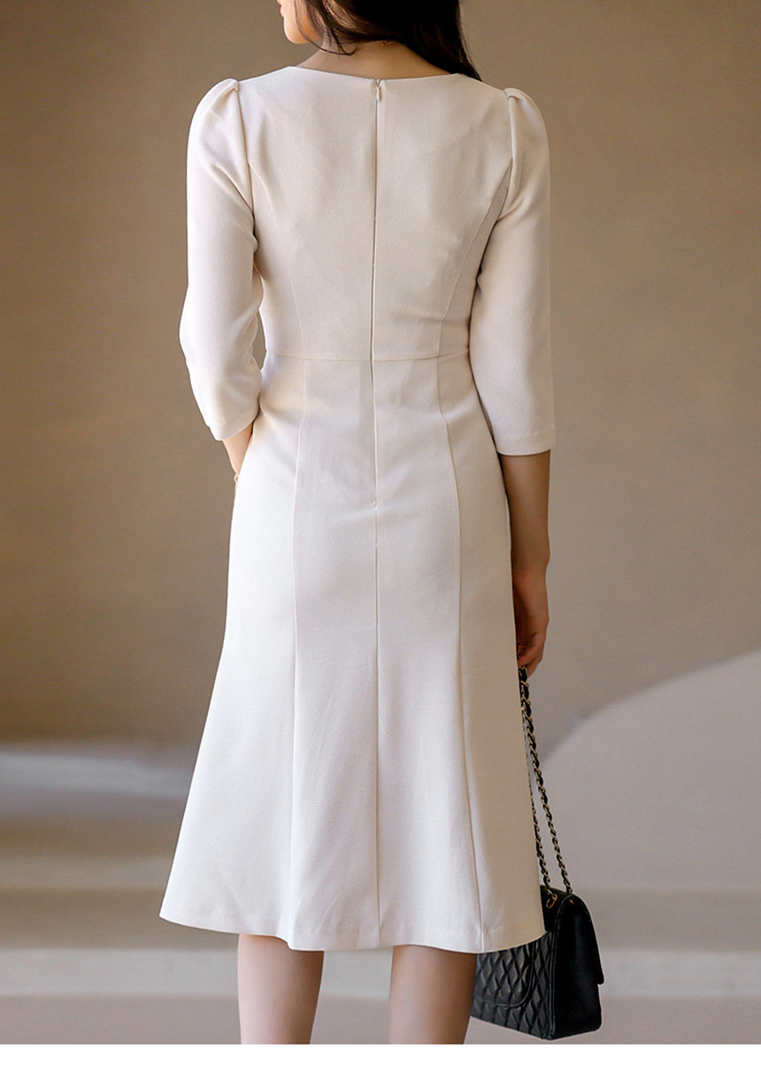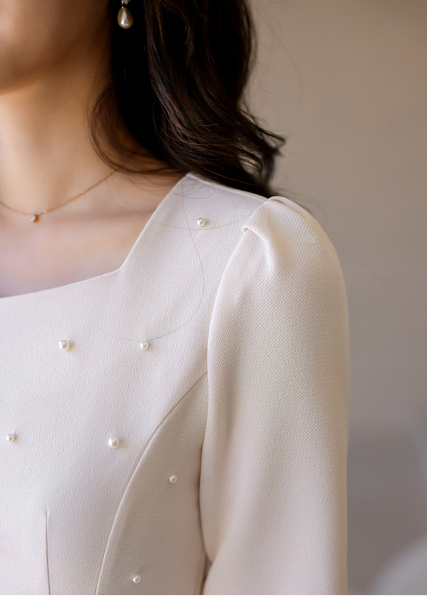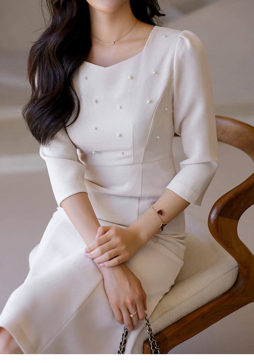 [Graceful midi dress with a heart neckline and pearl accents, tailored slim with a mermaid line for timeless elegance at formal events.]
