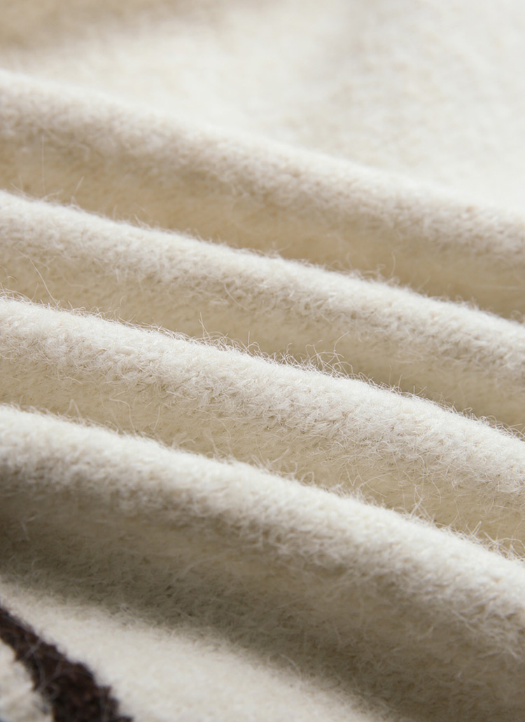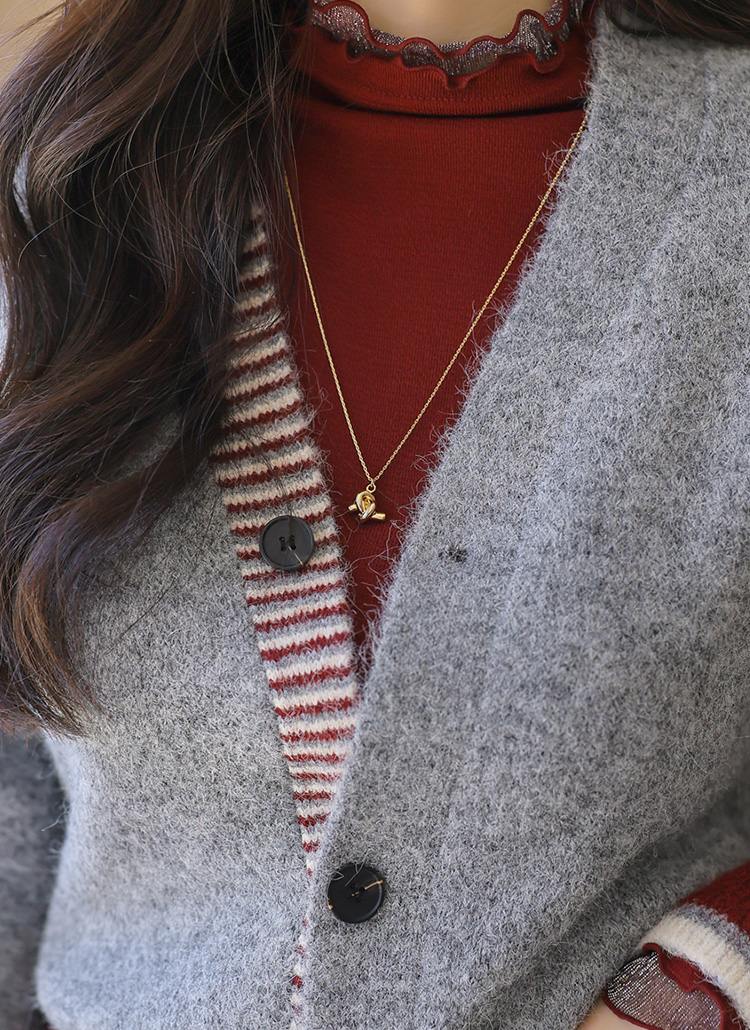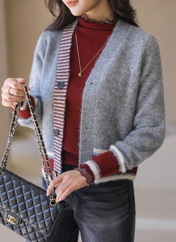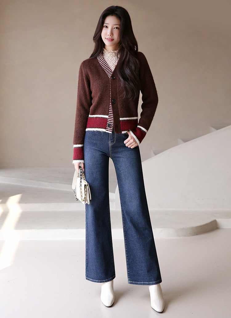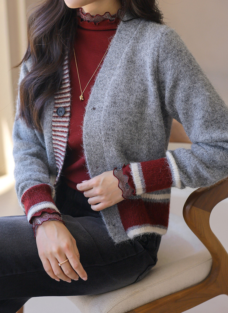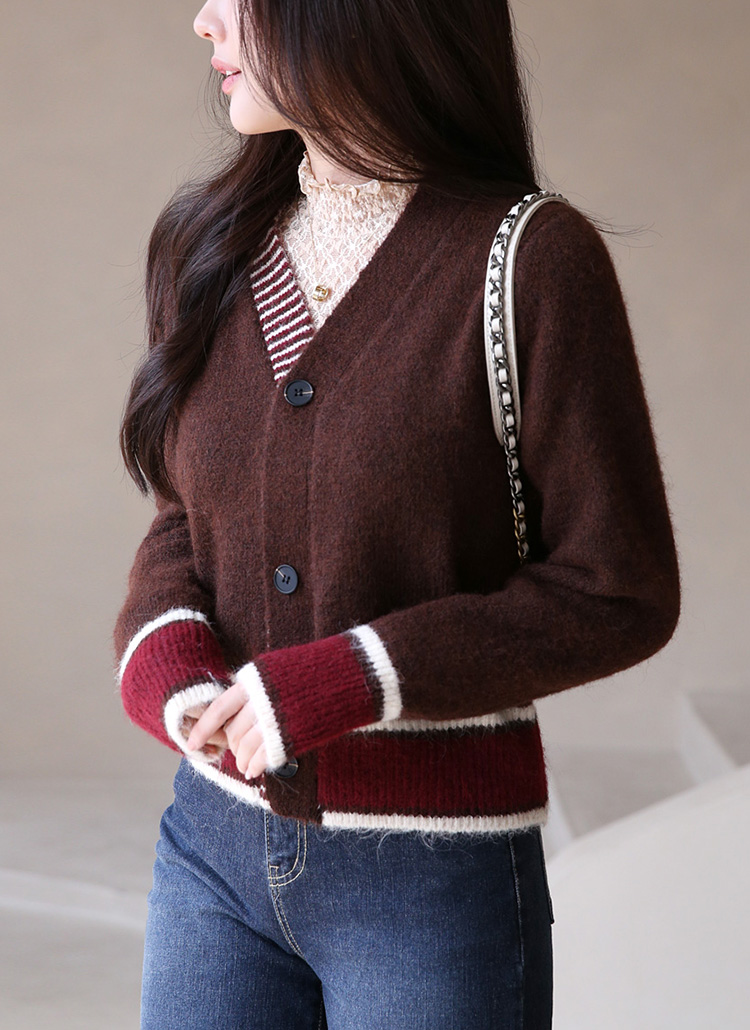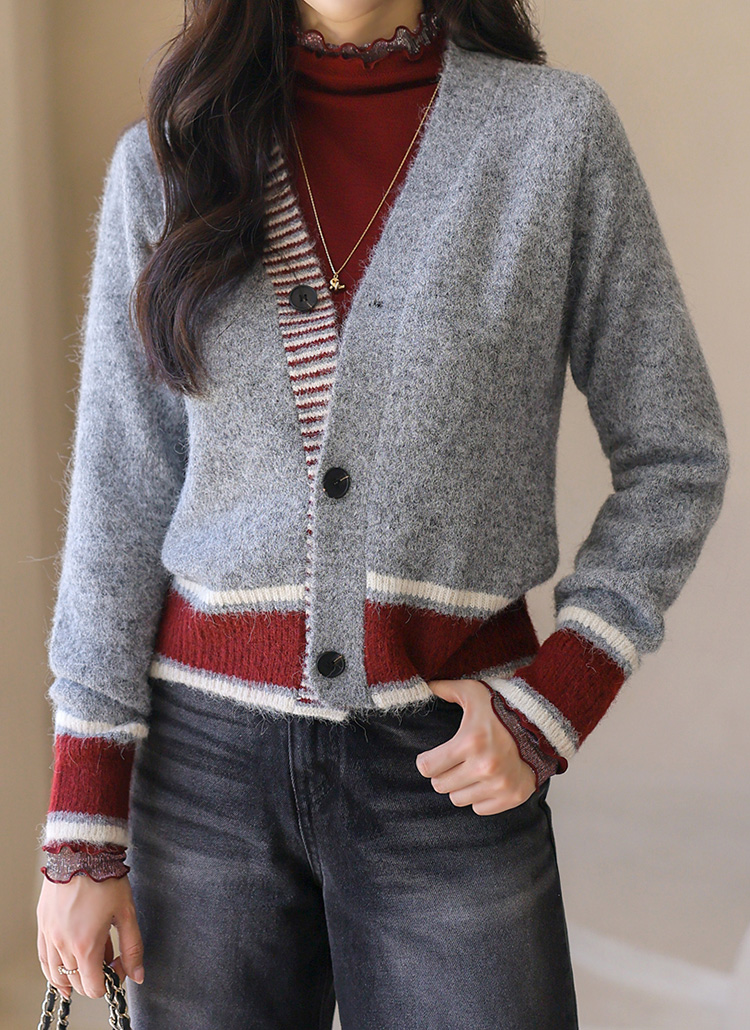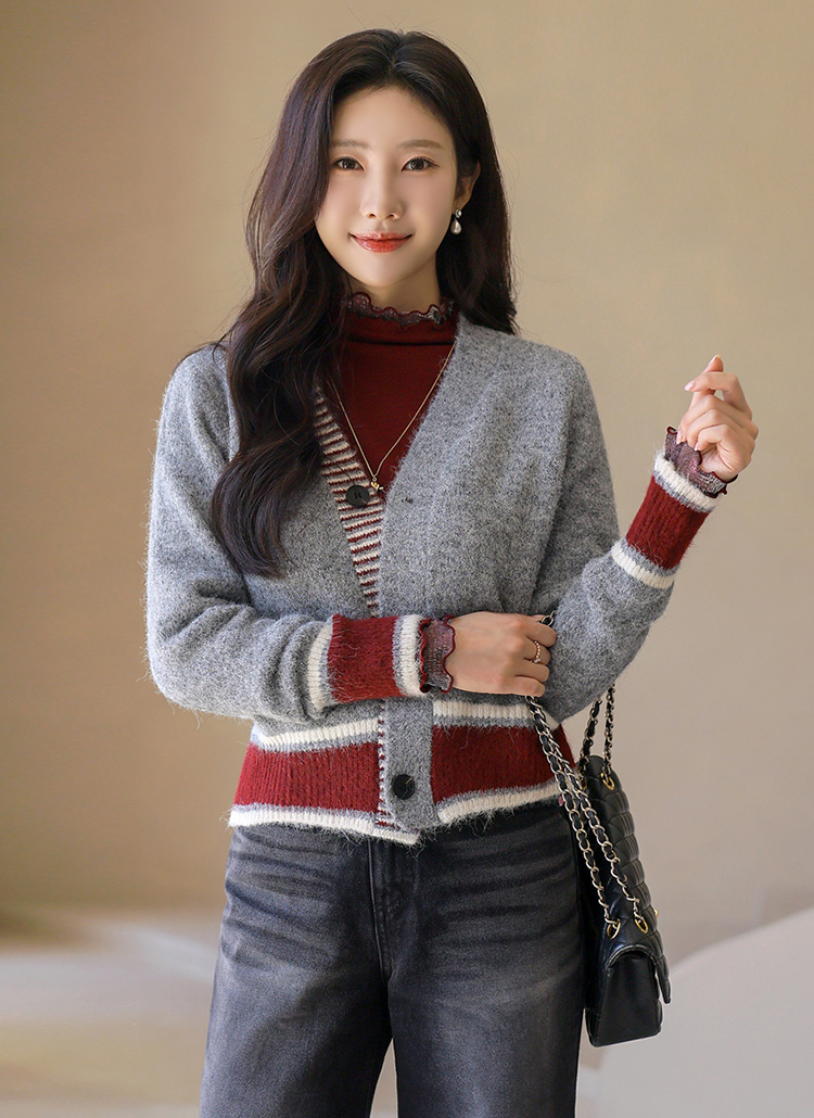 [Versatile wool-blend knit cardigan featuring color block accents and refined trims, elevating casual outfits with cozy charm.]