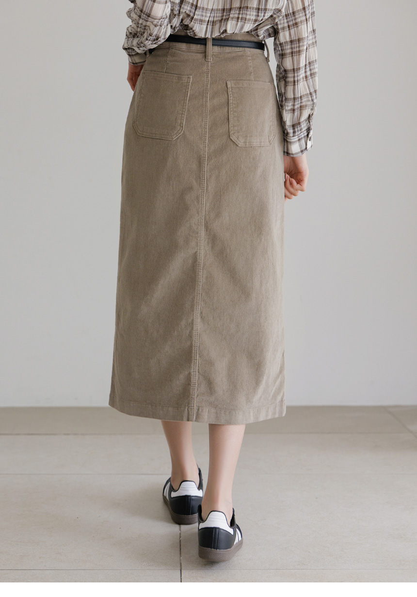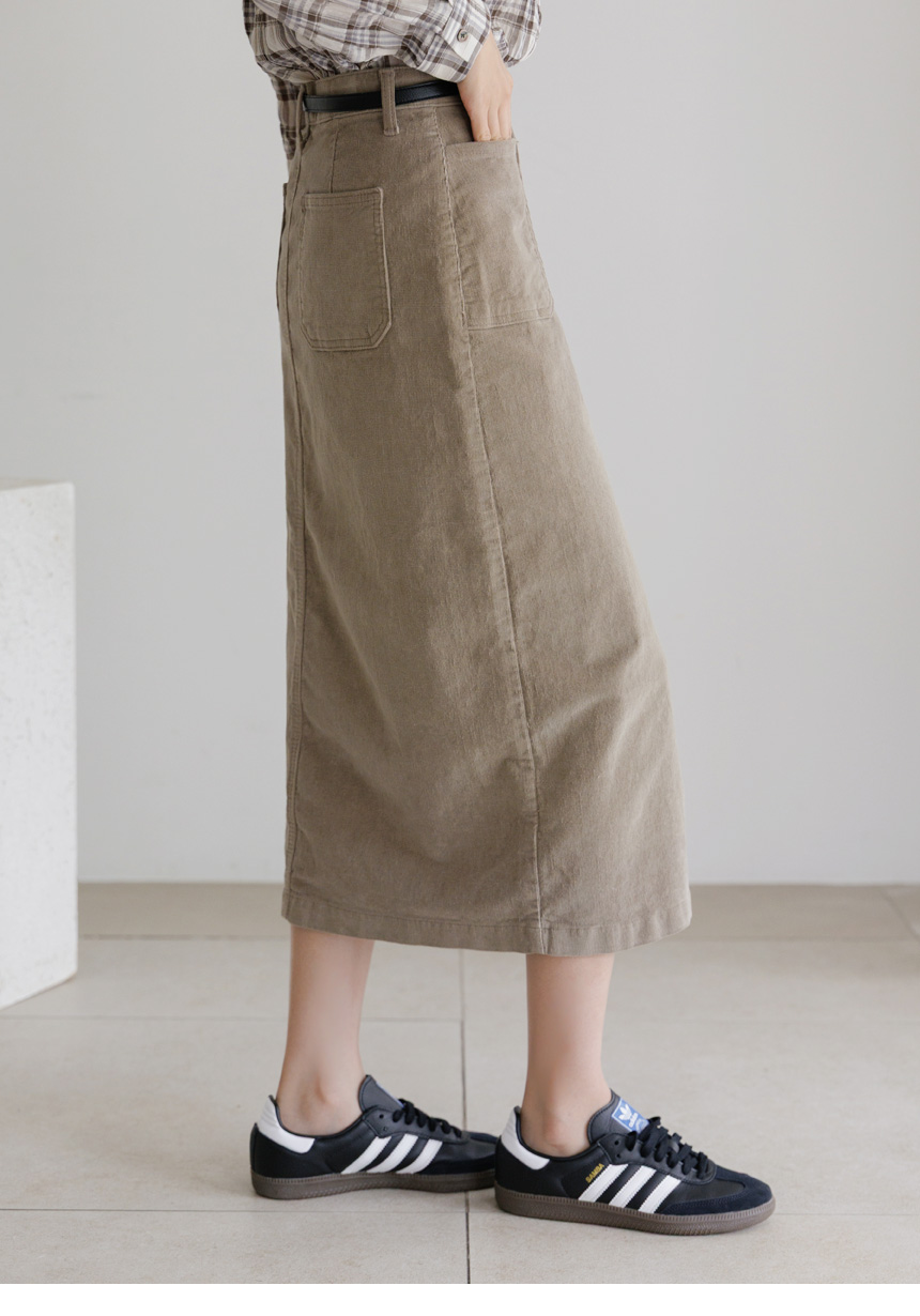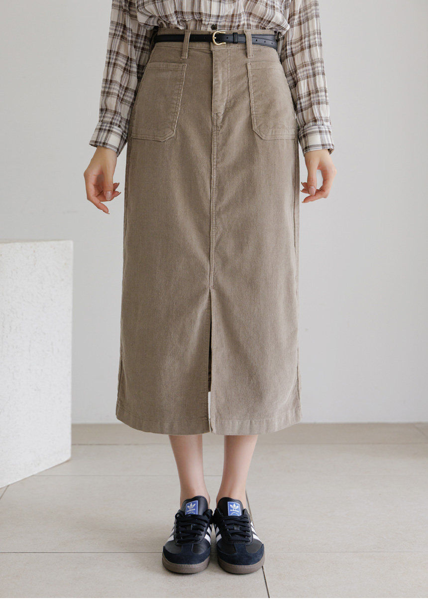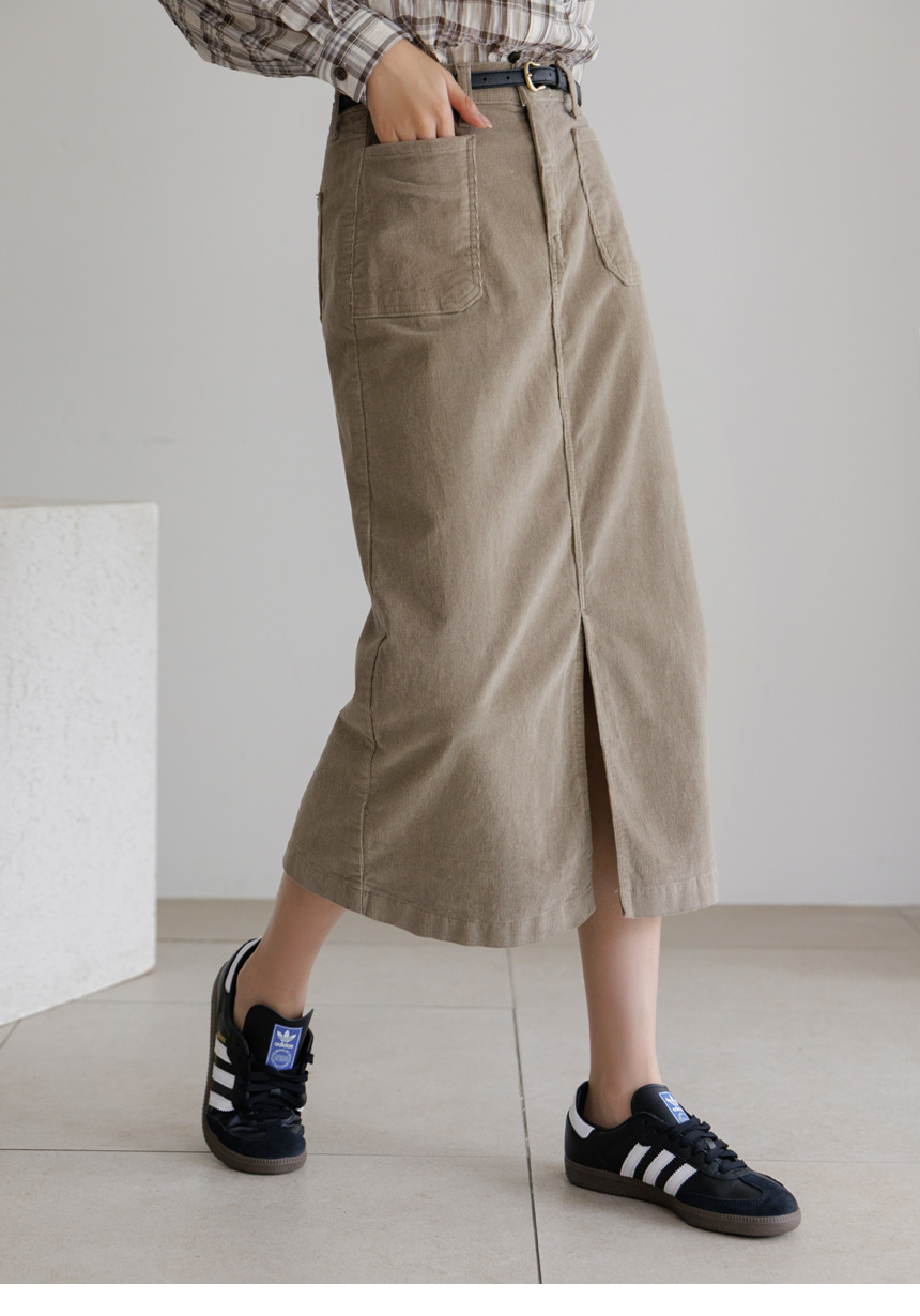 [Casual yet feminine corduroy skirt with a sleek H-line fit, front slit, and pocket detail, perfect for versatile fall and winter styling.]