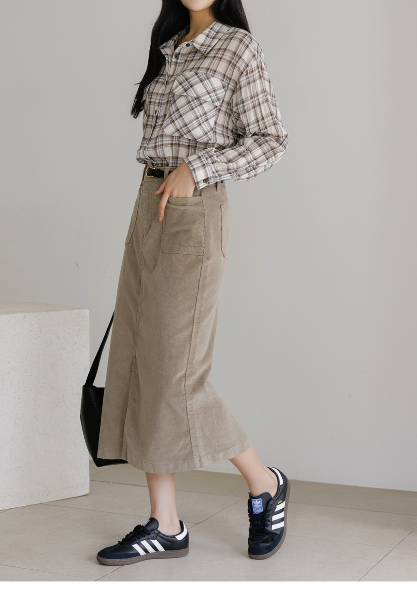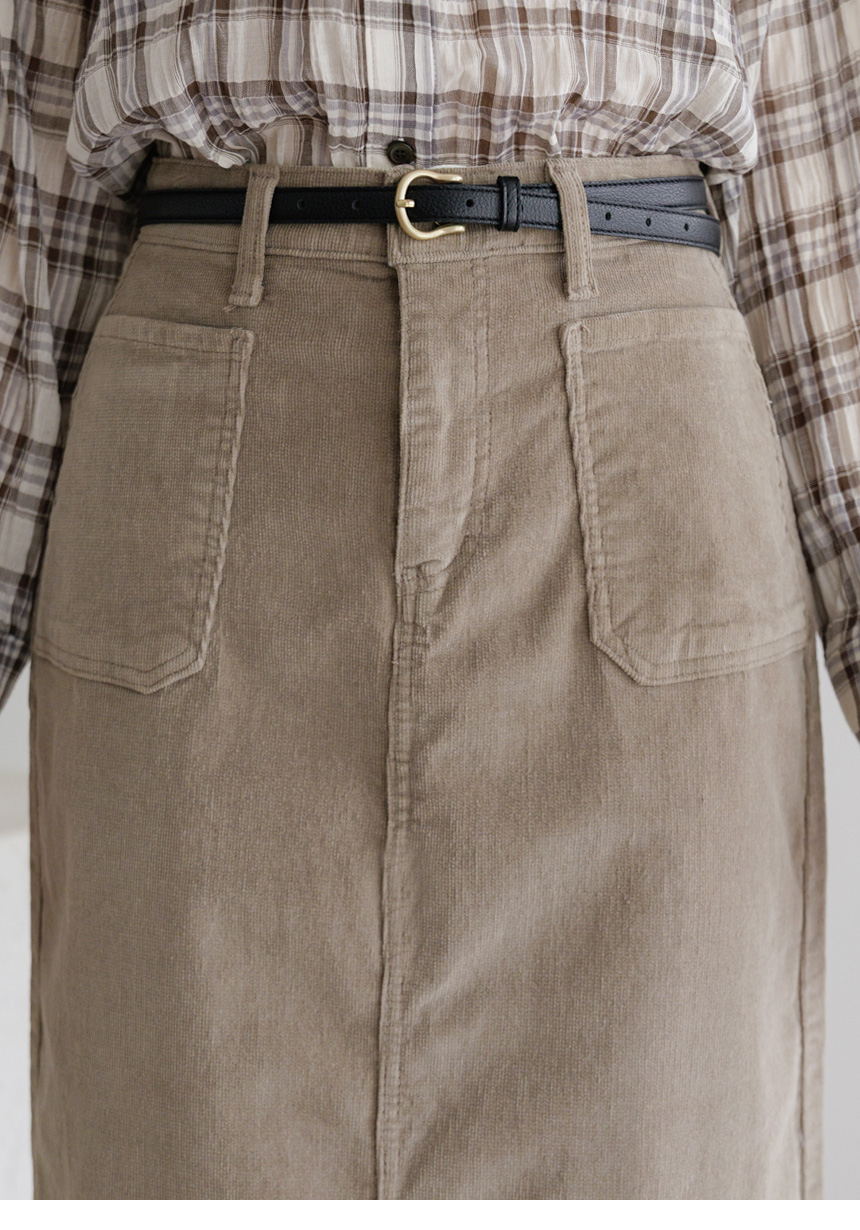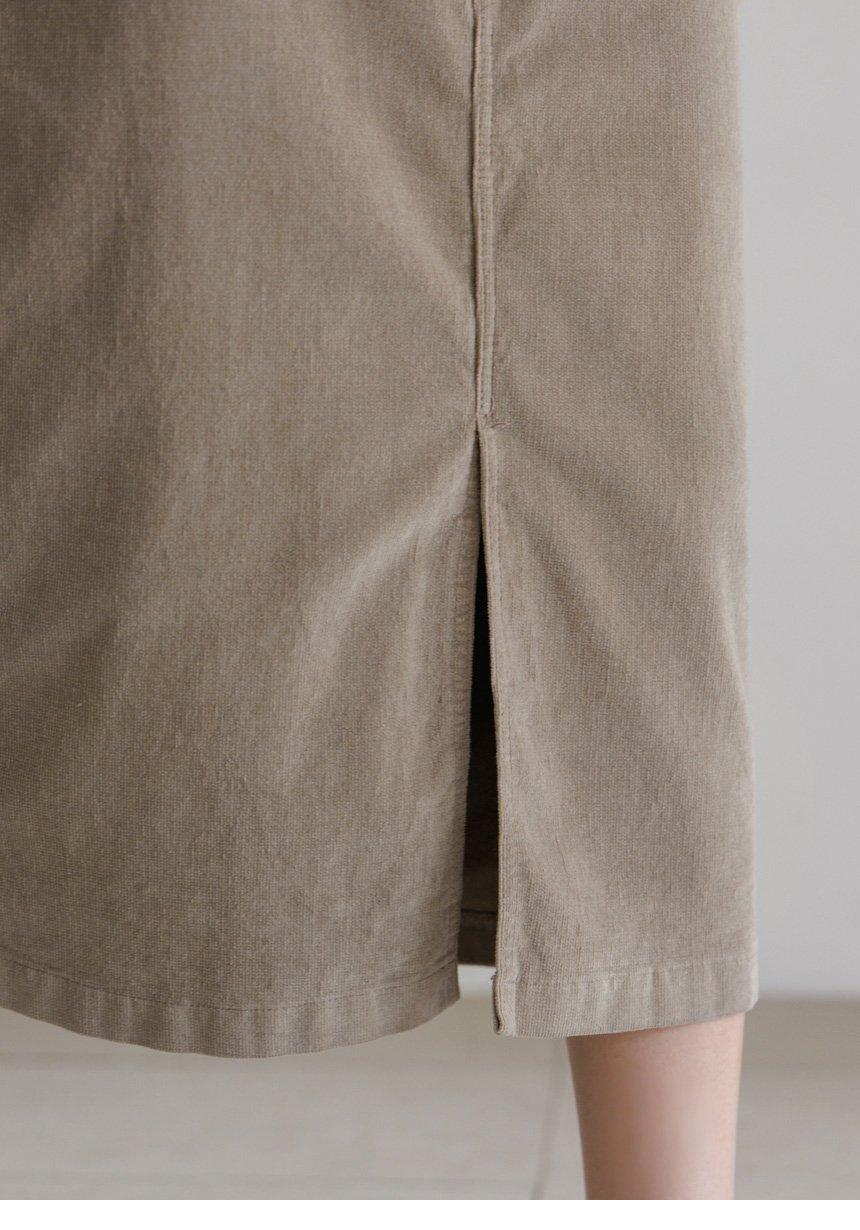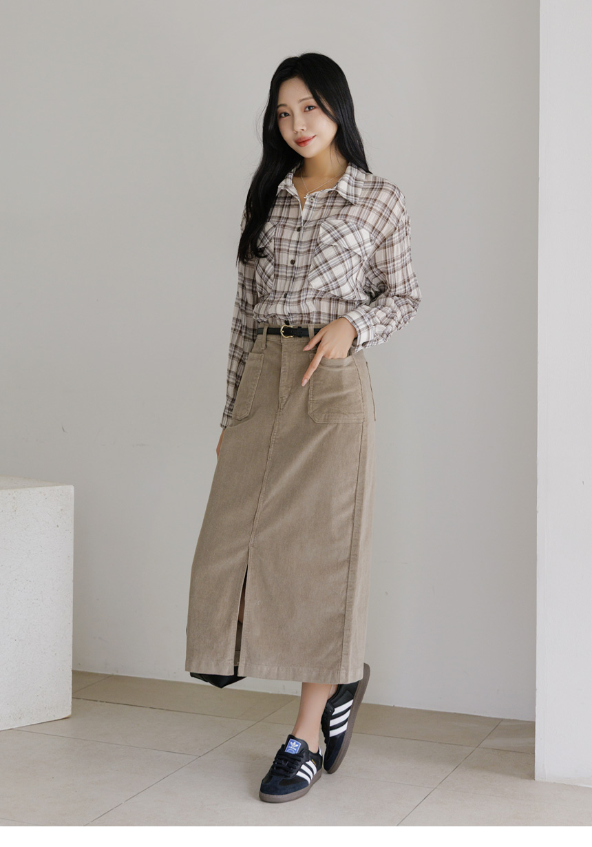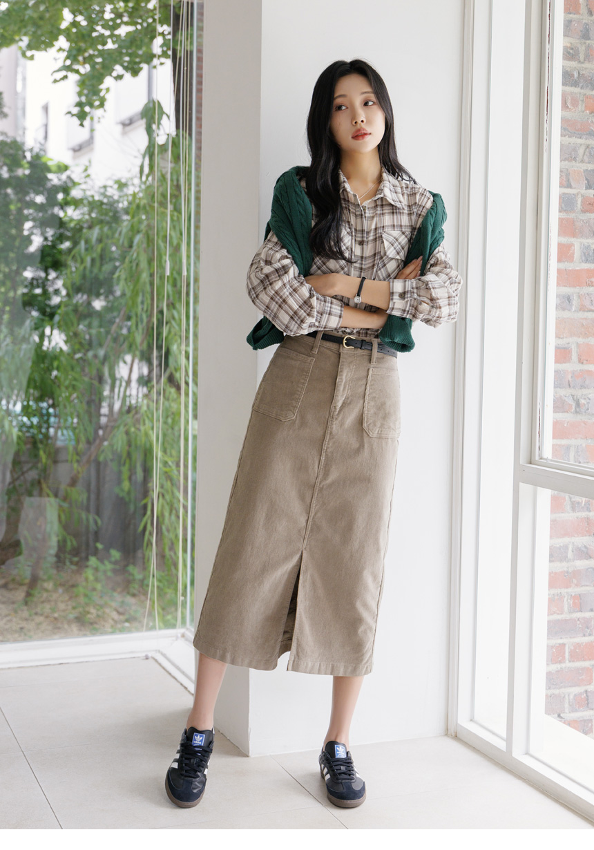 [Casual yet feminine corduroy skirt with a sleek H-line fit, front slit, and pocket detail, perfect for versatile fall and winter styling.]