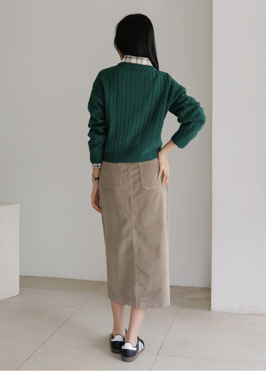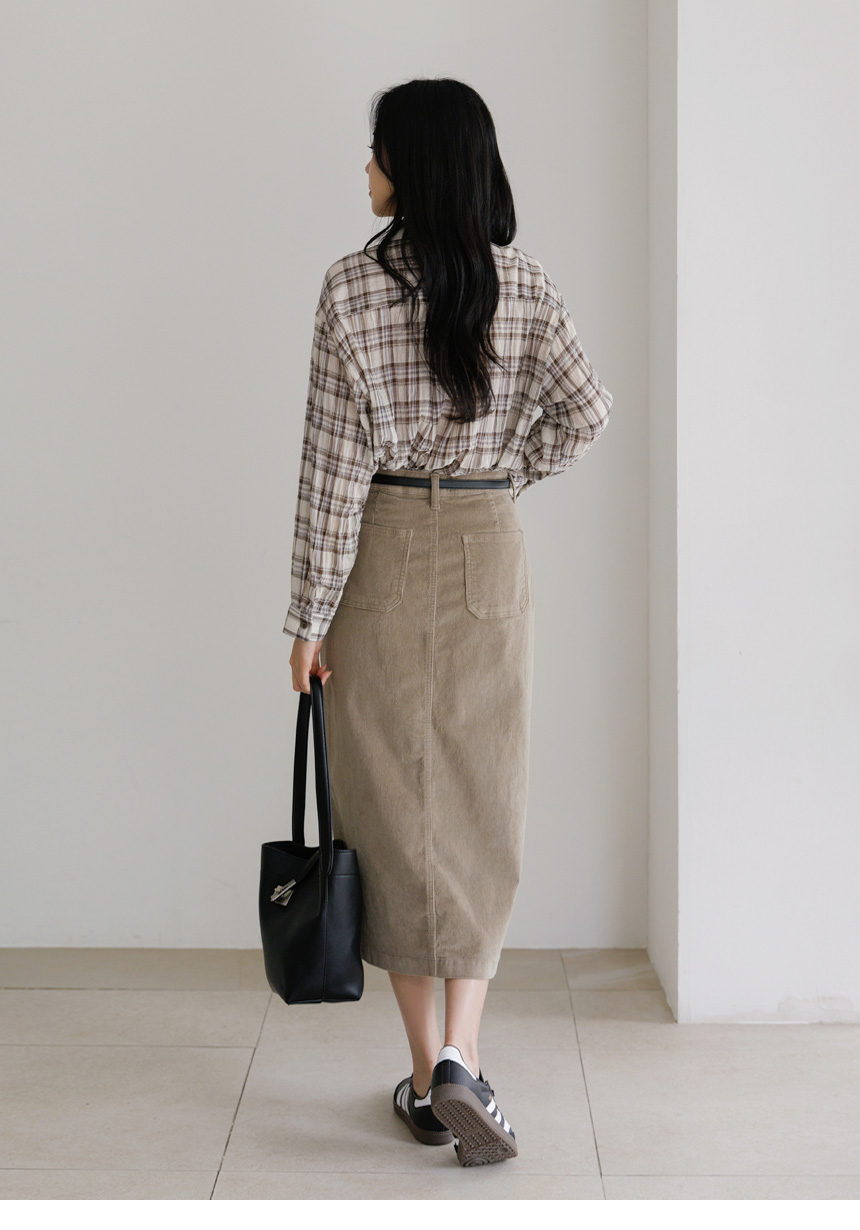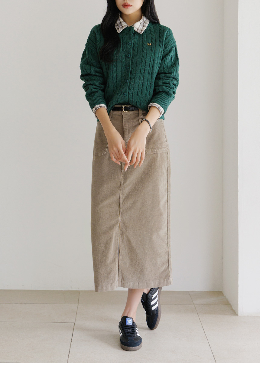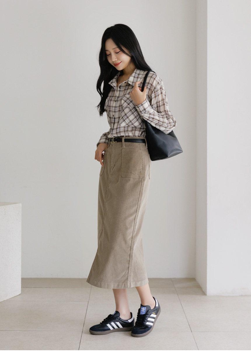 [Casual yet feminine corduroy skirt with a sleek H-line fit, front slit, and pocket detail, perfect for versatile fall and winter styling.]