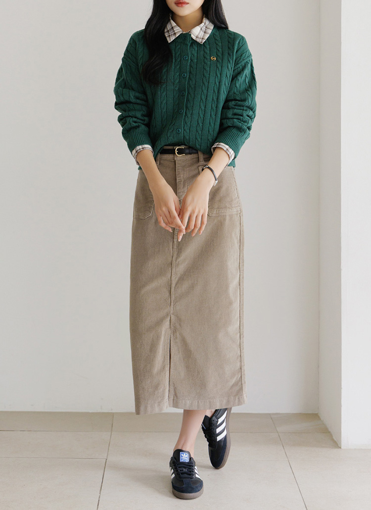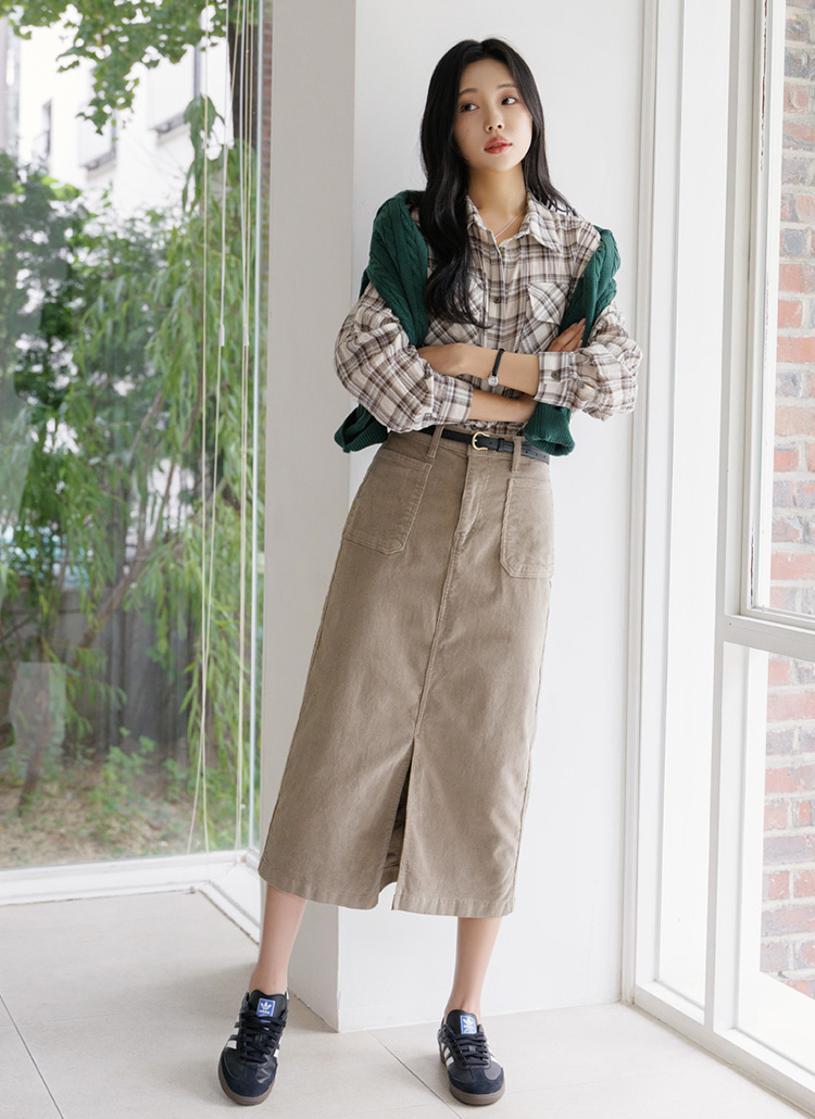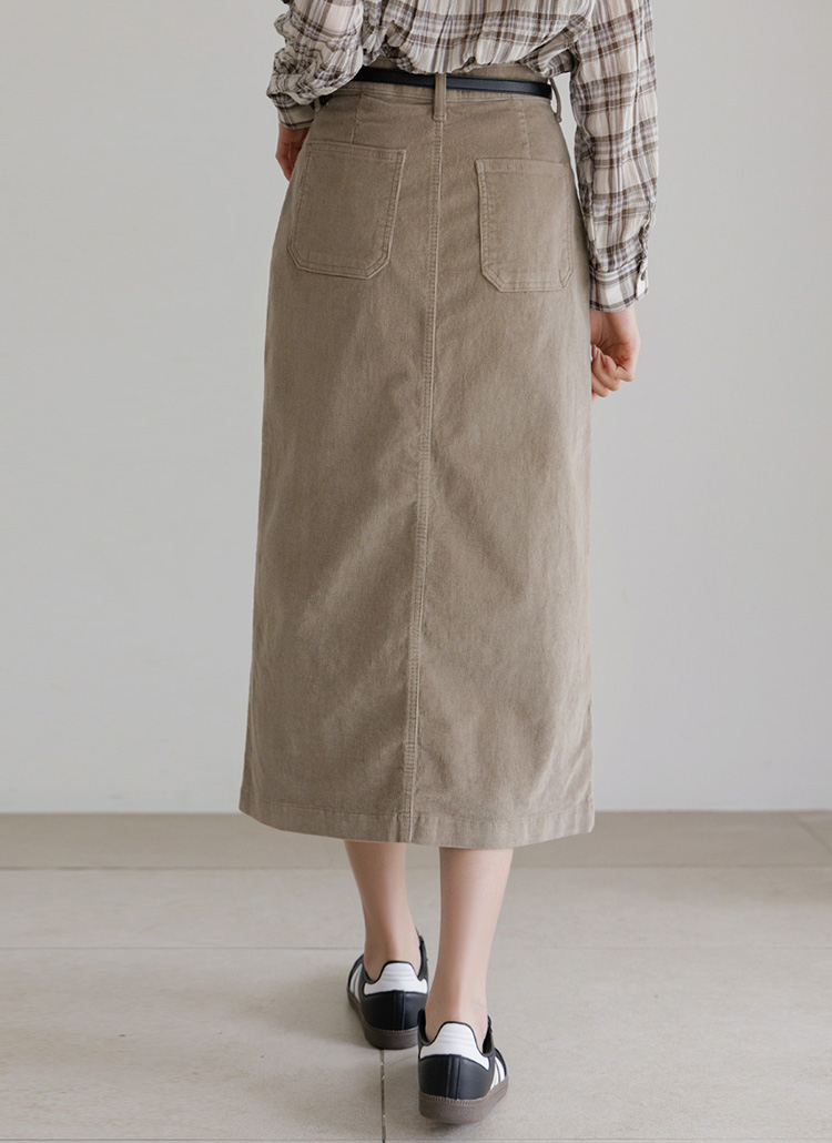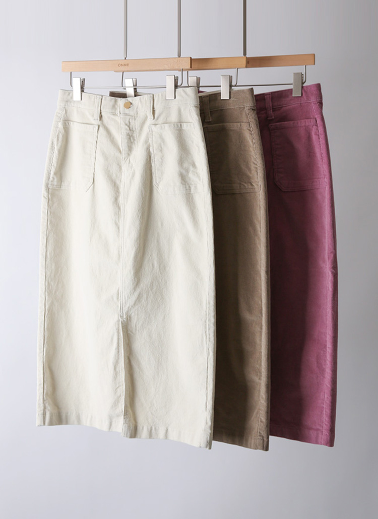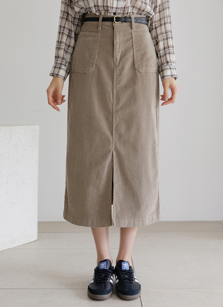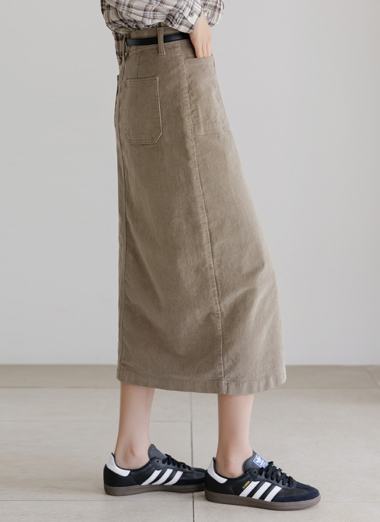 [Casual yet feminine corduroy skirt with a sleek H-line fit, front slit, and pocket detail, perfect for versatile fall and winter styling.]