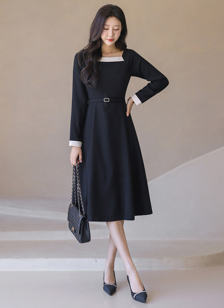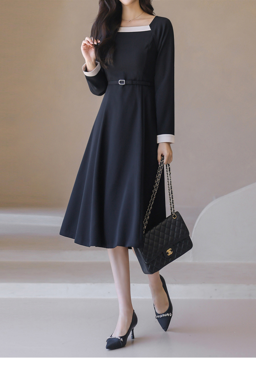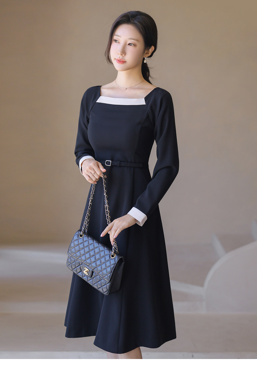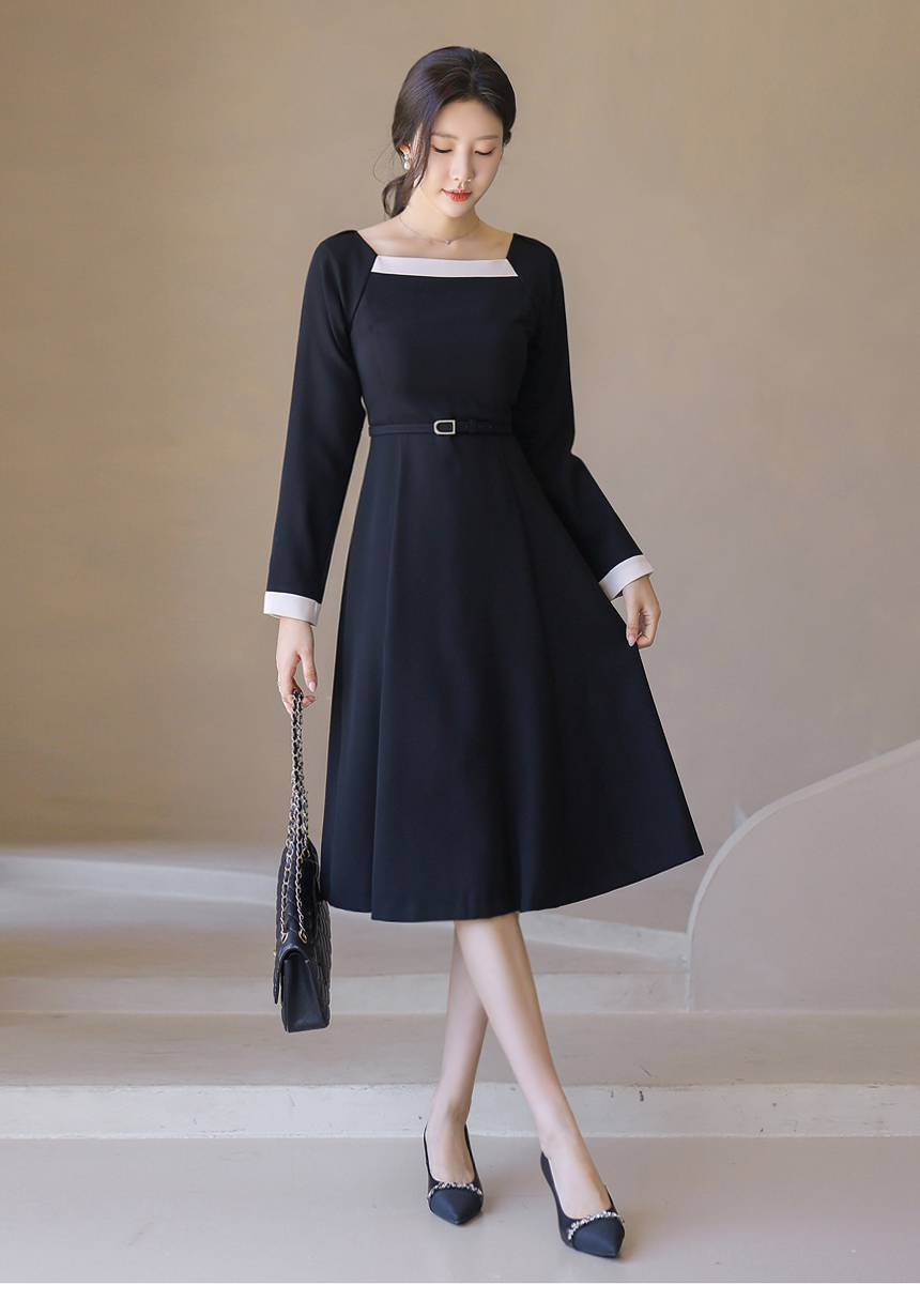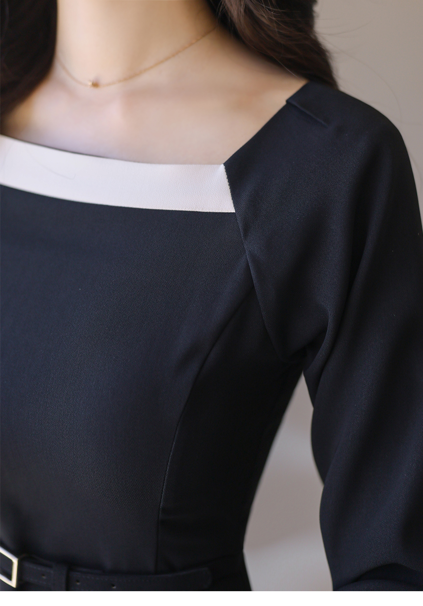 [Classic yet modern, this contrast-trimmed square neck dress with belted waist enhances feminine charm for office, events, or guest looks.]