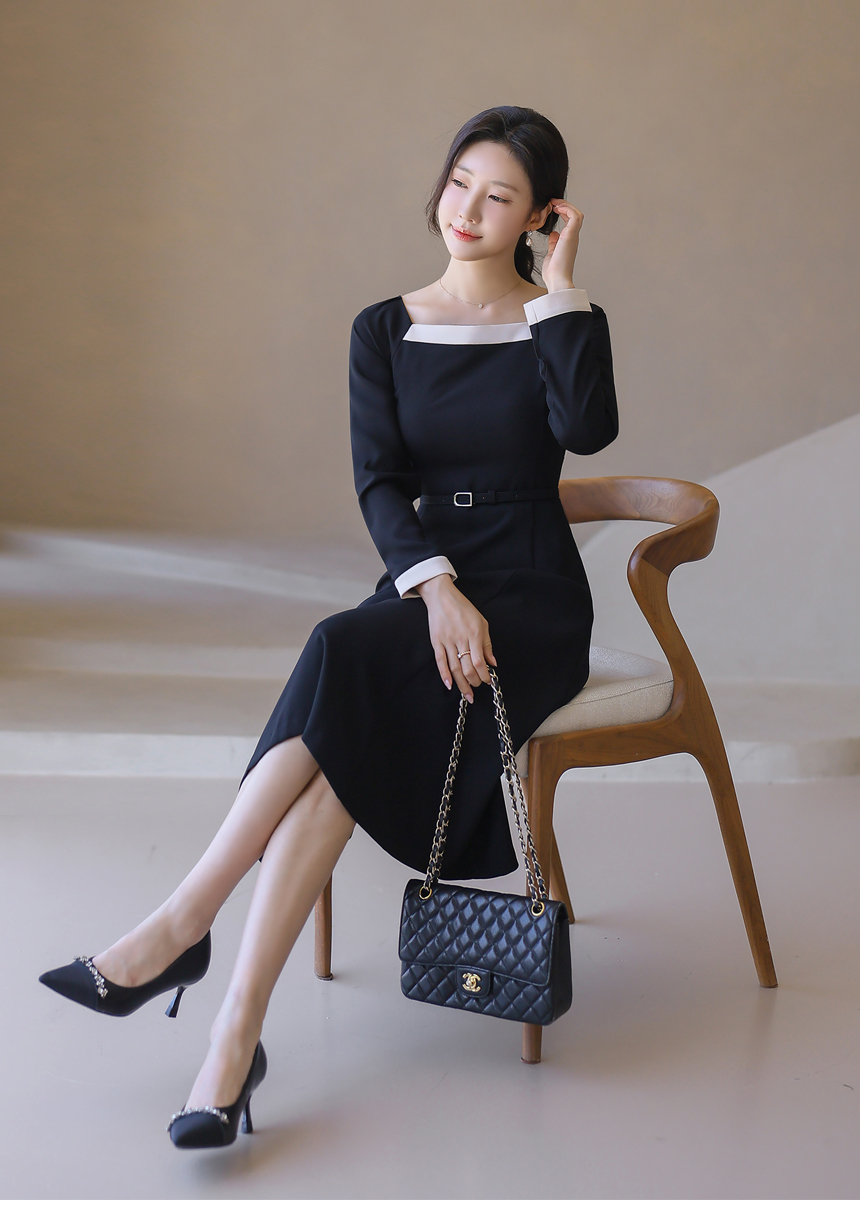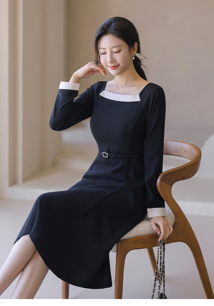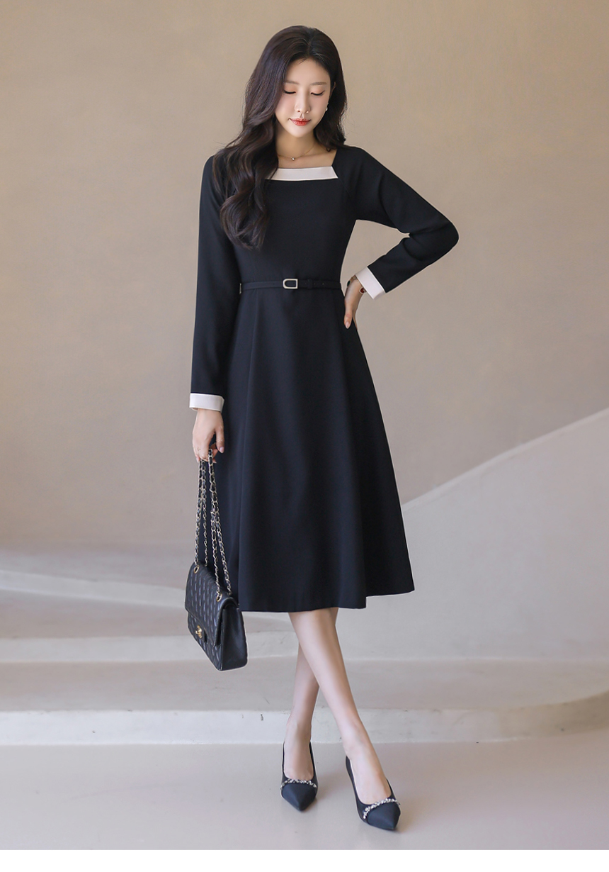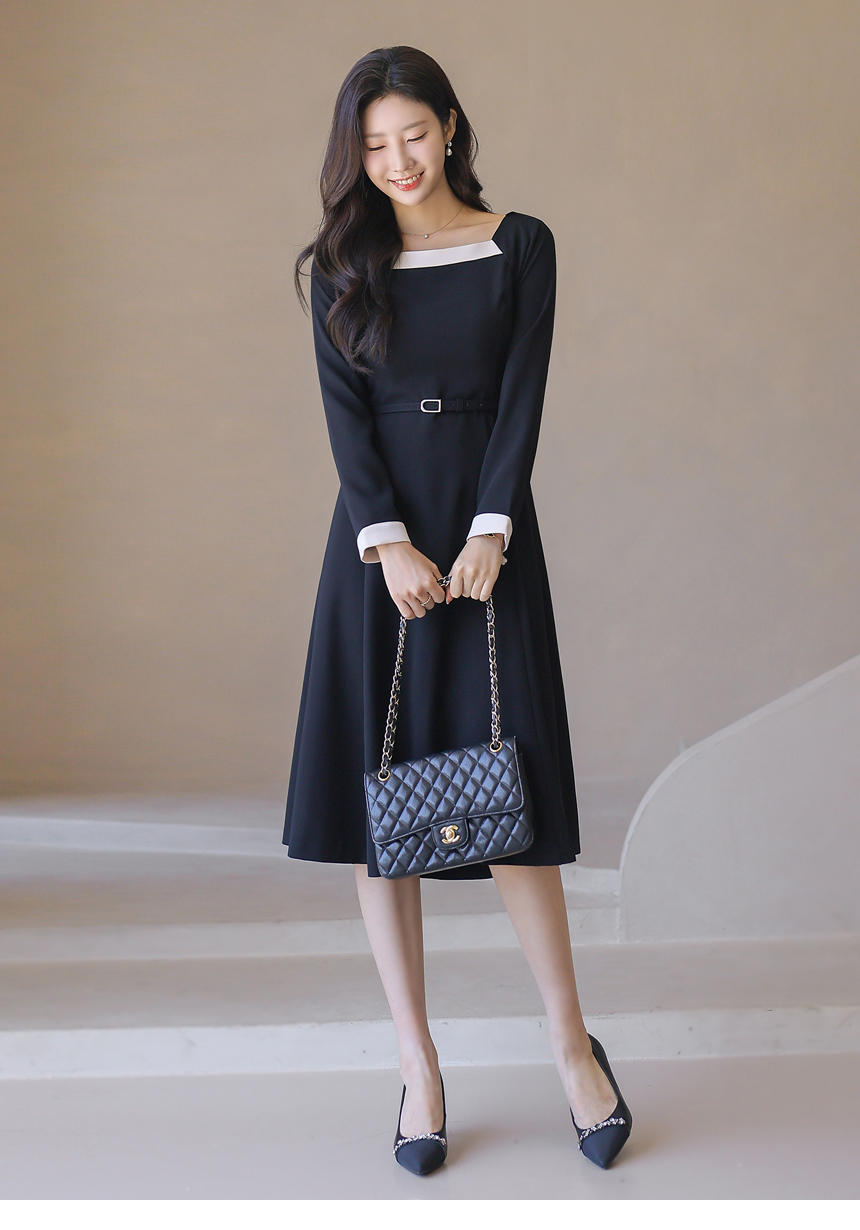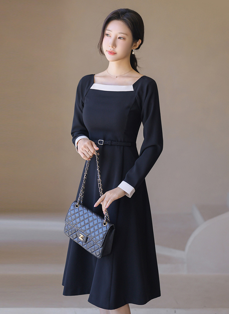[Classic yet modern, this contrast-trimmed square neck dress with belted waist enhances feminine charm for office, events, or guest looks.]