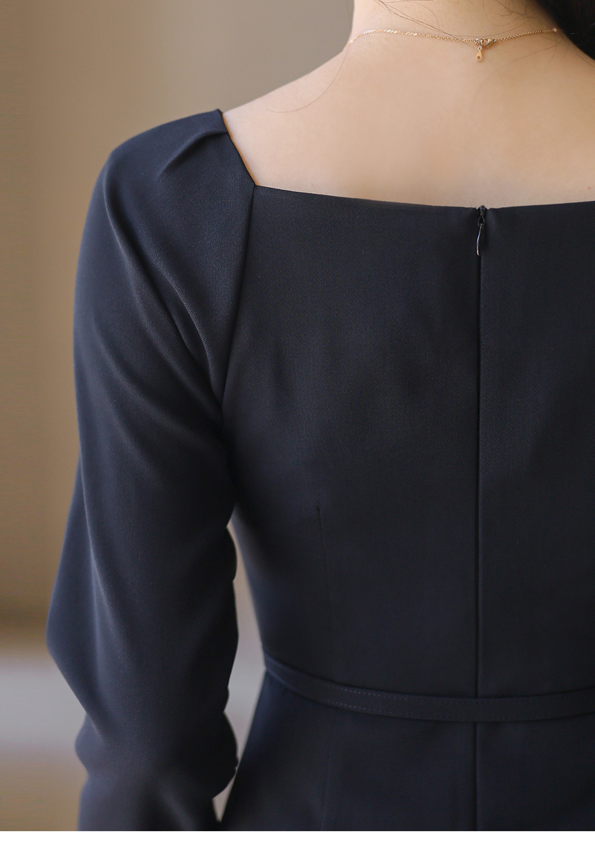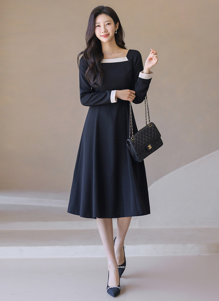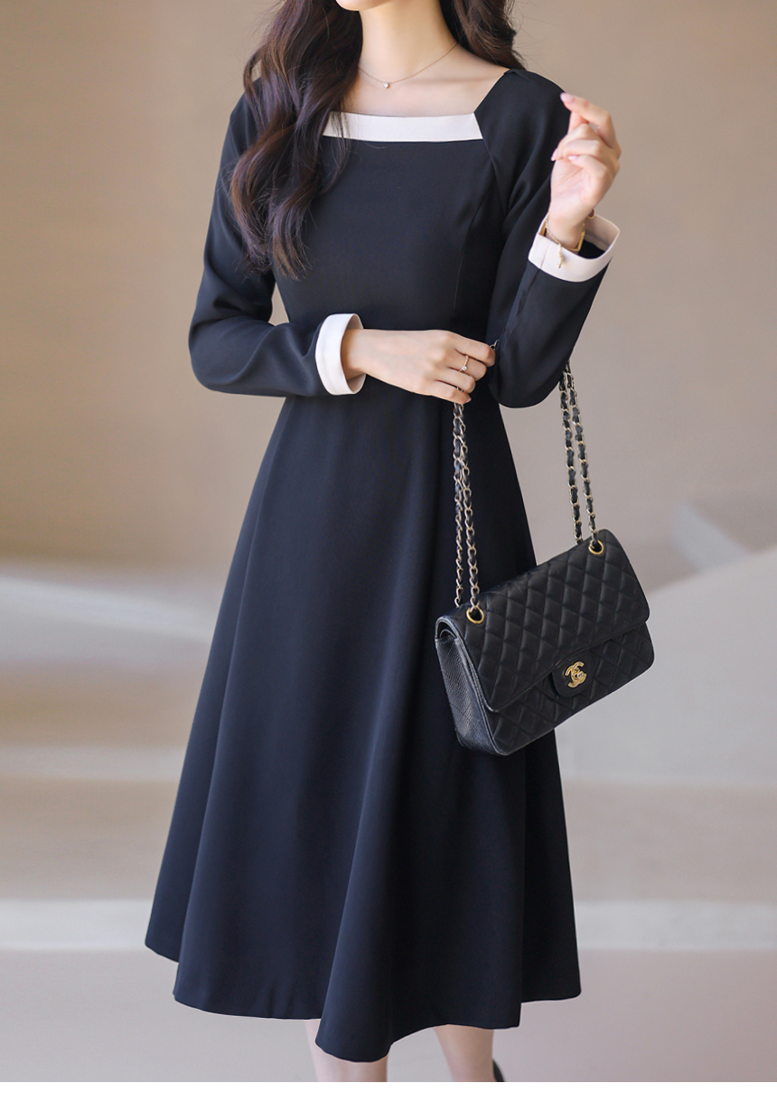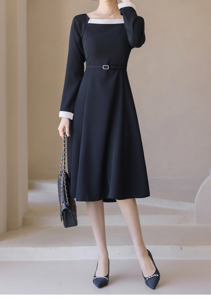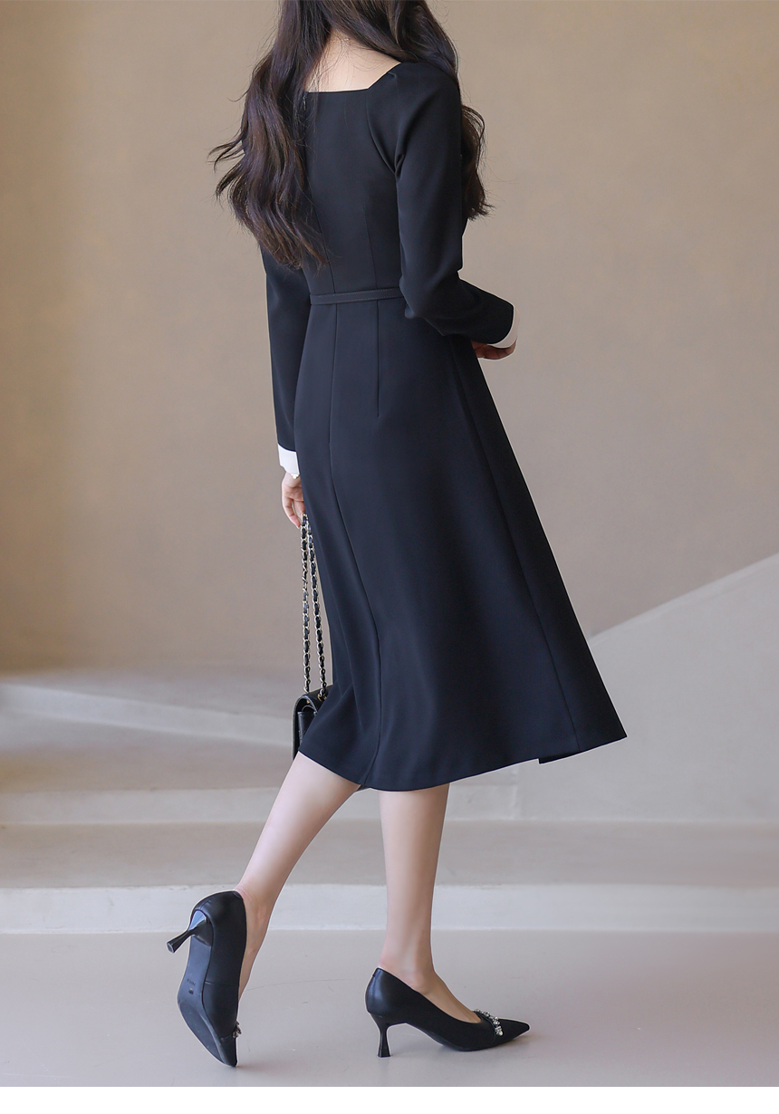 [Classic yet modern, this contrast-trimmed square neck dress with belted waist enhances feminine charm for office, events, or guest looks.]