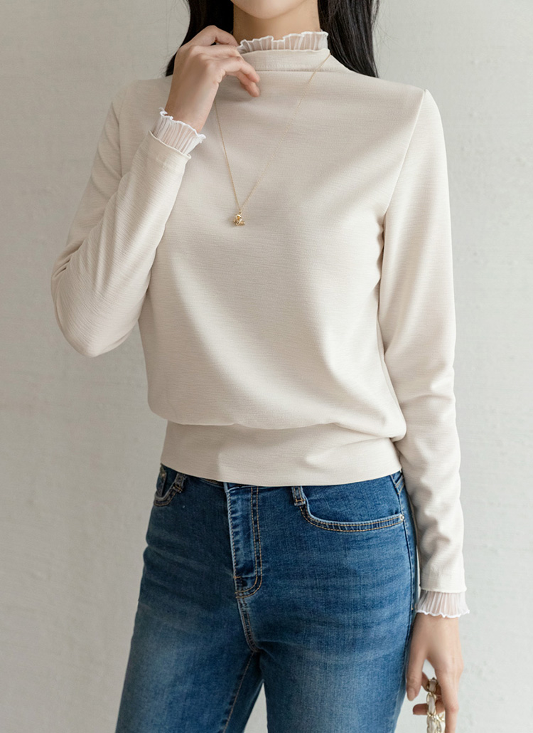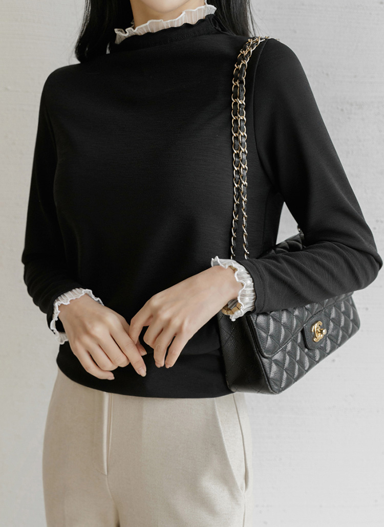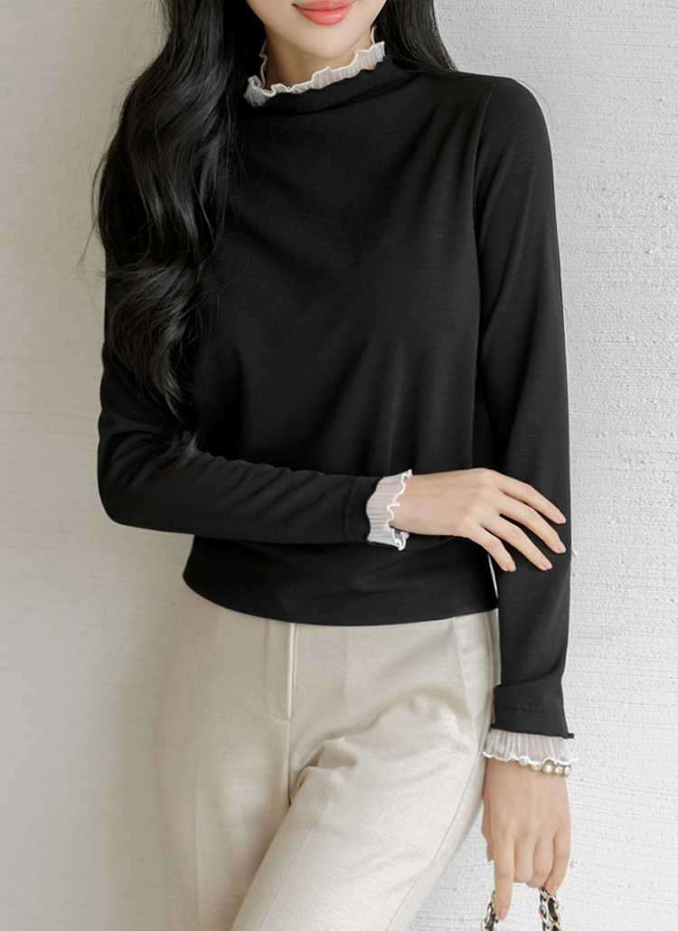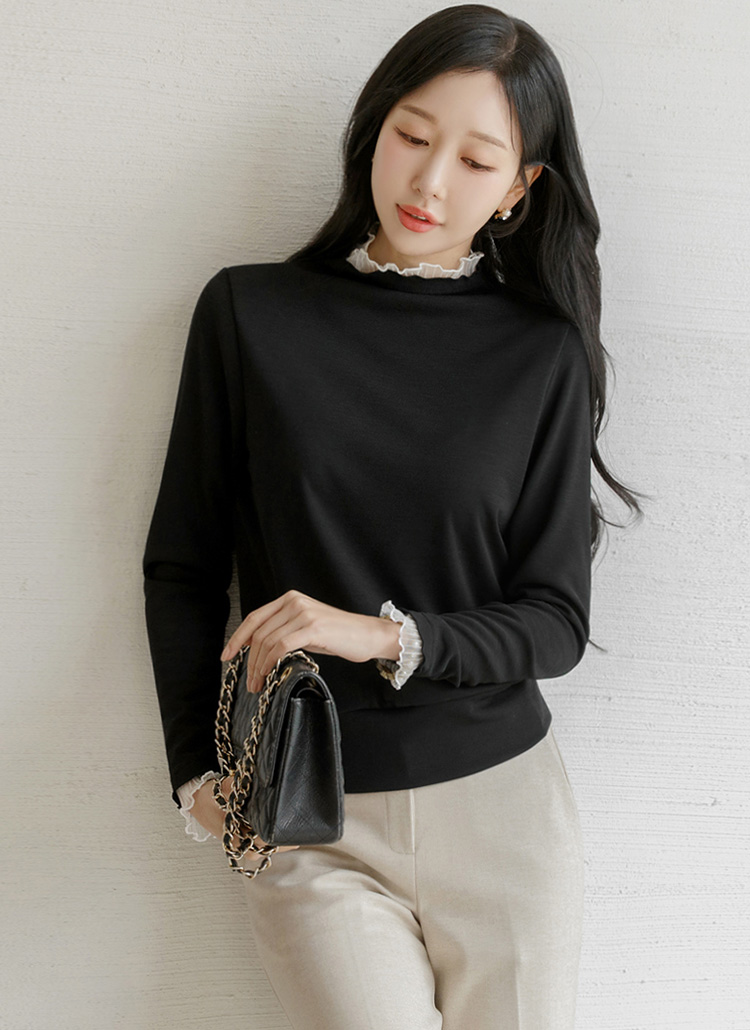 [LouisAngel] Metallic Lace Trim Mock Neck Top