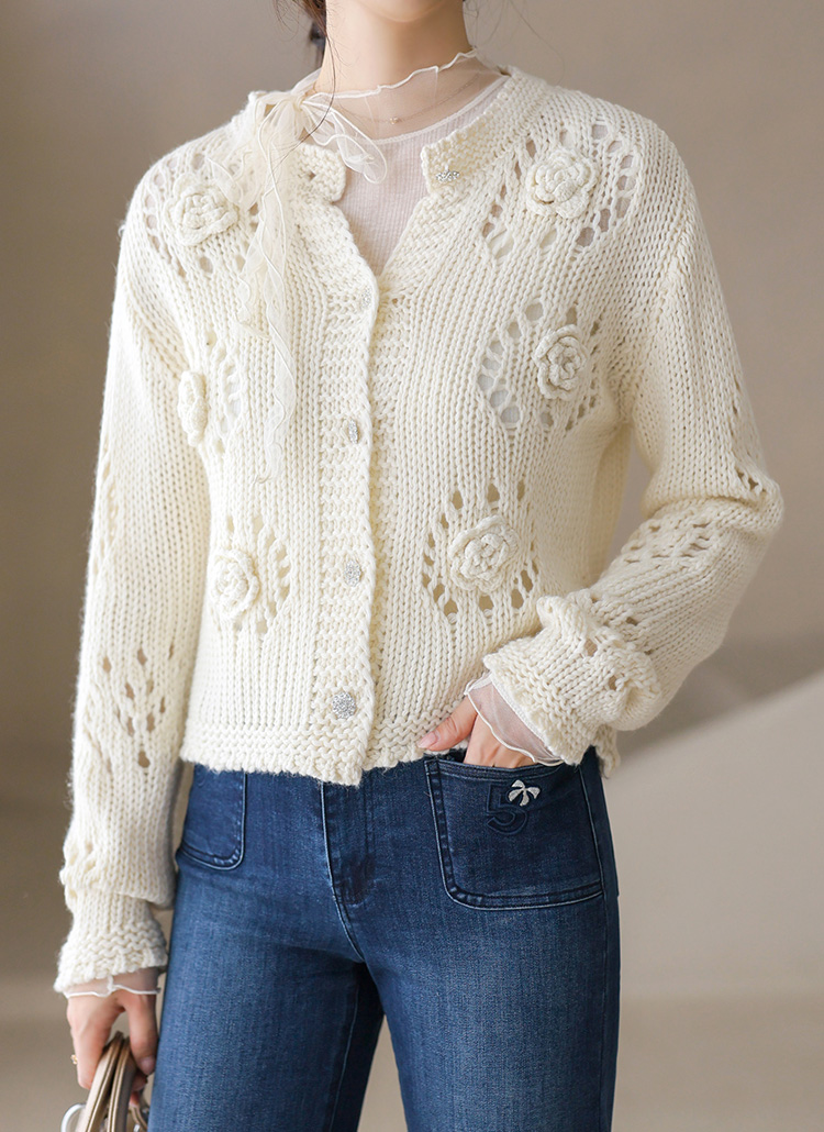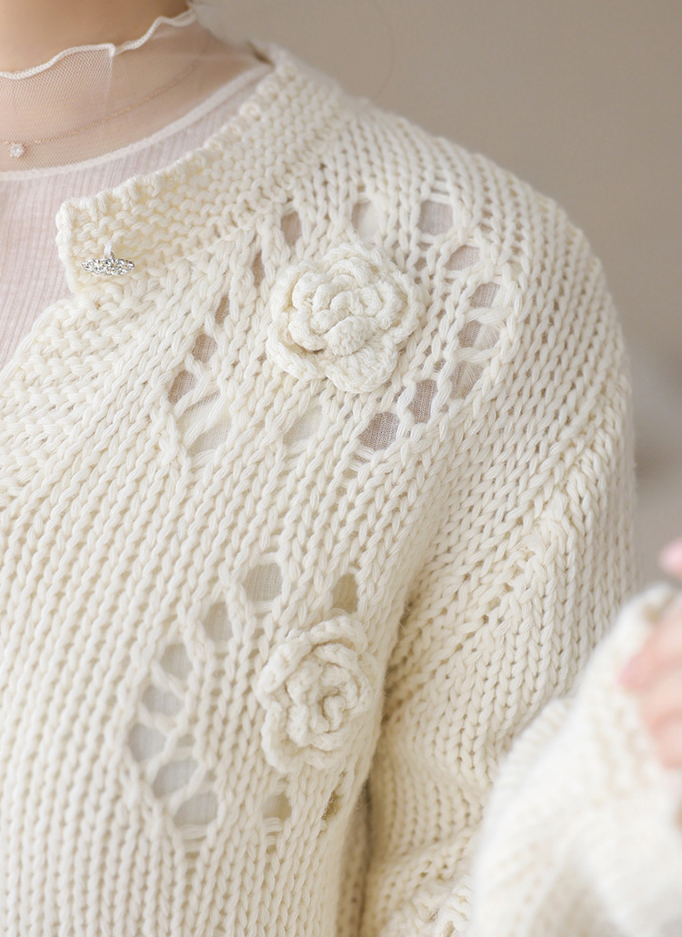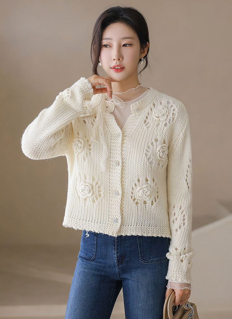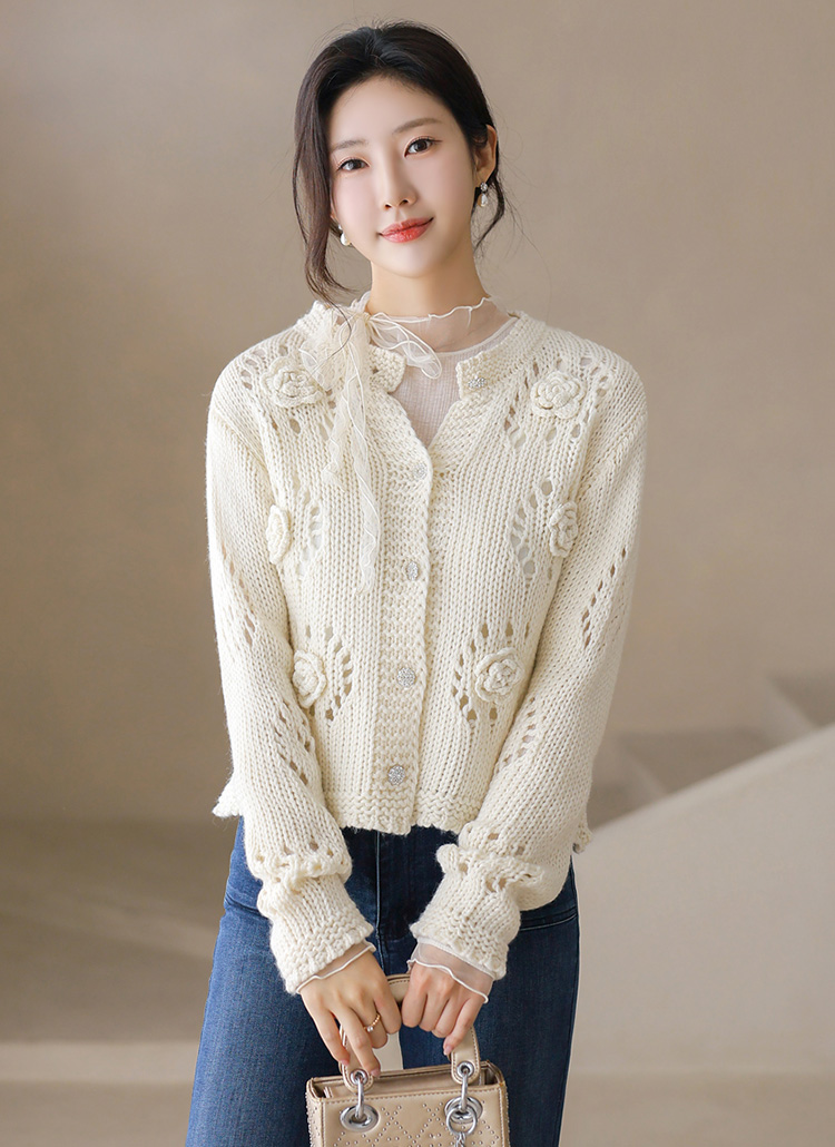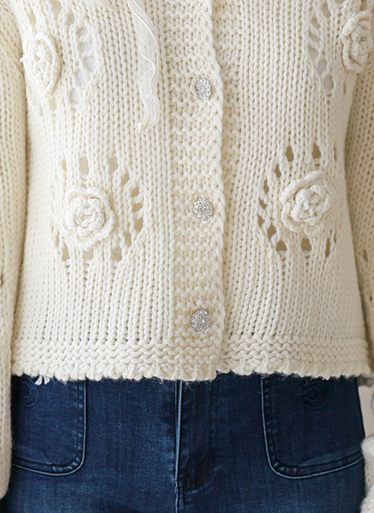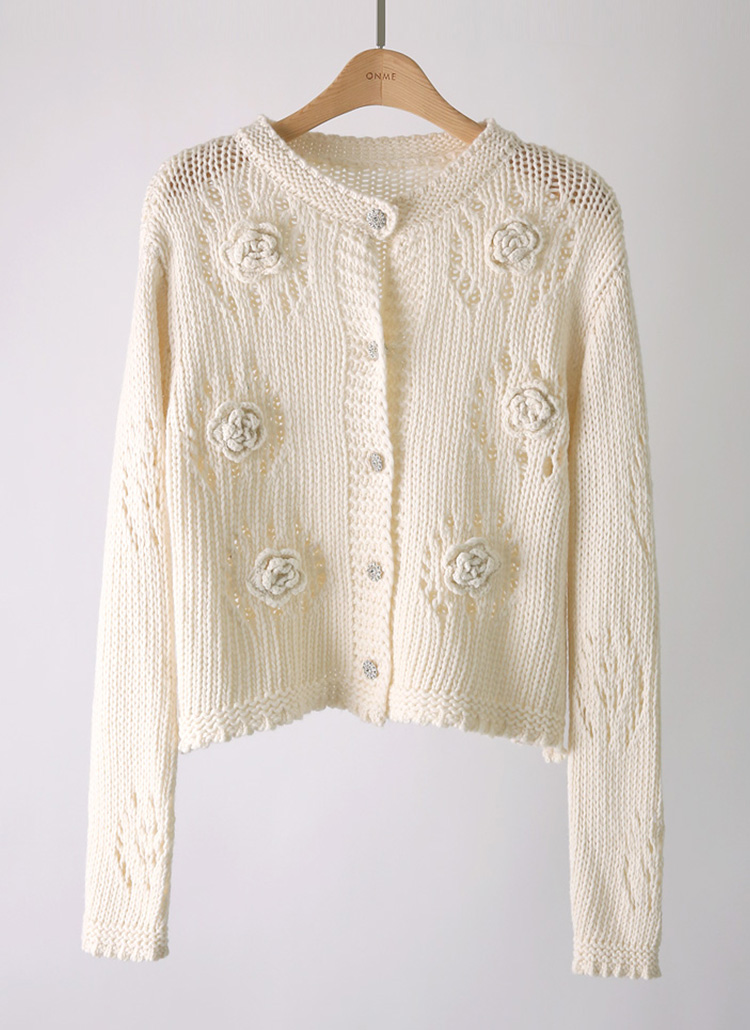 [Delicate knit cardigan featuring rosette accents and glittering jewel buttons. A cozy yet stylish layer for casual to dressy looks.]