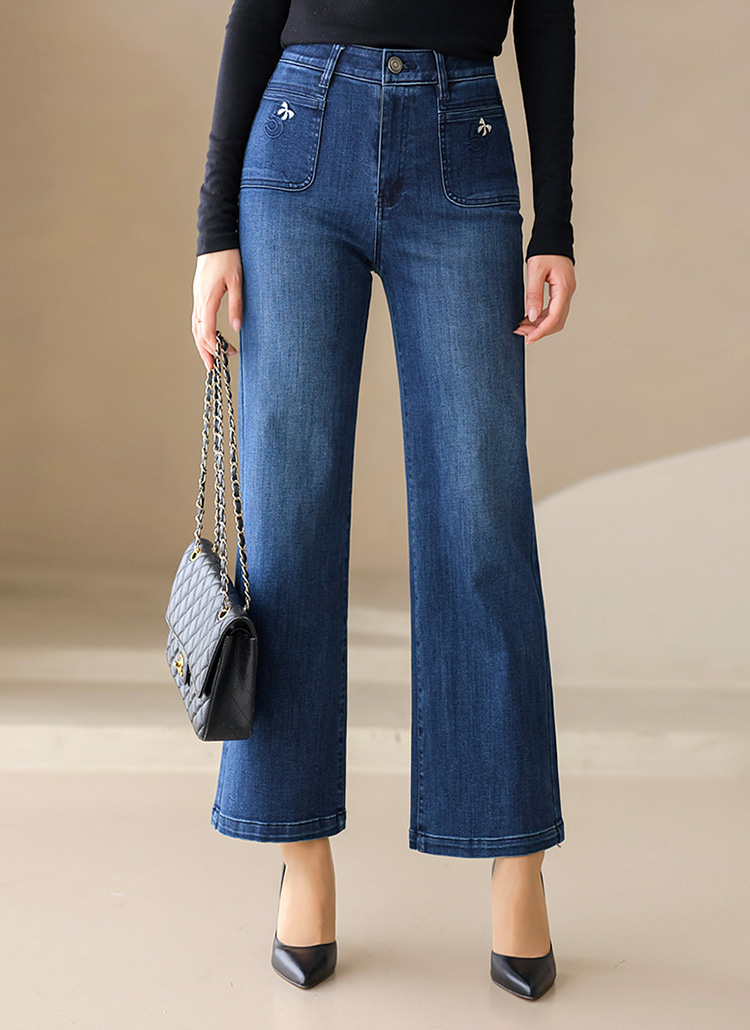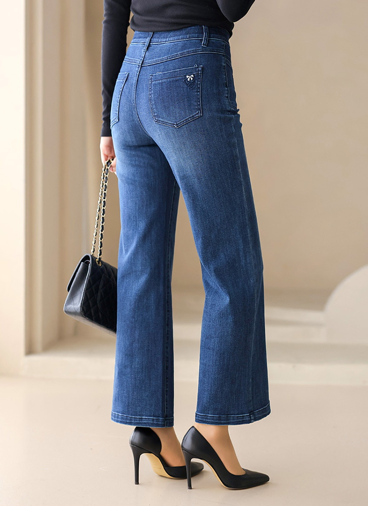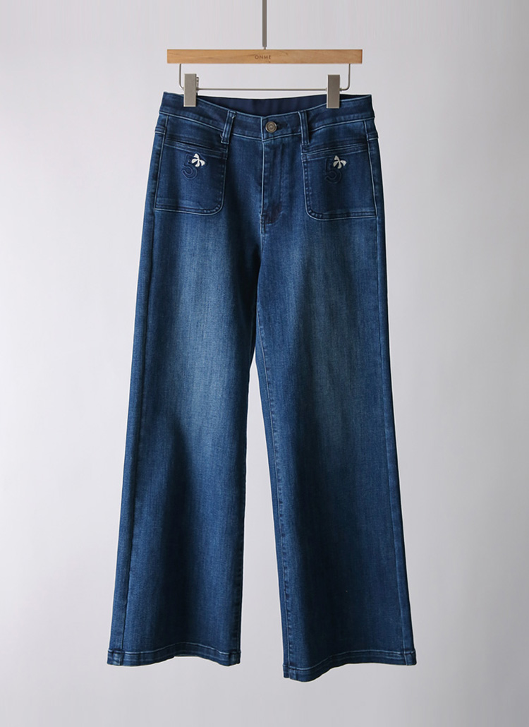 화이트 미니리본 자수가 포인트로 들어간 세미 와이드 데님 팬츠로
