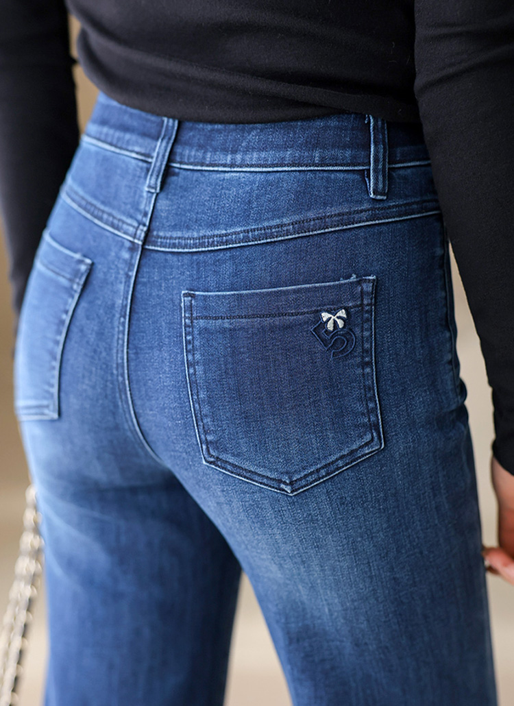 [Denim pants with mini ribbon embroidery front and back. Hidden waistband and stretch fabric create a flattering yet comfy silhouette.]