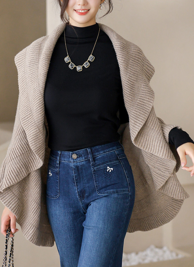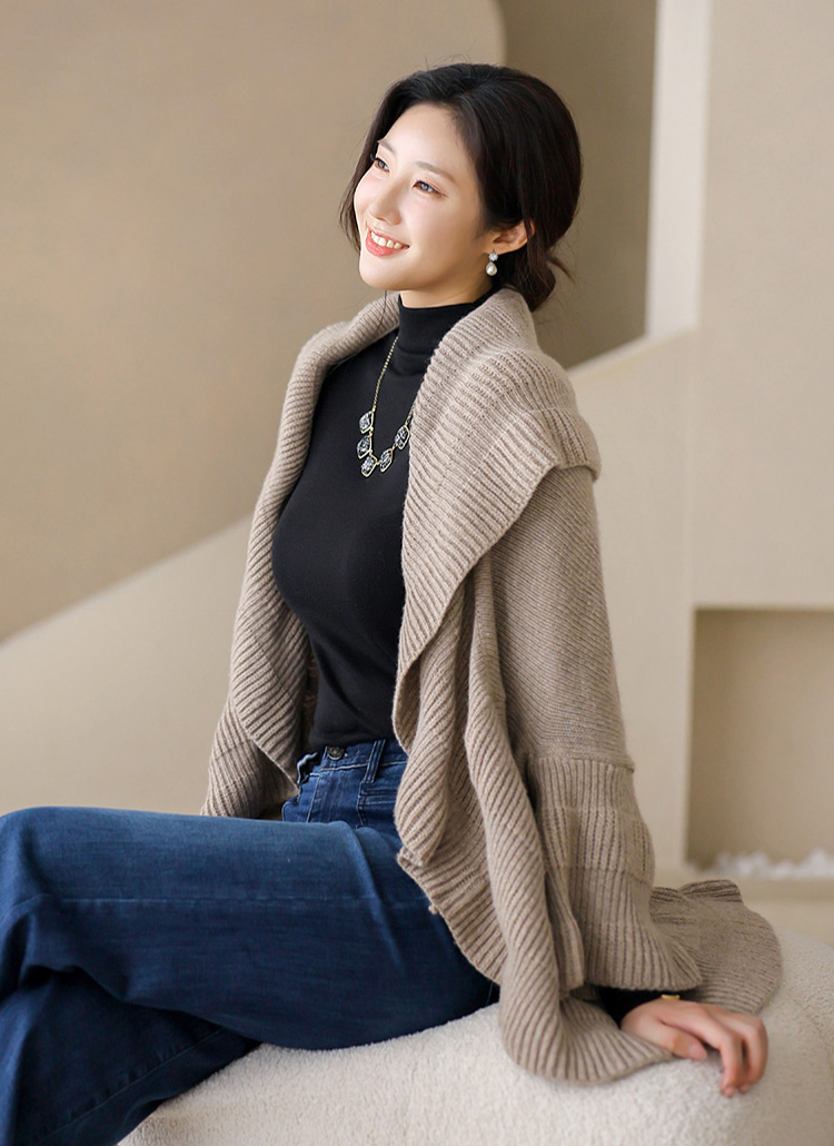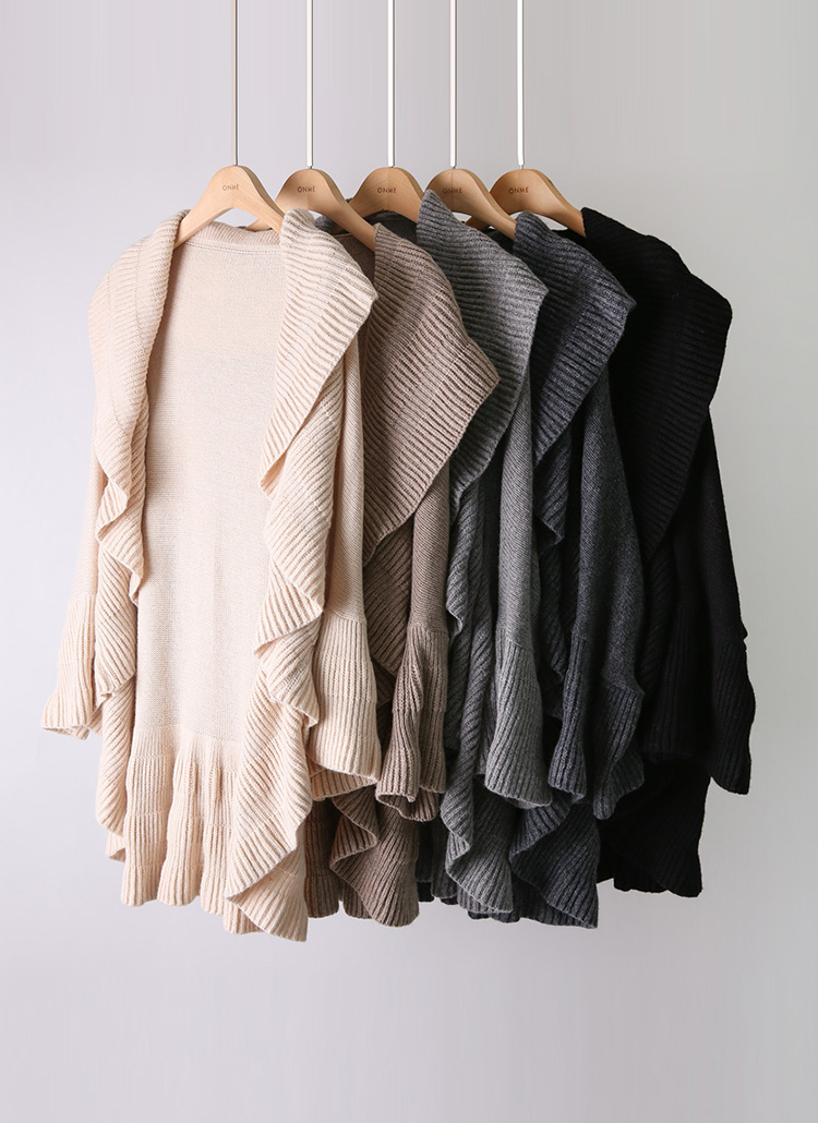 [Elegant open-front knit cardigan with flowing ruffle edges. Wool-blend warmth and relaxed fit make it a versatile layering piece.]
