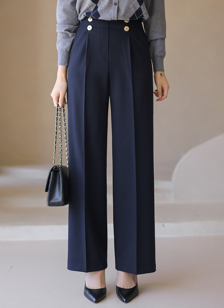 [High-rise design with gleaming gold buttons and a graceful wide fit. Polished, elongating silhouette perfect for office or dinner.]