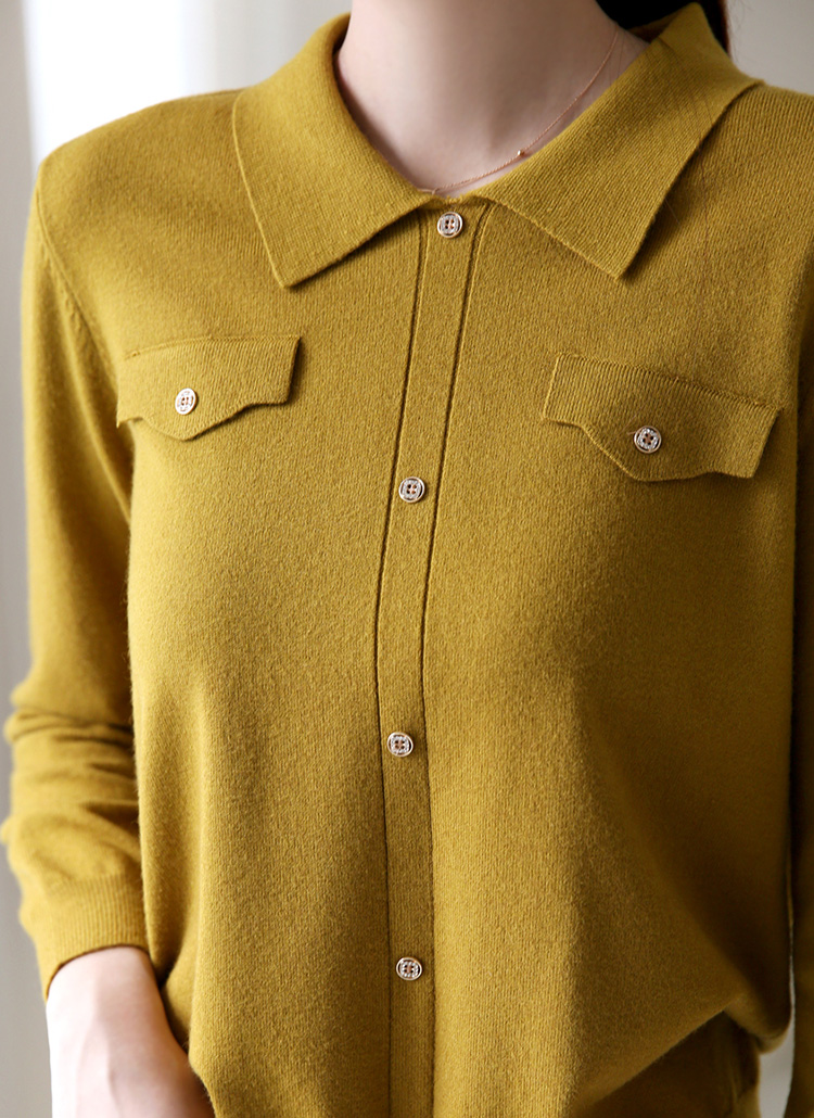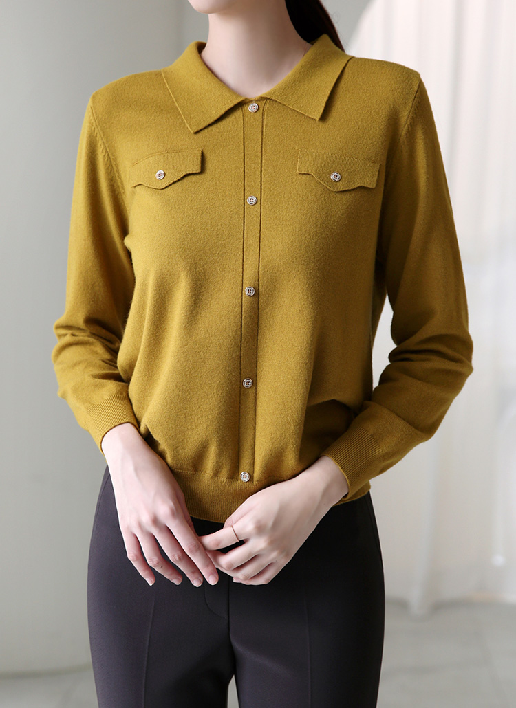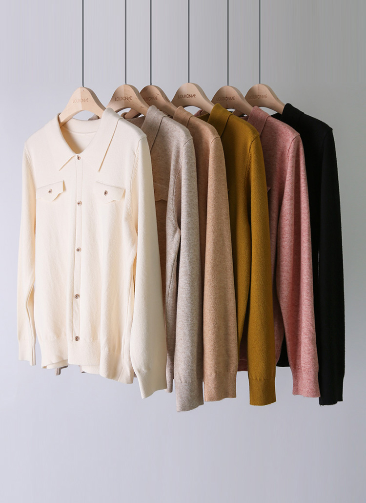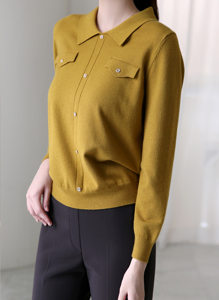 [Soft knit top with a classic collar, front flaps, and gold buttons for an elegant yet effortless daily look. Cozy from fall to winter.]