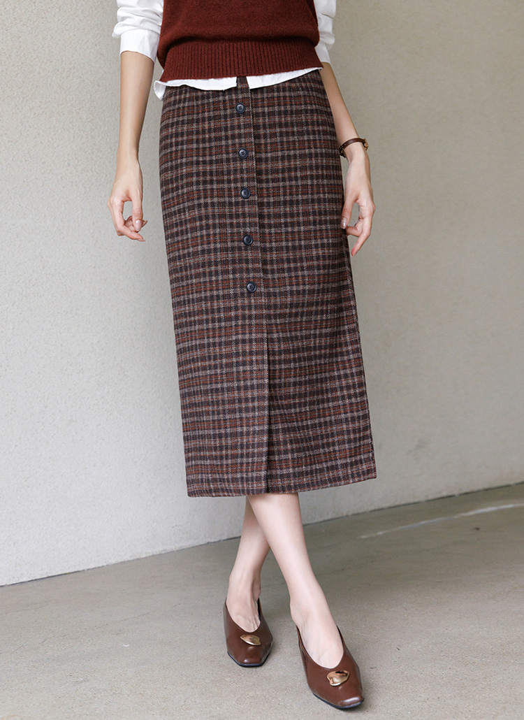[Featuring a clean H-line, front button design and front slit, this wool-blend skirt offers refined charm with all-day comfort and seasonal warmth.]