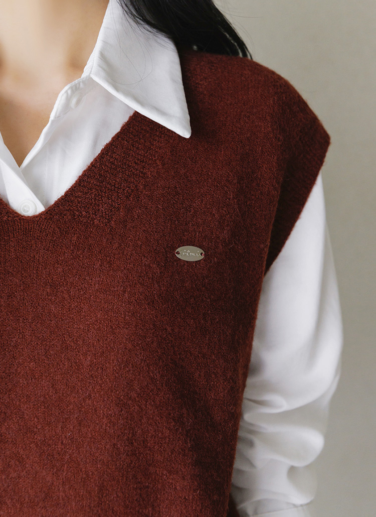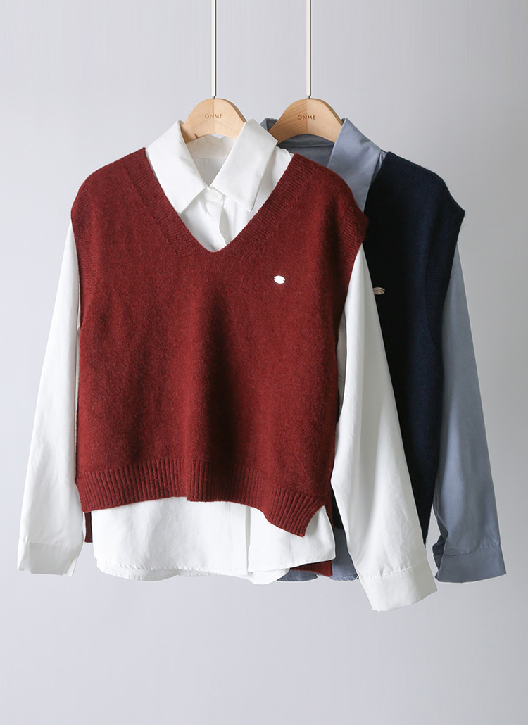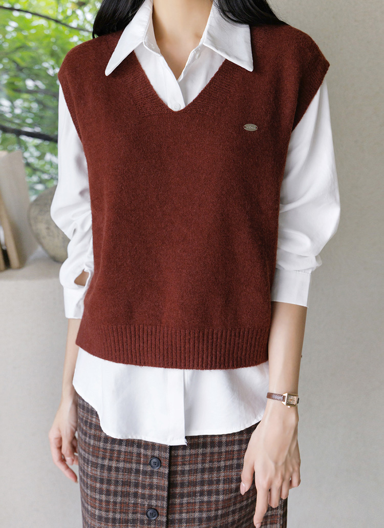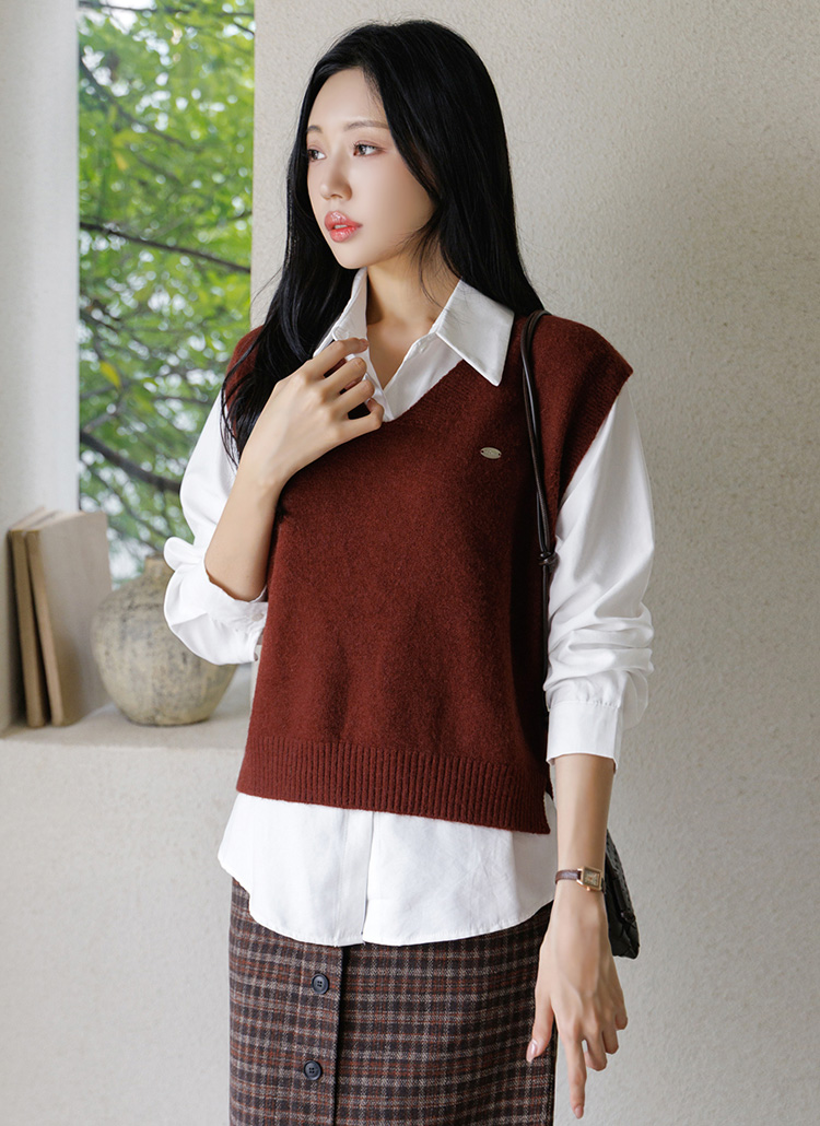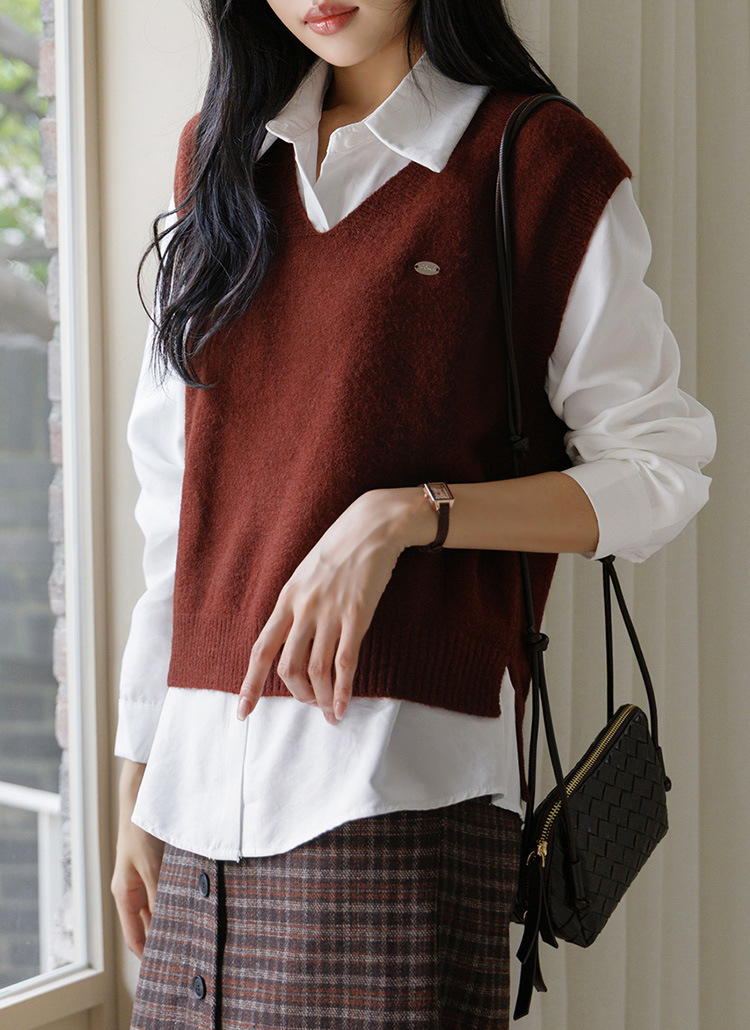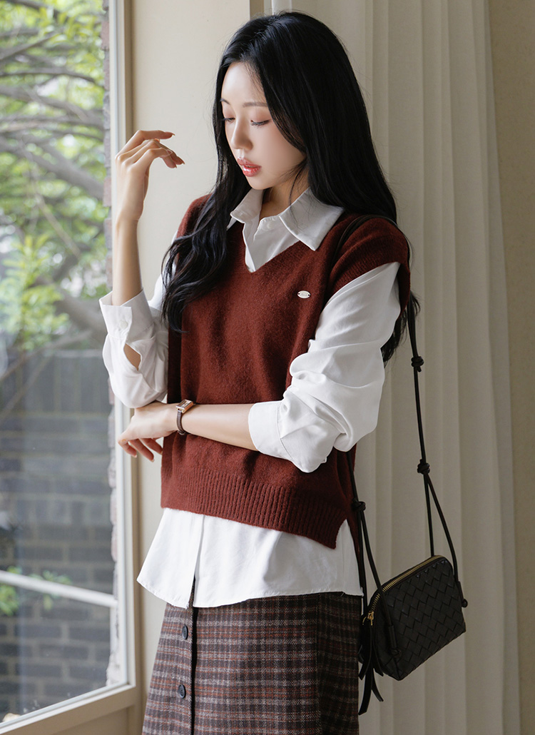 [A stylish F/W duo—warm knit vest with pendant detail and structured shirt. Effortlessly polished, perfect for office or casual days.]
